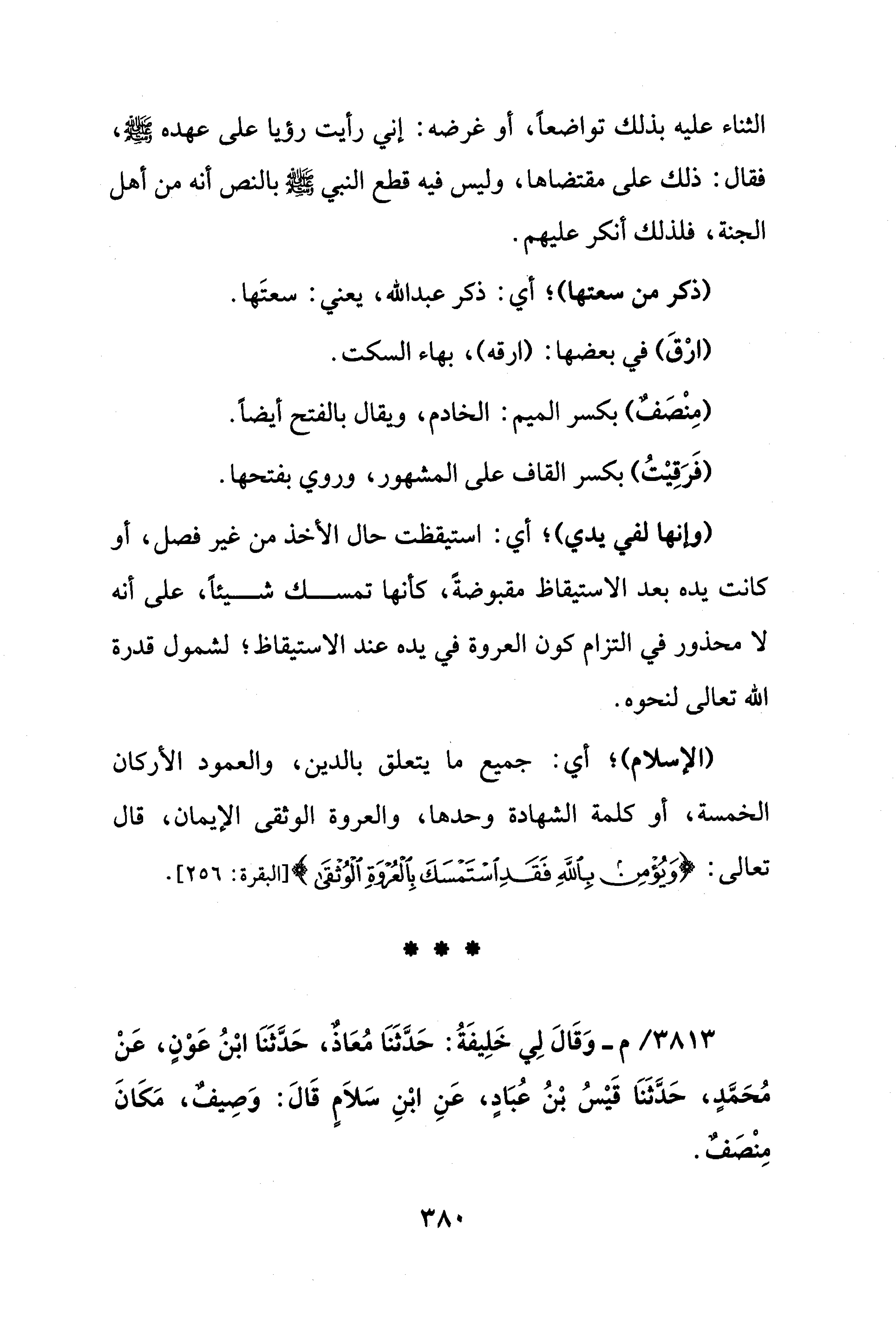 (الإسلام)؛ أي: جميع ما يتعلّق بالدين، والعمود الأركان الخمسة، أو كلمة الشّهادة وحدها، والعروة الوثقى الإيمان، قال تعالى: {وَيُؤْمِنْ بِاللَّهِ فَقَدِ اسْتَمْسَكَ بِالْعُرْوَةِ الْوُثْقَى} [البقرة: 256].