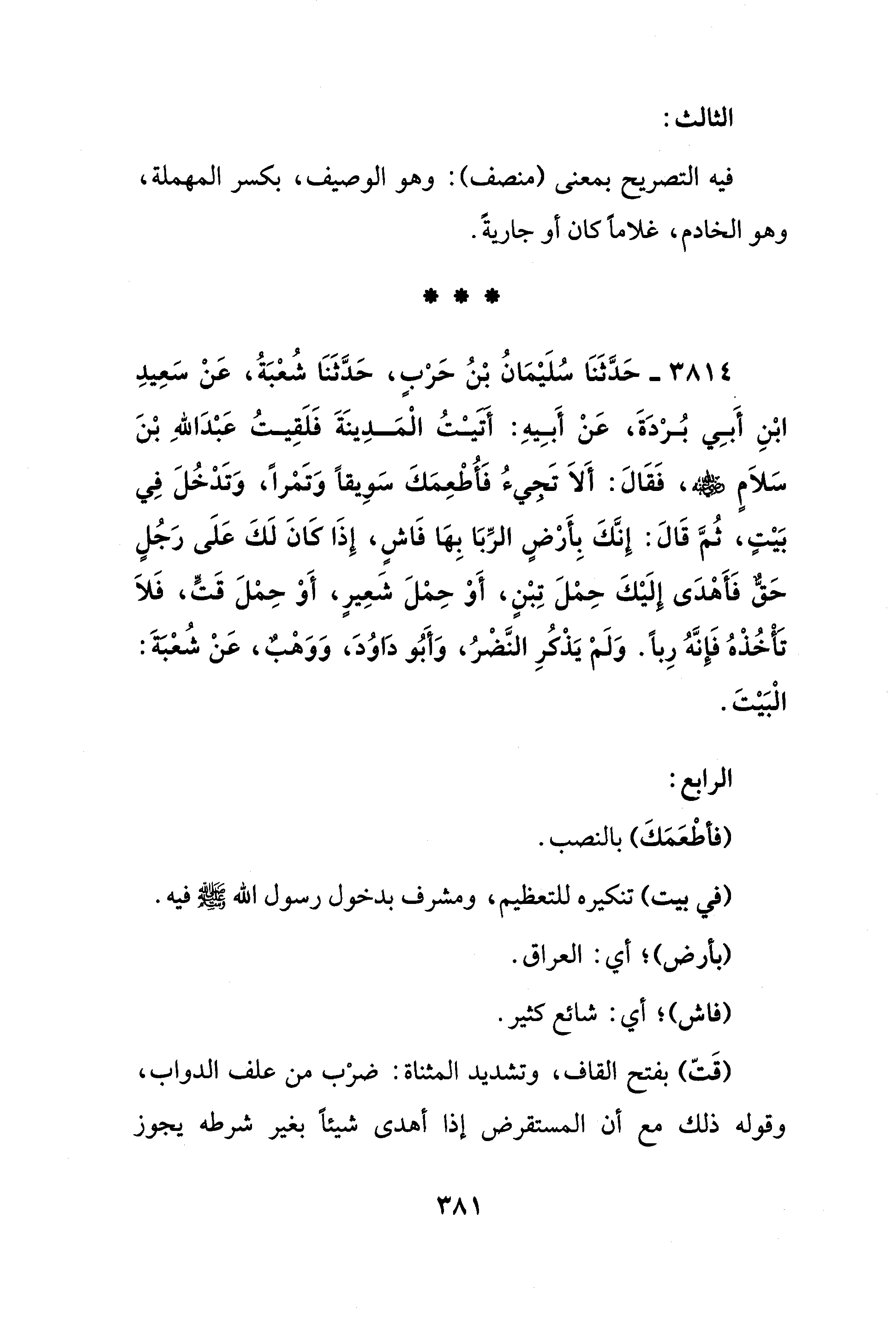 3814 - حَدَّثَنَا سُلَيْمَانُ بْنُ حَرْبٍ، حَدَّثَنَا شُعْبَةُ، عَنْ سَعِيدِ ابْنِ أَبِي بُرْدَةَ، عَنْ أَبِيهِ: أتيْتُ الْمَدِينَةَ فَلَقِيتُ عَبْدَ اللهِ بْنَ سَلَامٍ - رضي الله عنه -، فَقَالَ: أَلَا تَجيءُ فَأُطْعِمَكَ سَوِيقًا وَتَمْرًا، وَتَدْخُلَ فِي بَيْتٍ، ثُمَّ قَالَ: إِنَّكَ بِأَرْضٍ الرِّبَا بِهَا فَاشٍ، إِذَا كَانَ لَكَ عَلَى رَجُلٍ حَقٌّ فَأَهْدَى إلَيْكَ حِمْلَ تِبْنٍ، أَوْ حِمْلَ شَعِيرٍ، أَوْ حِمْلَ قَتٍّ، فَلَا تَأْخُذْهُ فَإِنَّهُ رِبًا. وَلَمْ يَذْكُرِ النَّضْرُ، وَأَبُو دَاوُدَ، وَوَهْبٌ، عَنْ شُعْبَةَ: الْبَيْتَ.