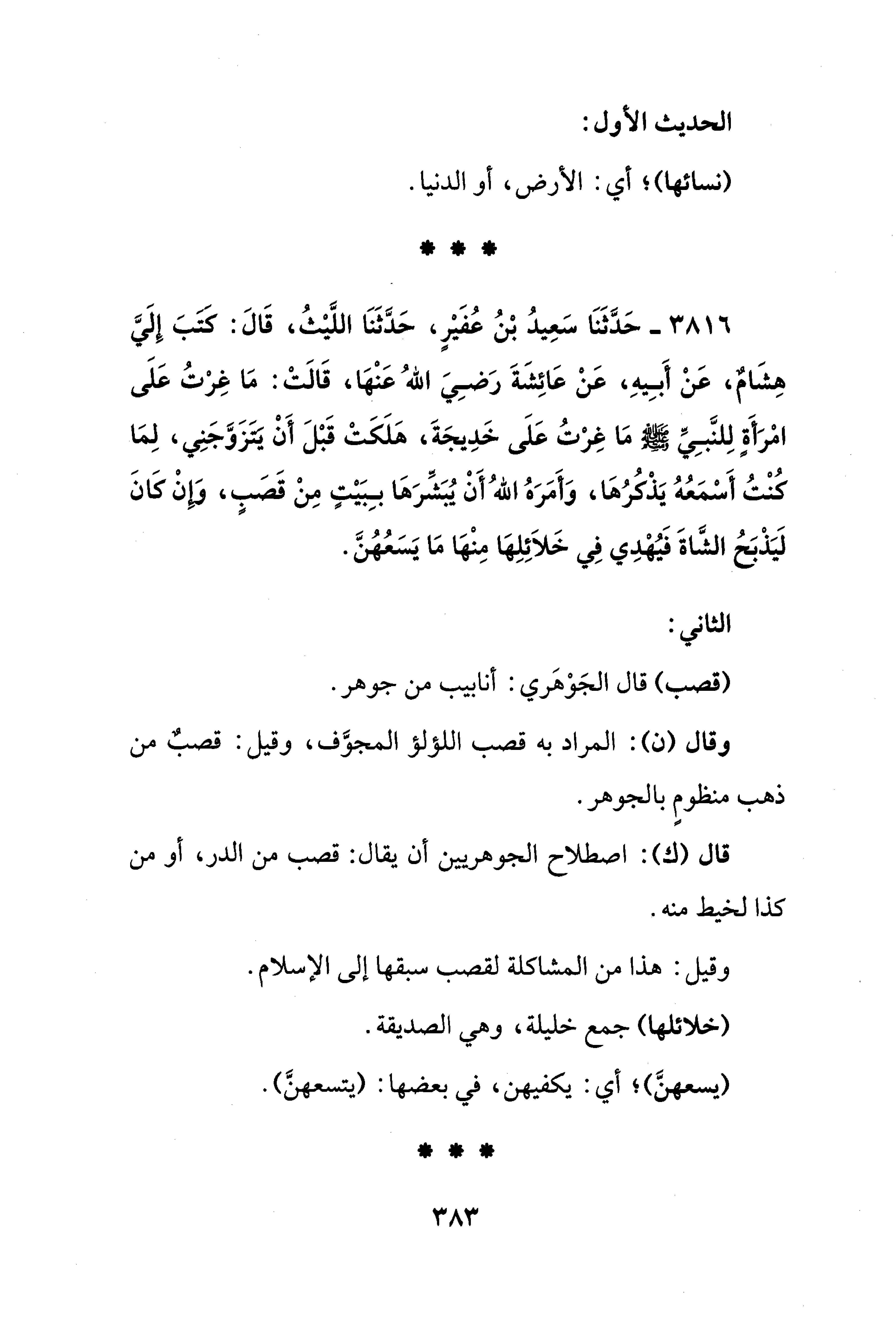 3816 - حَدَّثَنَا سَعِيدُ بْنُ عُفَيْرٍ، حَدَّثَنَا اللَّيْثُ، قَالَ: كَتَبَ إِلَيَّ هِشَامٌ، عَنْ أَبِيهِ، عَنْ عَائِشَةَ رَضِيَ اللهُ عَنْهَا، قَالَتْ: مَا غِرْتُ عَلَى امْرَأَةٍ لِلنَّبِيِّ - صلى الله عليه وسلم - مَا غِرْتُ عَلَى خَدِيجَةَ، هَلَكَتْ قَبْلَ أَنْ يَتَزَوَّجَنِي، لِمَا كُنْتُ أَسْمَعُهُ يَذْكُرُهَا، وَأَمَرَهُ اللهُ أَنْ يُبَشِّرَهَا بِبَيْتٍ مِنْ قَصَبٍ، وَإِنْ كَانَ لَيَذْبَحُ الشَّاةَ فَيُهْدِي فِي خَلَائِلِهَا مِنْهَا مَا يَسَعُهُنَّ.