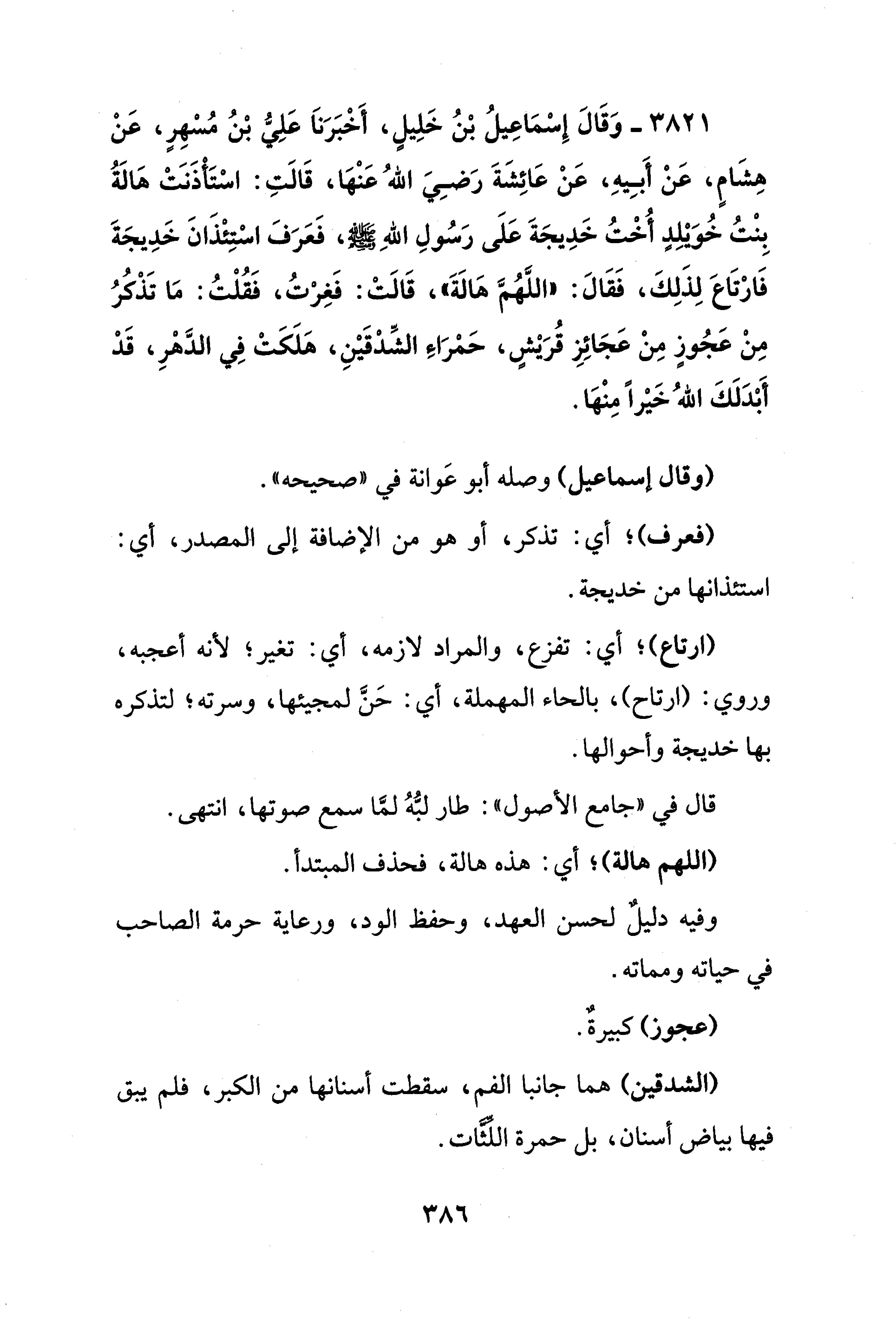 3821 - وَقَالَ إِسْمَاعِيلُ بْنُ خَلِيلٍ، أَخْبَرَنَا عَلِيُّ بْنُ مُسْهِرٍ، عَنْ هِشَامٍ، عَنْ أَبِيهِ، عَنْ عَائِشَةَ رَضِيَ اللهُ عَنْهَا، قَالَتِ: اسْتَأْذَنَتْ هَالَةُ بِنْتُ خُويلِدٍ أُخْتُ خَدِيجَةَ عَلَى رَسُولِ اللهِ - صلى الله عليه وسلم -، فَعَرَفَ اسْتِئْذَانَ خَدِيجَةَ فَارْتَاعَ لِذَلِكَ، فَقَالَ: "اللهُمَّ هَالَةَ"، قَالَتْ: فَغِرْتُ، فَقُلْتُ: مَا تَذْكُرُ مِنْ عَجُوزٍ مِنْ عَجَائِزِ قُرَيشٍ، حَمْرَاءَ الشِّدْقَيْنِ، هَلَكَتْ فِي الدَّهْرِ، قَدْ أَبْدَلَكَ اللهُ خَيْرًا مِنْهَا.