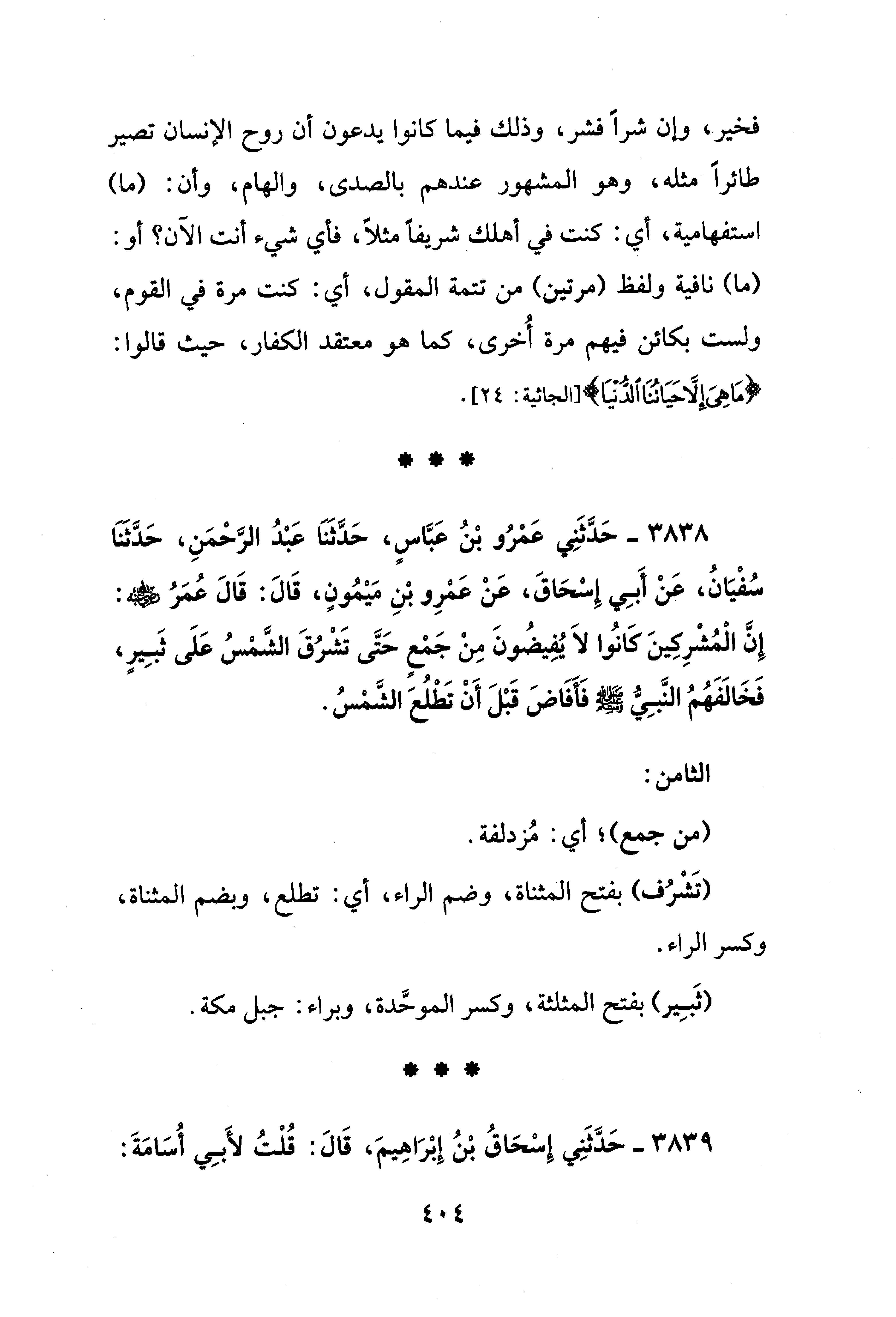 3838 - حَدَّثَنِي عَمْرُو بْنُ عَبَّاسٍ، حَدَّثَنَا عَبْدُ الرَّحْمَنِ، حَدَّثَنَا سُفْيَانُ، عَنْ أَبِي إِسْحَاقَ، عَنْ عَمْرِو بْنِ مَيْمُونٍ، قَالَ: قَالَ عُمَرُ - رضي الله عنه -: إِنَّ الْمُشْرِكِينَ كَانُوا لَا يُفِيضُونَ مِنْ جَمْعٍ حَتَّى تَشْرُقَ الشَّمْسُ عَلَى ثَبِيرٍ، فَخَالَفَهُمُ النَّبِيُّ - صلى الله عليه وسلم - فَأَفَاضَ قَبْلَ أَنْ تَطْلُعَ الشَّمْسُ.