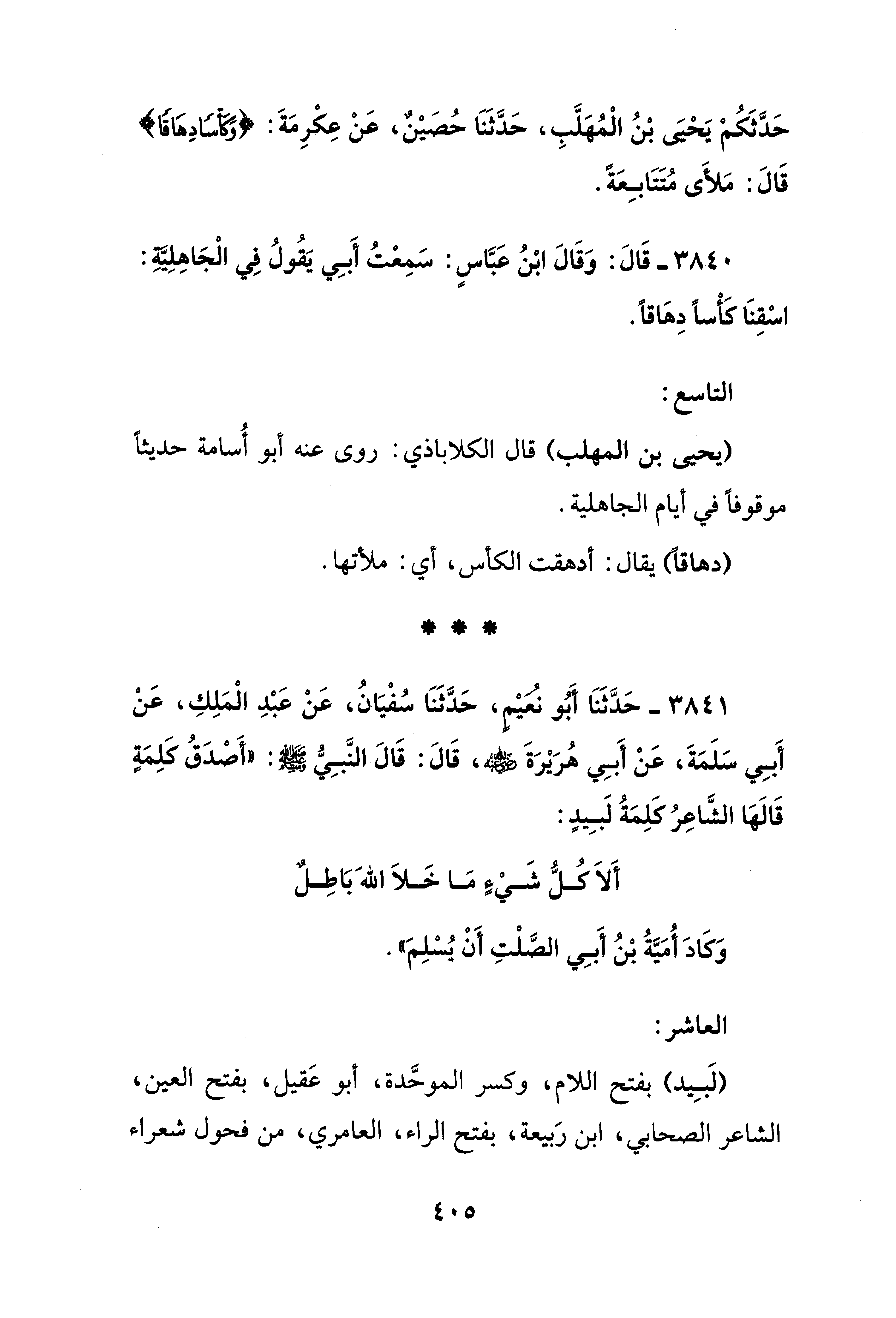 3841 - حَدَّثَنَا أَبُو نُعَيْمٍ، حَدَّثَنَا سُفْيَانُ، عَنْ عَبْدِ الْمَلِكِ، عَنْ أَبِي سَلَمَةَ، عَنْ أَبِي هُرَيْرَةَ - رضي الله عنه -، قَالَ: قَالَ النَّبِيُّ - صلى الله عليه وسلم -: "أَصْدَقُ كَلِمَةٍ قَالَهَا الشَّاعِرُ كَلِمَةُ لَبِيدٍ: