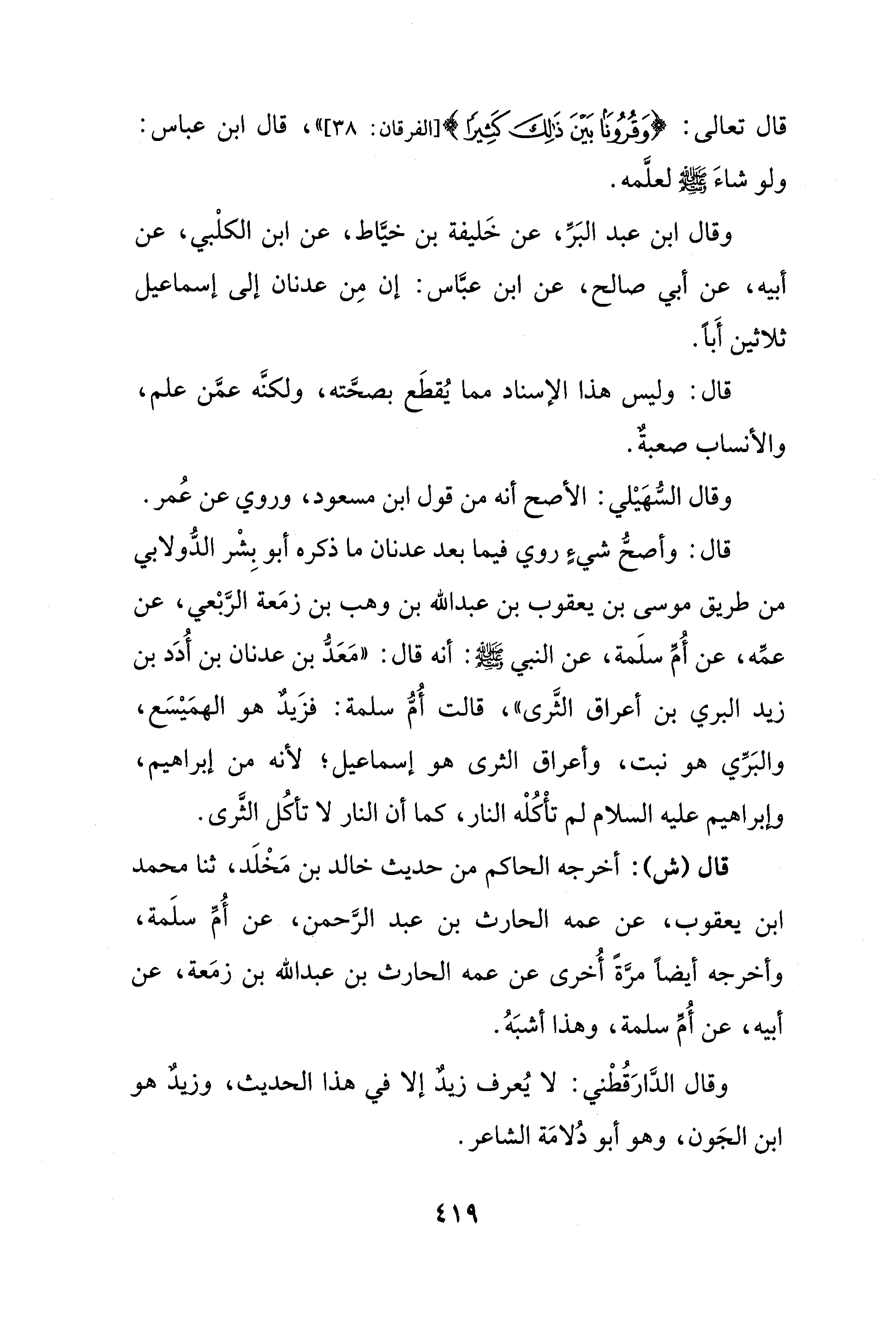 قال: وأصحُّ شيءٍ روي فيما بعد عدنان ما ذكره أبو بِشْر الدُّولابي من طريق موسى بن يعقوب بن عبد الله بن وهب بن زمَعة الرَّبْعي، عن عمِّه، عن أُمِّ سلَمة، عن النَّبيّ - صلى الله عليه وسلم -: أنه قال: "مَعَدّ بن عدنان بن أُدَد بن زيد البري بن أعراق الثَّرى"، قالت أُمُّ سلمة: فزَيدٌ هو الهمَيْسَع، والبَرِّي هو نبت، وأعراق الثرى هو إسماعيل؛ لأنه من إبراهيم، وإبراهيم -عليه السّلام- لم تأْكُلْه النّار، كما أن النّار لا تأكُل الثَّرى.