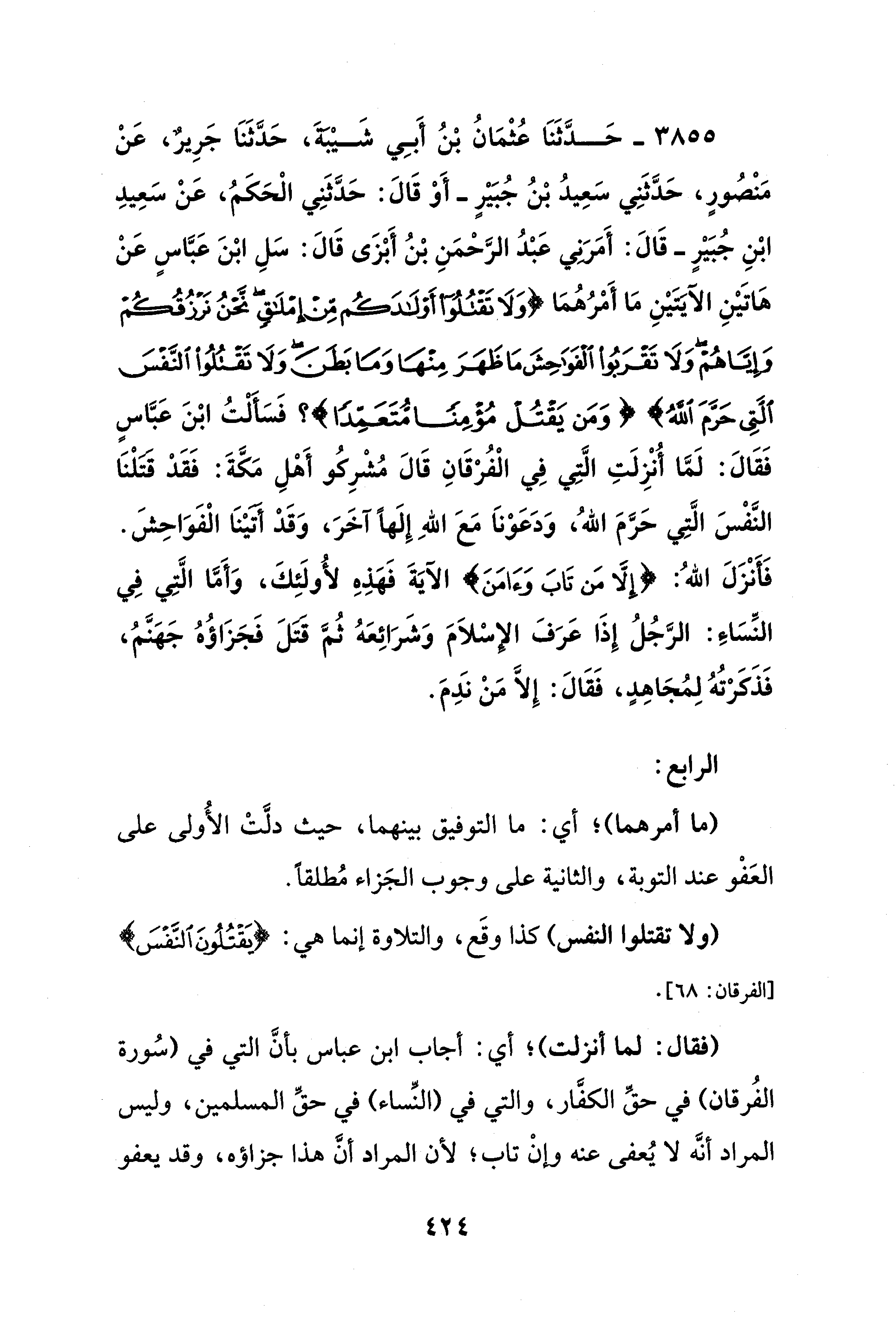 3855 - حَدَّثَنَا عُثْمَانُ بْنُ أَبِي شَيْبَةَ، حَدَّثَنَا جَرِيرٌ، عَنْ مَنْصُورٍ، حَدَّثَنِي سَعِيدُ بْنُ جُبَيْرٍ -أَوْ قَالَ: حَدَّثَنِي الْحَكَمُ، عَنْ سَعِيدِ ابْنِ جُبَيْرٍ- قَالَ: أَمَرَنِي عَبْدُ الرَّحْمَنِ بْنُ أَبْزَى قَالَ: سَلِ ابْنَ عَبَّاسٍ عَنْ هَاتَيْنِ الآيَتِيْنِ مَا أَمْرُهُمَا {قُلْ تَعَالَوْا أَتْلُ مَا حَرَّمَ رَبُّكُمْ عَلَيْكُمْ أَلَّا تُشْرِكُوا بِهِ شَيْئًا وَبِالْوَالِدَيْنِ إِحْسَانًا وَلَا تَقْتُلُوا أَوْلَادَكُمْ مِنْ إِمْلَاقٍ نَحْنُ نَرْزُقُكُمْ وَإِيَّاهُمْ وَلَا تَقْرَبُوا الْفَوَاحِشَ مَا ظَهَرَ مِنْهَا وَمَا بَطَنَ وَلَا تَقْتُلُوا النَّفْسَ الَّتِي حَرَّمَ اللَّهُ} {وَمَنْ يَقْتُلْ مُؤْمِنًا مُتَعَمِّدًا}؟ فَسَأَلْتُ ابْنَ عَبَّاسٍ فَقَالَ: لَمَّا أُنْزِلَتِ الَّتِي فِي الْفُرْقَانِ قَالَ مُشْرِكُو أَهْلِ مَكَّةَ: فَقَدْ قَتَلْنَا النَّفْسَ الَّتِي حَرَّمَ اللهُ، وَدَعَوْنَا مَعَ اللهِ إِلَهًا آخَرَ، وَقَدْ أَتَيْنَا الْفَوَاحِشَ. فَأَنْزَلَ اللهُ: {إلا مَنْ تَابَ وَآمَنَ} الآيَةَ فَهَذِهِ لأُولَئِكَ، وَأَمَّا الَّتِي فِي النِّسَاءِ: الرَّجُلُ إِذَا عَرَفَ الإسْلَامَ وَشَرَائِعَهُ ثُمَّ قتلَ فَجَزَاؤُهُ جَهَنَّمُ، فَذَكَرْتُهُ لِمُجَاهِدٍ، فَقَالَ: إلا مَنْ نَدِمَ.