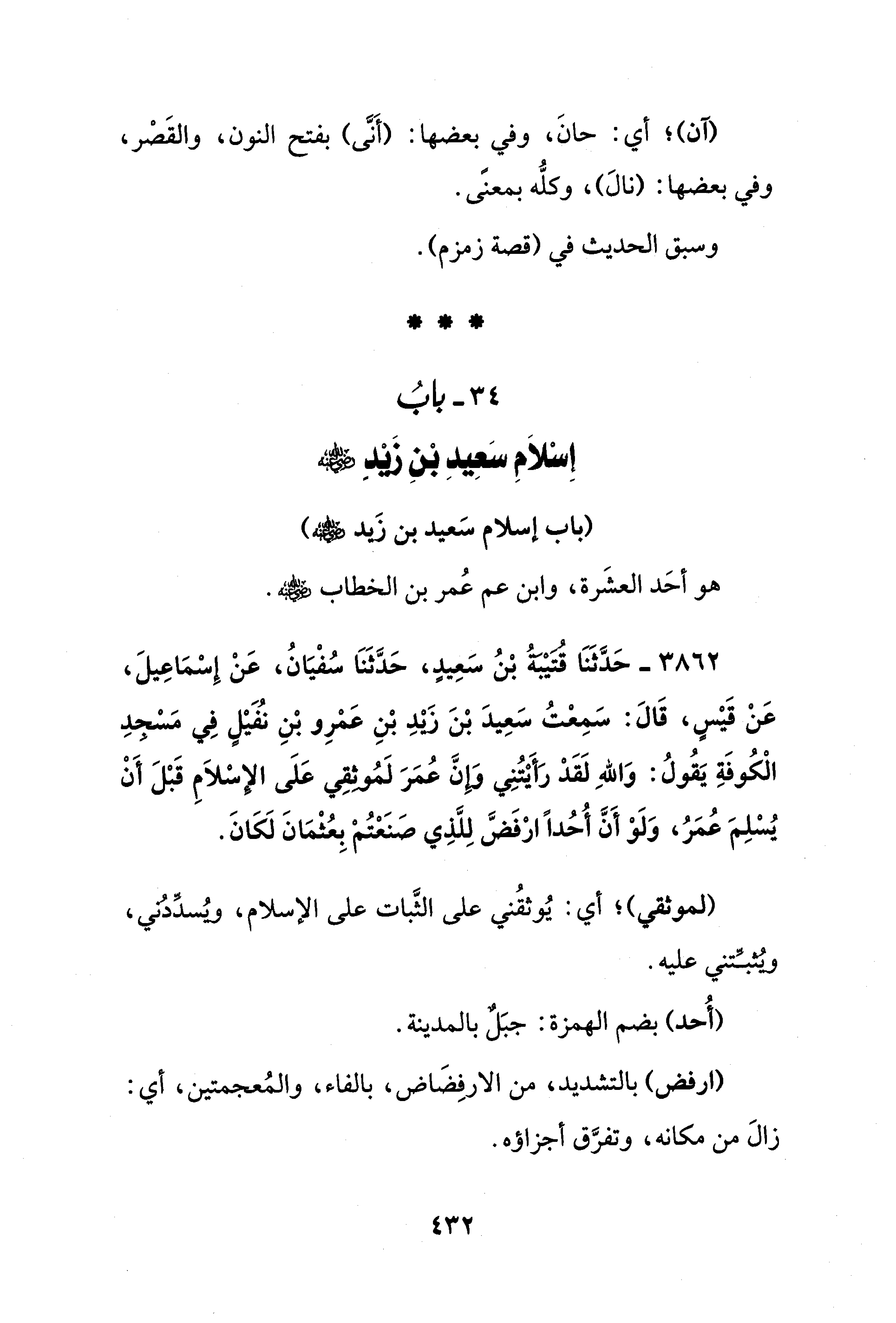 34 - بابُ إِسْلَامِ سَعِيدٍ بْنِ زَيْدٍ - رضي الله عنه -