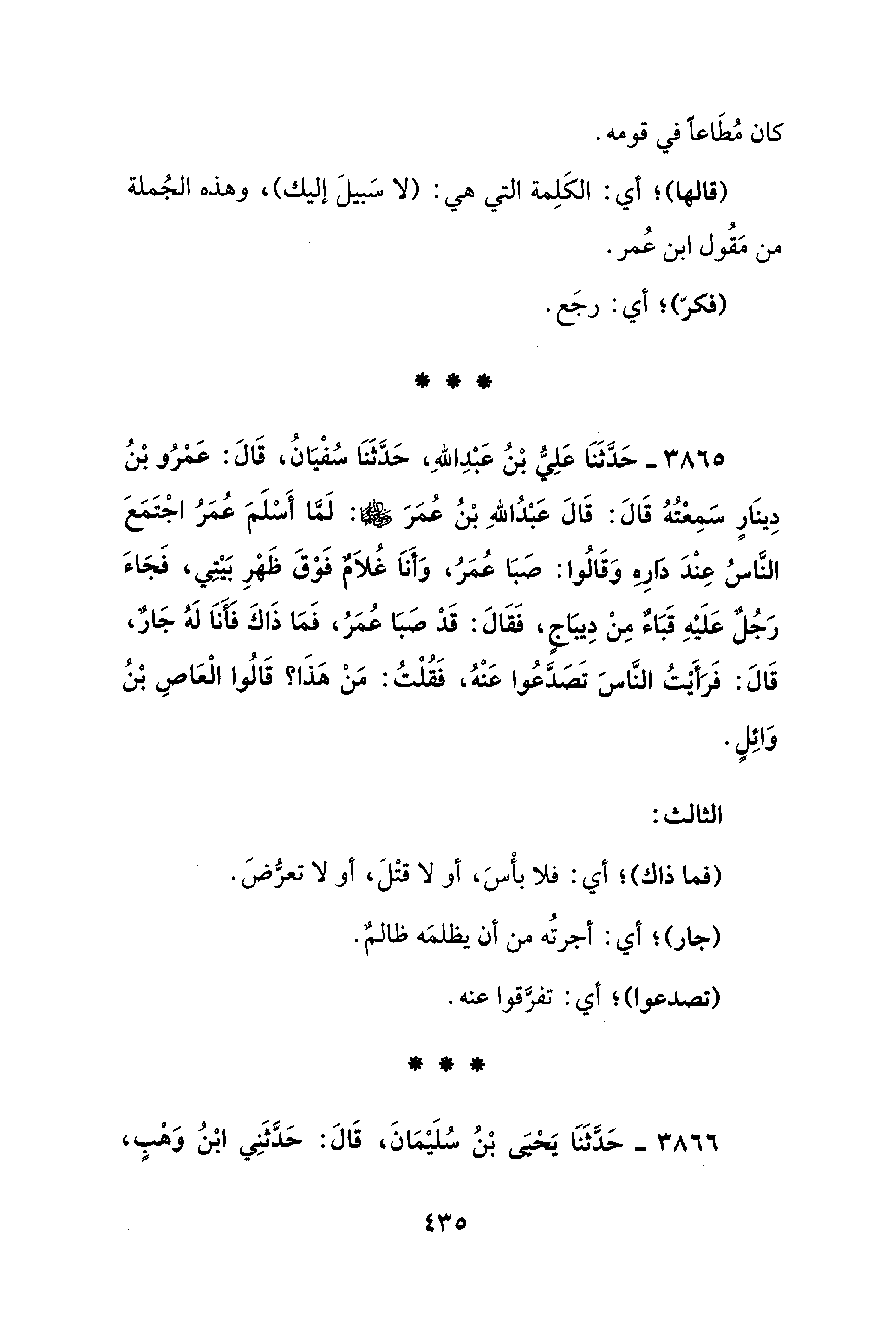 3865 - حَدَّثَنَا عَلِيُّ بْنُ عَبْدِ اللهِ، حَدَّثَنَا سُفْيَانُ، قَالَ: عَمْرُو بْنُ دِينَارٍ سَمِعْتُهُ قَالَ: قَالَ عَبْدُ اللهِ بْنُ عُمَرَ - رضي الله عنهما -: لَمَّا أَسْلَمَ عُمَرُ اجْتَمَعَ النَّاسُ عِنْدَ دَارِهِ وَقَالُوا: صَبَا عُمَرُ، وَأَنَا غُلَامٌ فَوْقَ ظَهْرِ بَيتِي، فَجَاءَ رَجُلٌ عَلَيْهِ قَبَاءٌ مِنْ دِيبَاجٍ، فَقَالَ: قَدْ صَبَا عُمَرُ، فَمَا ذَاكَ فَأَنَا لَهُ جَارٌ، قَالَ: فَرَأَيْتُ النَّاسَ تَصَدَّعُوا عَنْهُ، فَقُلْتُ: مَنْ هَذَا؟ قَالُوا الْعَاصِ بْنُ وَائِلٍ.