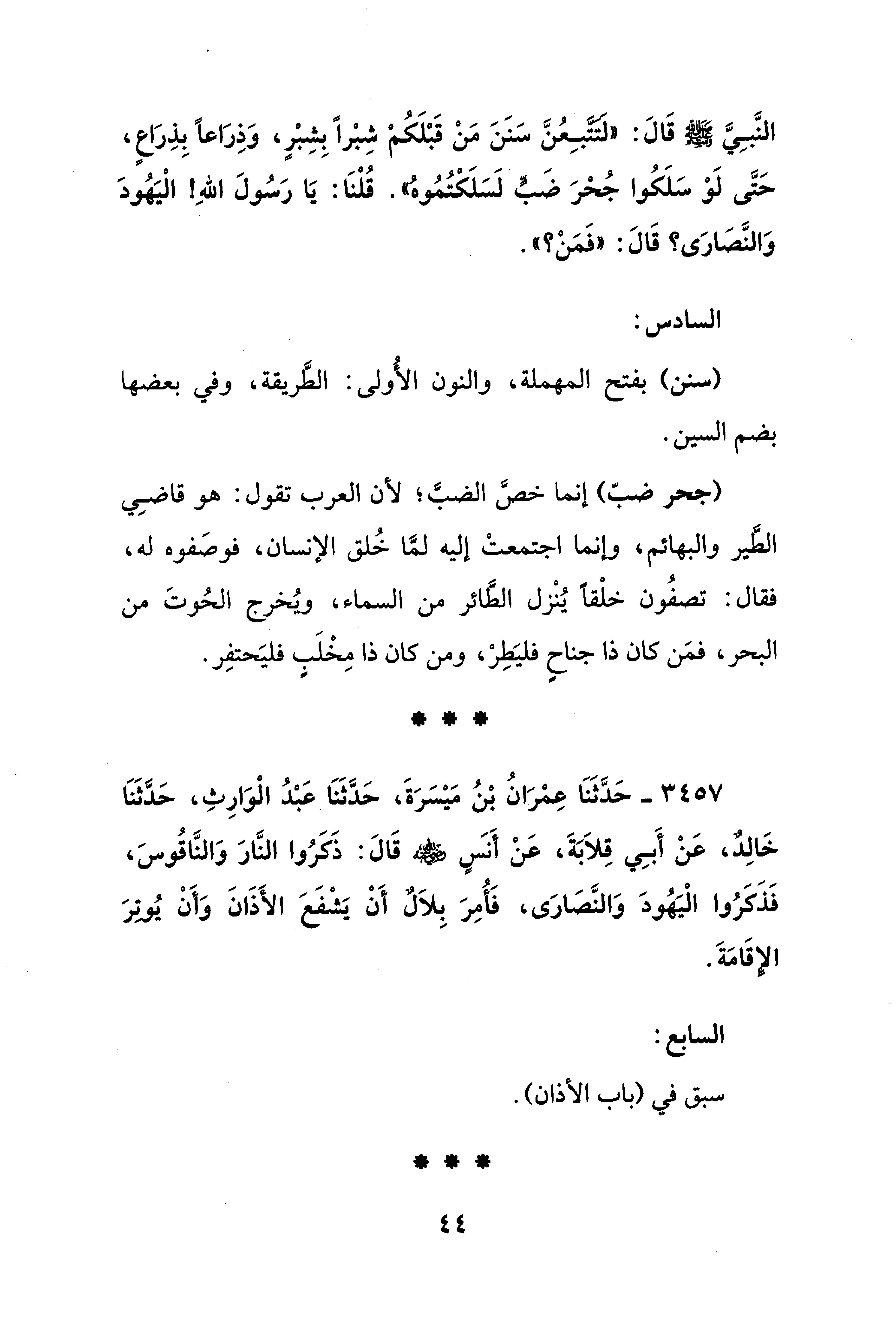النَّبِيَّ - صلى الله عليه وسلم - قَالَ: "لَتَتَّبِعُنَّ سَنَنَ مَنْ قَبْلَكُمْ شِبْرًا بِشِبْرٍ، وَذِرَاعًا بِذِرَاعٍ، حَتَّى لَوْ سَلَكُوا جُحْرَ ضَبٍّ لَسَلَكْتُمُوهُ". قُلْنَا: يَا رَسُولَ اللهِ! الْيَهُودَ وَالنَّصَارَى؟ قَالَ: "فَمَنْ؟ ".