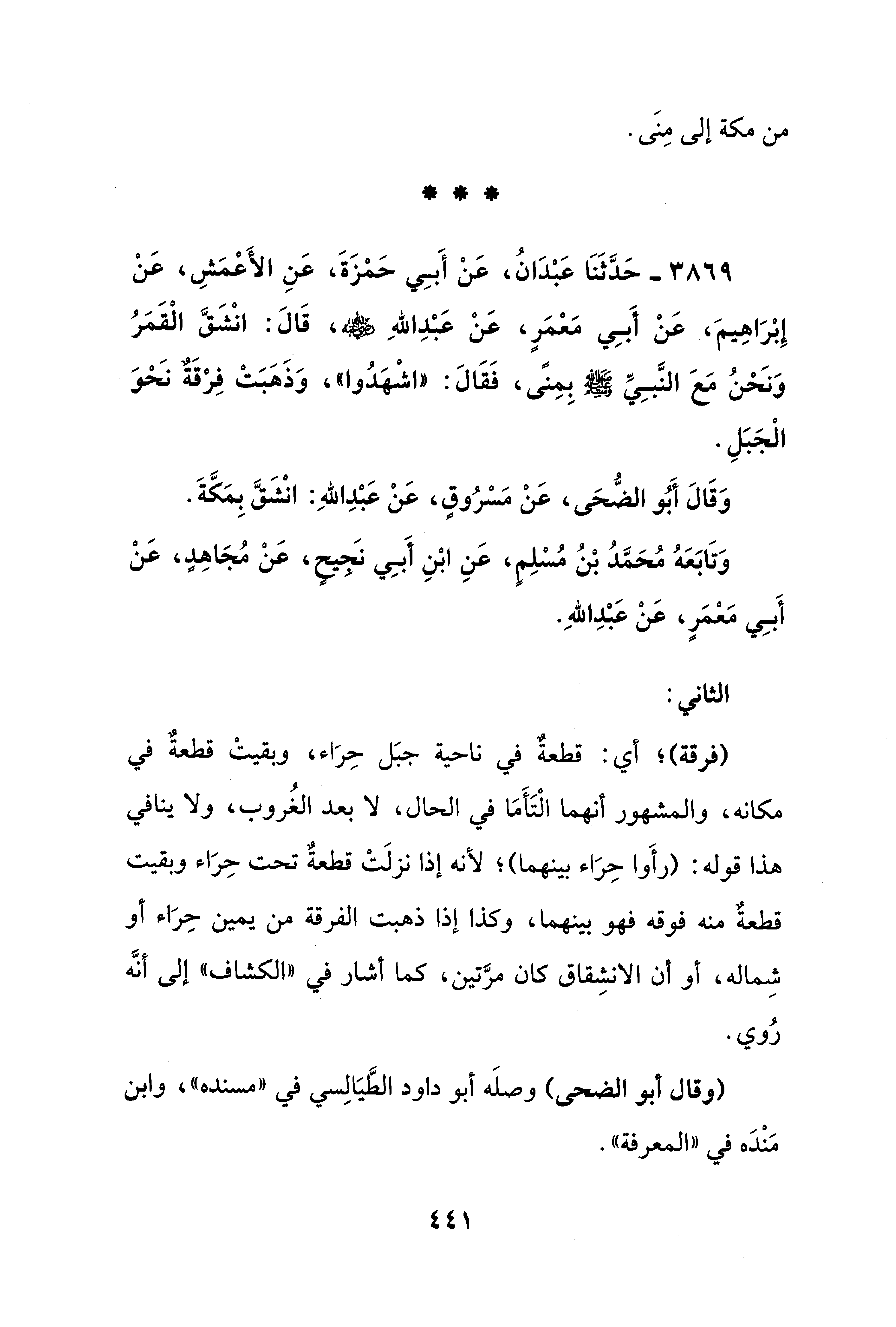 3869 - حَدَّثَنَا عَبْدَانُ، عَنْ أَبِي حَمْزَةَ، عَنِ الأَعْمَشِ، عَنْ إِبْرَاهِيمَ، عَنْ أَبِي مَعْمَرٍ، عَنْ عَبْدِ اللهِ - رضي الله عنه -، قَالَ: انْشَقَّ الْقَمَرُ وَنَحْنُ مَعَ النَّبِيِّ - صلى الله عليه وسلم - بِمِنًى، فَقَالَ: "اشْهَدُوا"، وَذَهَبَتْ فِرْقَةٌ نَحْوَ الْجَبَلِ.