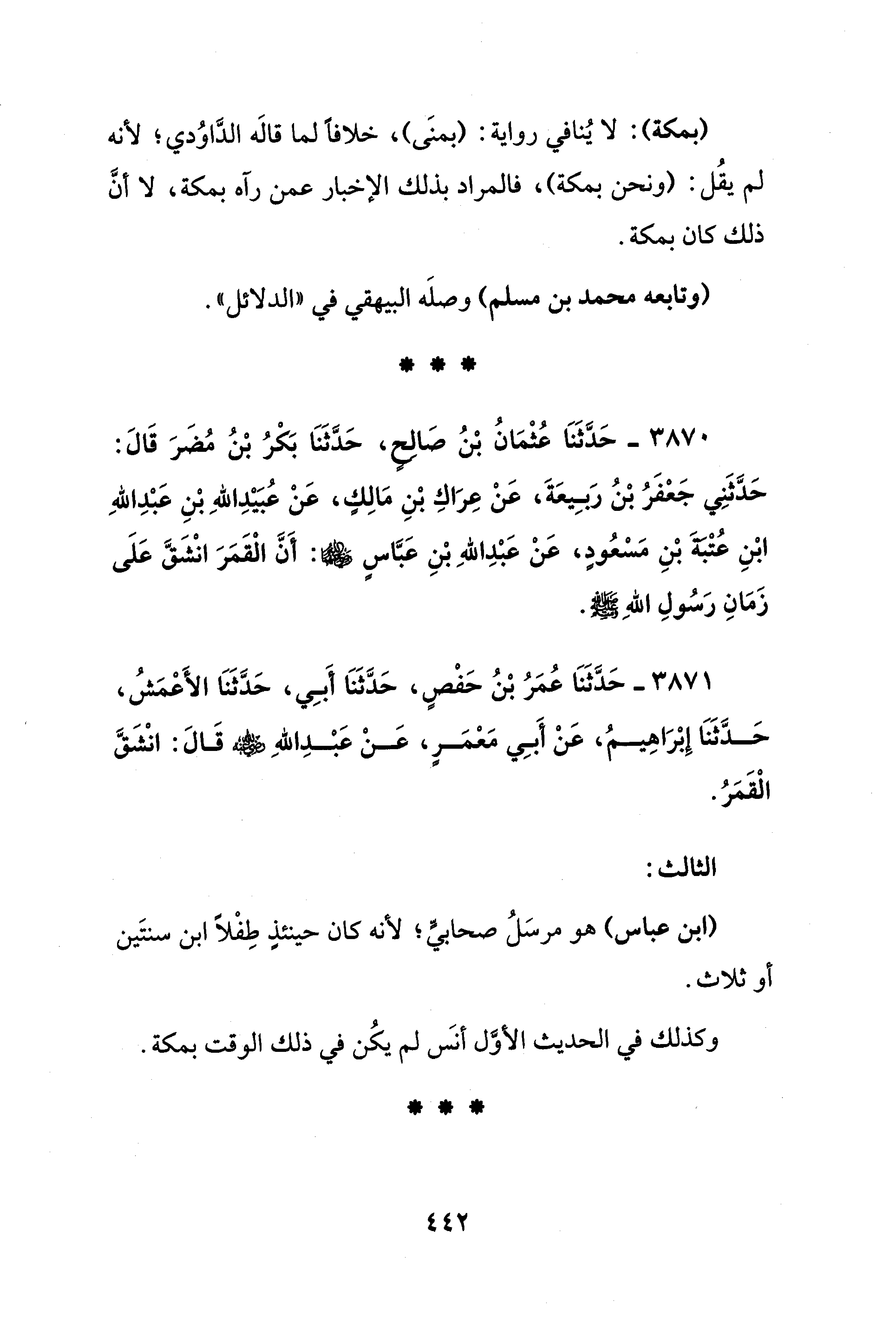 3871 - حَدَّثَنَا عُمَرُ بْنُ حَفْصٍ، حَدَّثَنَا أَبِي، حَدَّثَنَا الأَعْمَشُ، حَدَّثَنَا إِبْرَاهِيمُ، عَنْ أَبِي مَعْمَرٍ، عَنْ عَبْدِ اللهِ - رضي الله عنهما - قَالَ: انْشَقَّ الْقَمَرُ.