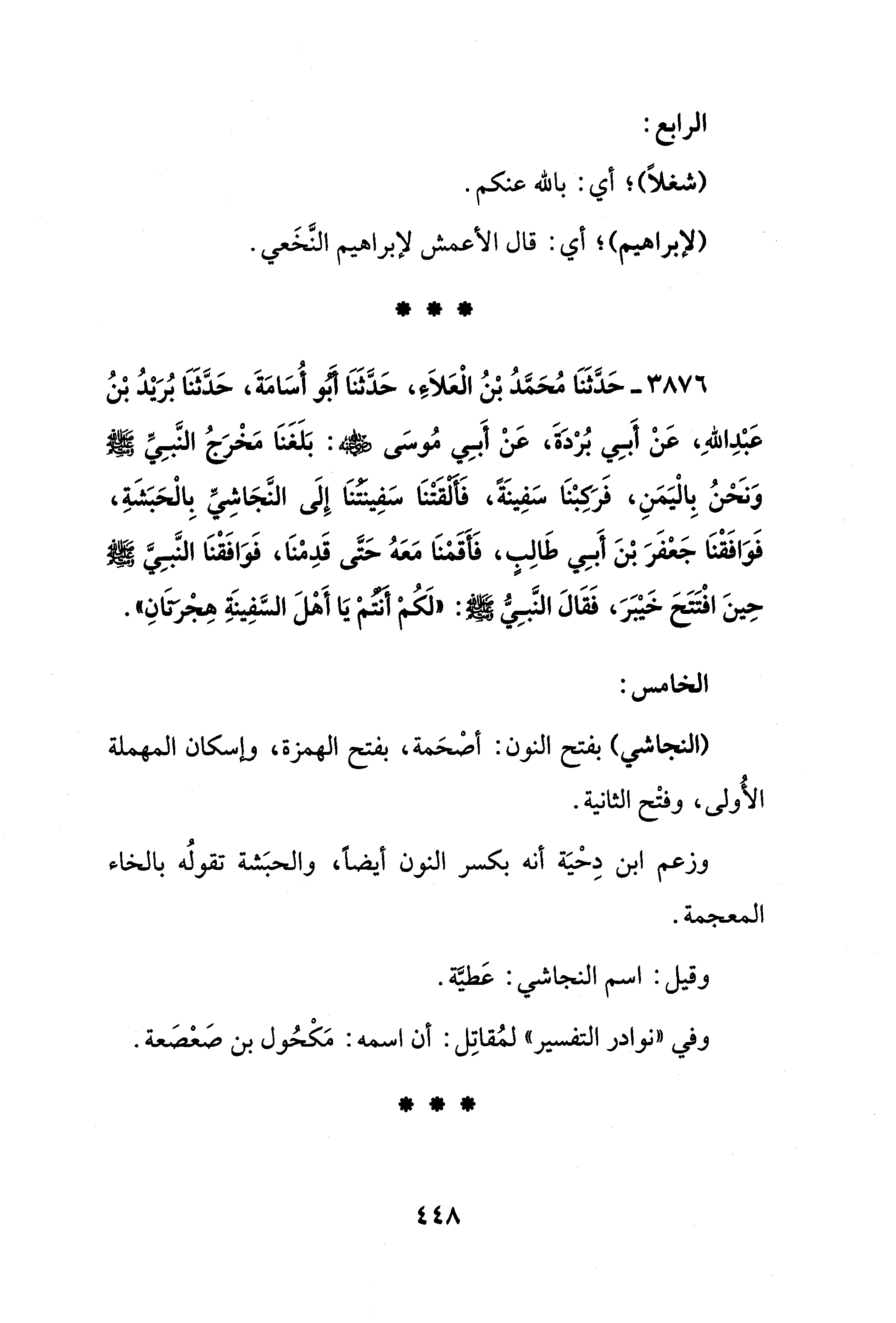 3876 - حَدَّثَنَا مُحَمَّدُ بْنُ الْعَلَاءِ، حَدَّثَنَا أَبُو أُسَامَةَ، حَدَّثَنَا بُرَيْدُ بْنُ عَبْدِ اللهِ، عَنْ أَبِي بُرْدَةَ، عَنْ أَبِي مُوسَى - رضي الله عنه -: بَلَغَنَا مَخْرَجُ النَّبِيِّ - صلى الله عليه وسلم - وَنحنُ بِالْيَمَنِ، فَرَكِبْنَا سَفِينَةً، فَأَلْقَتْنَا سَفِينَتُنَا إِلَى النَّجَاشِيِّ بِالْحَبَشَةِ، فَوَافَقْنَا جَعْفَرَ بْنَ أَبِي طَالِبٍ، فَأَقَمْنَا مَعَهُ حَتَّى قَدِمْنَا، فَوَافَقْنَا النَّبِيَّ - صلى الله عليه وسلم - حِينَ افْتَتَحَ خَيْبَرَ، فَقَالَ النَّبِيُّ - صلى الله عليه وسلم -: "لَكُمْ أَنْتُمْ يَا أَهْلَ السَّفِينَةِ هِجْرَتَانِ".