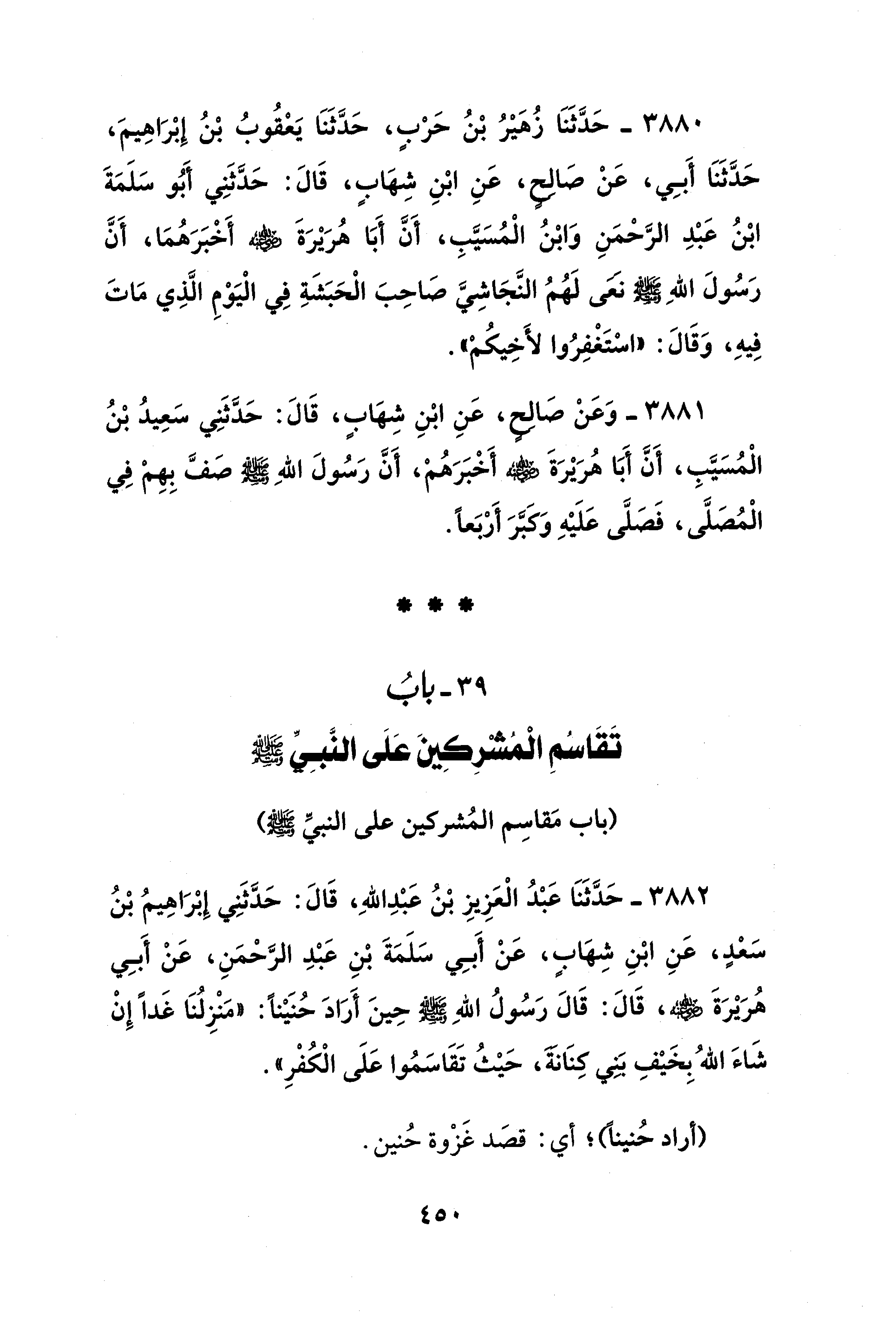3880 - حَدَّثَنَا زُهَيْرُ بْنُ حَرْبٍ، حَدَّثَنَا يَعْقُوبُ بْنُ إِبْرَاهِيمَ، حَدَّثَنَا أَبِي، عَنْ صَالِحٍ، عَنِ ابْنِ شِهَابٍ، قَالَ: حَدَّثَنِي أَبُو سَلَمَةَ ابْنُ عَبْدِ الرَّحْمَنِ وَابْنُ الْمُسَيَّبِ، أَنَّ أَبَا هُرَيْرَةَ - رضي الله عنه - أَخْبَرَهُمَا، أَنَّ رَسُولَ اللهِ - صلى الله عليه وسلم - نَعَى لَهُمُ النَّجَاشِيَّ صَاحِبَ الْحَبَشَةِ فِي الْيَوْمِ الَّذِي مَاتَ فِيهِ، وَقَالَ: "اسْتَغْفِرُوا لأَخِيكُمْ".