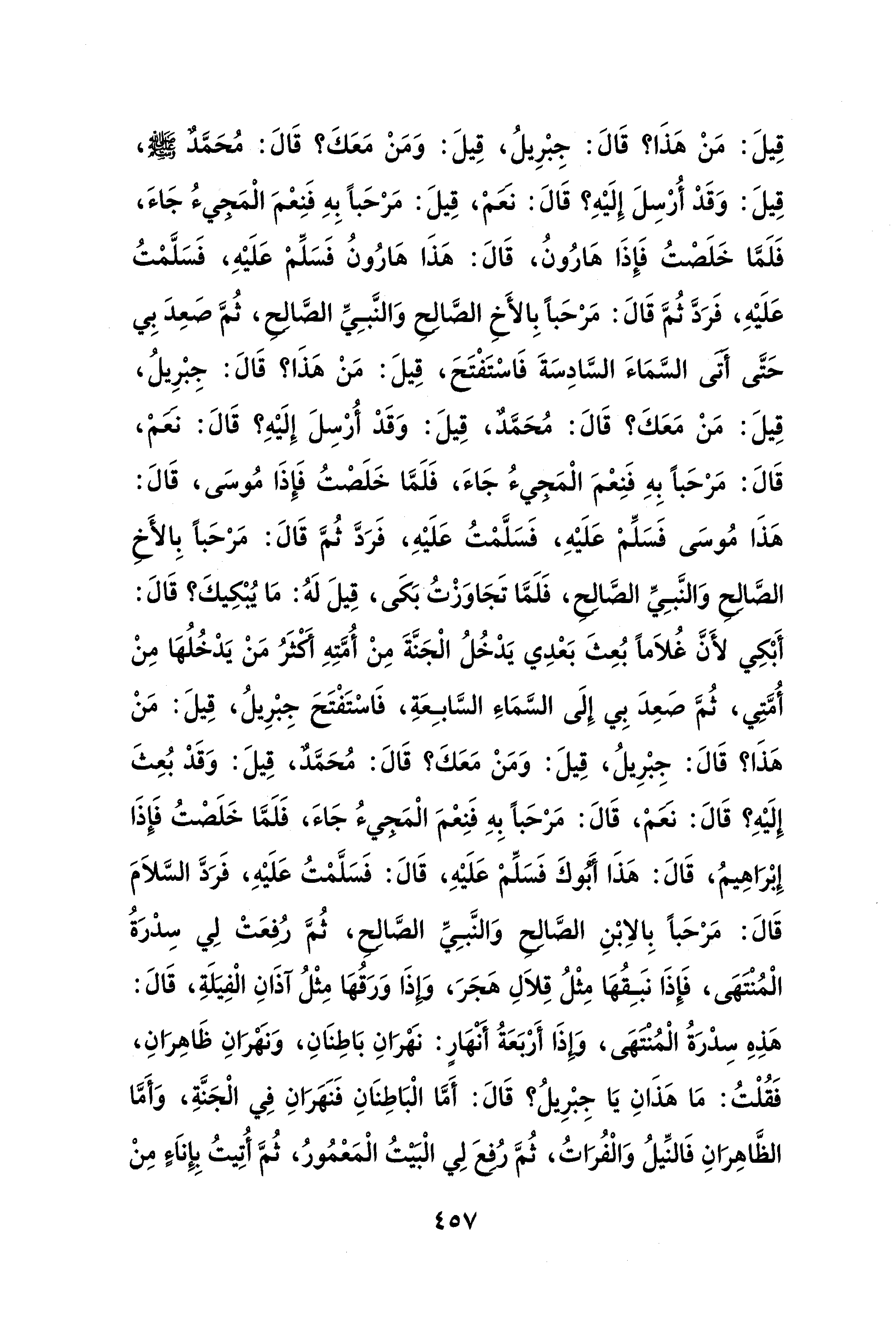 قِيلَ: مَنْ هَذَا؟ قَالَ: جِبْرِيلُ، قِيلَ: وَمَنْ مَعَكَ؟ قَالَ: مُحَمَّدٌ - صلى الله عليه وسلم -، قِيلَ: وَقَدْ أُرْسِلَ إِلَيْهِ؟ قَالَ: نَعَمْ، قِيلَ: مَرْحَبًا بِهِ فَنِعْمَ الْمَجِيءُ جَاءَ، فَلَمَّا خَلَصْتُ فَإِذَا هَارُونُ، قَالَ: هَذَا هَارُونُ فَسَلِّمْ عَلَيْهِ، فَسَلَّمْتُ عَلَيْهِ، فَرَدَّ ثُمَّ قَالَ: مَرْحَبًا بِالَأخِ الصَّالِحِ وَالنَّبِيِّ الصَّالِحِ، ثُمَّ صَعِدَ بِي حَتَّى أَتَى السَّمَاءَ السَّادِسَةَ فَاسْتَفْتَحَ، قِيلَ: مَنْ هَذَا؟ قَالَ: جِبْرِيلُ، قِيلَ: مَنْ مَعَكَ؟ قَالَ: مُحَمَّدٌ، قِيلَ: وَقَدْ أُرْسِلَ إِلَيْهِ؟ قَالَ: نَعَمْ، قَالَ: مَرْحَبًا بِهِ فَنِعْمَ الْمَجِيءُ جَاءَ، فَلَمَّا خَلَصْتُ فَإِذَا مُوسَى، قَالَ: هَذَا مُوسَى فَسَلِّمْ عَلَيْهِ، فَسَلَّمْتُ عَلَيْهِ، فَرَدَّ ثُمَّ قَالَ: مَرْحَبًا بِالأَخِ الصَّالِحِ وَالنَّبِيِّ الصَّالِحِ، فَلَمَّا تَجَاوَزْتُ بَكَى، قِيلَ لَهُ: مَا يُبْكِيكَ؟ قَالَ: أَبْكِي لأَنَّ غُلاَمًا بُعِثَ بَعْدِي يَدْخُلُ الْجَنَّةَ مِنْ أُمَّتِهِ أَكْثَرُ مَنْ يَدْخُلُهَا مِنْ أُمَّتِي، ثُمَّ صَعِدَ بِي إِلَى السَّمَاءِ السَّابِعَةِ، فَاسْتَفْتَحَ جِبْرِيلُ، قِيلَ: مَنْ هَذَا؟ قَالَ: جِبْرِيلُ، قِيلَ: وَمَنْ مَعَكَ؟ قَالَ: مُحَمَّدٌ، قِيلَ: وَقَدْ بُعِثَ إِلَيْهِ؟ قَالَ: نَعَمْ، قَالَ: مَرْحَبًا بِهِ فَنِعْمَ الْمَجِيءُ جَاءَ، فَلَمَّا خَلَصْتُ فَإِذَا إِبْرَاهِيمُ، قَالَ: هَذَا أَبُوكَ فَسَلِّمْ عَلَيْهِ، قَالَ: فَسَلَّمْتُ عَلَيْهِ، فَرَدَّ السَّلاَمَ قَالَ: مَرْحَبًا بِالاِبْنِ الصَّالِحِ وَالنَّبِيِّ الصَّالِحِ، ثُمَّ رُفِعَتْ لِي سِدْرَةُ الْمُنتهَى، فَإِذَا نَبِقُهَا مِثْلُ قِلاَلِ هَجَرَ، وَإِذَا وَرَقُهَا مِثْلُ آذَانِ الْفِيَلَةِ، قَالَ: هَذِهِ سِدْرَةُ الْمُنْتَهَى، وَإِذَا أَرْبَعَةُ أَنْهَارٍ: نَهْرَانِ بَاطِنَانِ، وَنَهْرَانِ ظَاهِرَانِ، فَقُلْتُ: مَا هَذَانِ يَا جِبْرِيلُ؟ قَالَ: أَمَّا الْبَاطِنَانِ فَنَهَرَانِ فِي الْجَنَّةِ، وَأَمَّا الظَّاهِرَانِ فَالنِّيلُ وَالْفُرَاتُ، ثُمَّ رُفِعَ لِي الْبَيْتُ الْمَعْمُورُ، ثُمَّ أُتِيتُ بِإِناَءٍ مِنْ