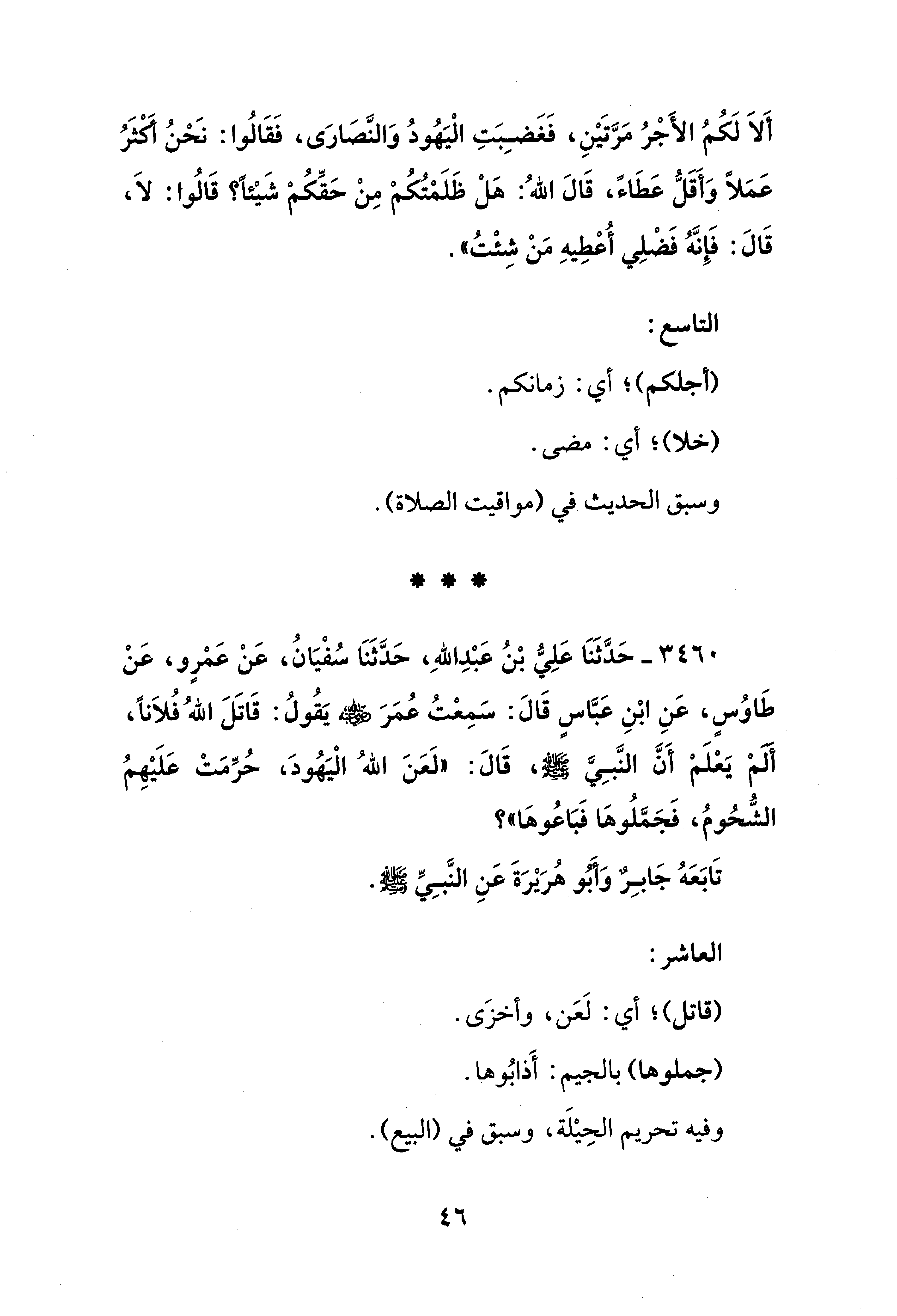 3460 - حَدَّثَنَا عَلِيُّ بْنُ عَبْدِ اللهِ، حَدَّثَنَا سُفْيَانُ، عَنْ عَمْرٍو، عَنْ طَاوُسٍ، عَنِ ابْنِ عَبَّاسٍ قَالَ: سَمِعْتُ عُمَرَ - رضي الله عنه - يَقُولُ: قَاتَلَ اللهُ فُلاَنًا، ألمْ يَعْلَمْ أَنَّ النَّبِيَّ - صلى الله عليه وسلم -، قَالَ: "لَعَنَ اللهُ الْيَهُودَ، حُرِّمَتْ عَلَيْهِمُ الشُّحُومُ، فَجَمَّلُوهَا فَبَاعُوهَا"؟