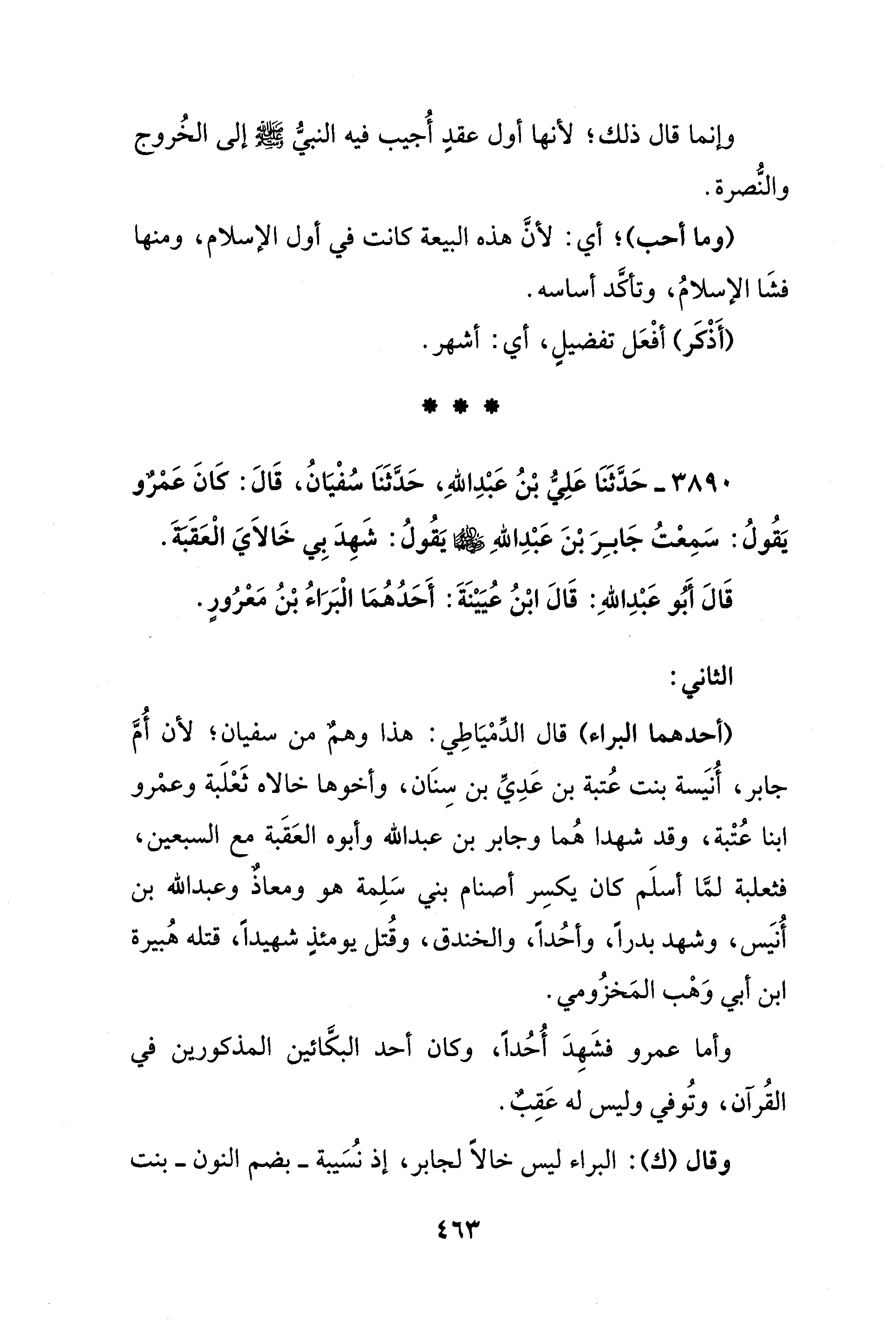 3890 - حَدَّثَنَا عَلِيُّ بْنُ عَبْدِ اللهِ، حَدَّثَنَا سُفْيَانُ، قَالَ: كَانَ عَمْرٌو يَقُولُ: سَمِعْتُ جَابِرَ بْنَ عَبْدِ اللهِ - رضي الله عنهما - يَقُولُ: شَهِدَ بِي خَالاَيَ الْعَقَبَةَ.