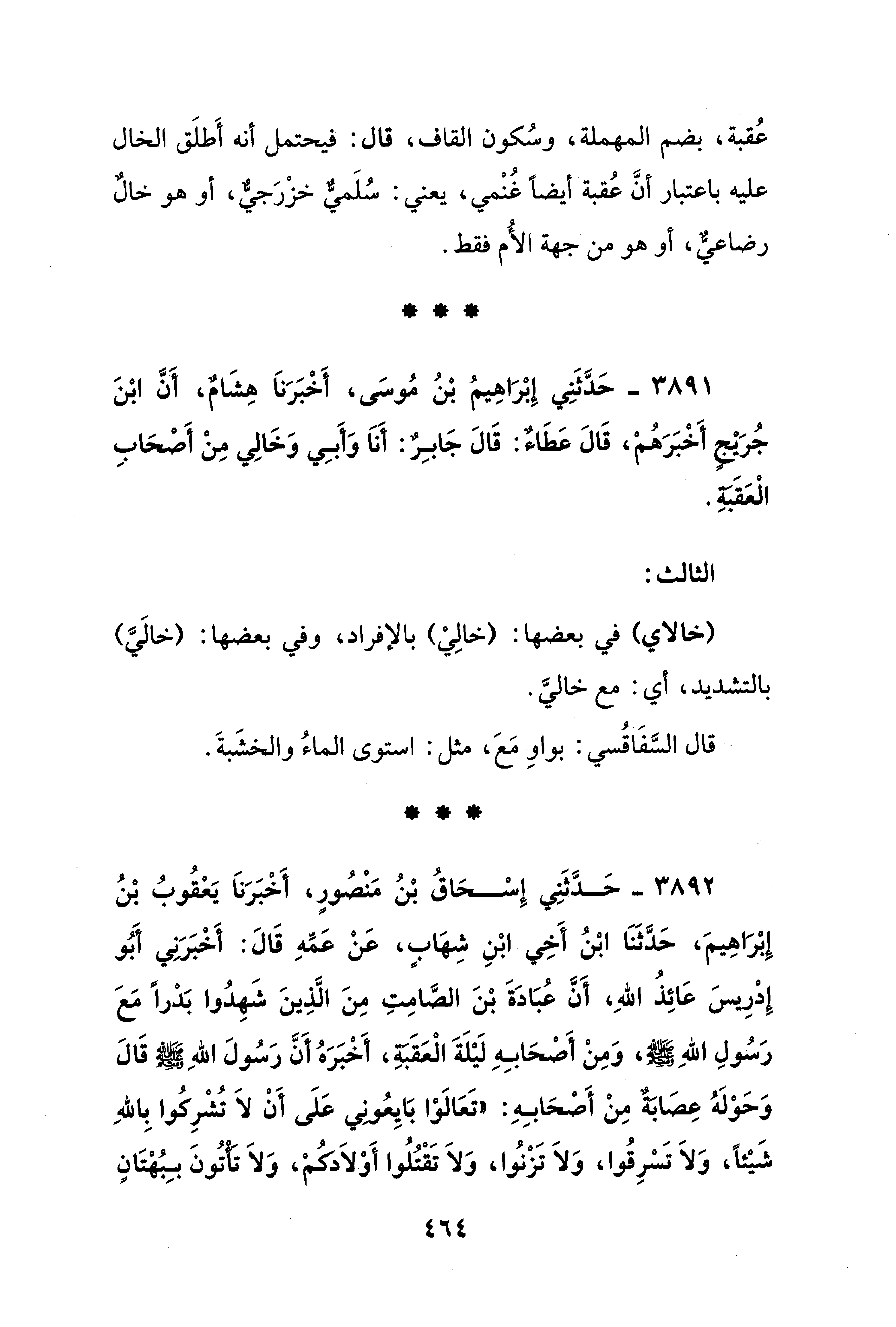 3891 - حَدَّثَنِي إِبْرَاهِيمُ بْنُ مُوسَى، أَخْبَرَنَا هِشَامٌ، أَنَّ ابْنَ جُرَيْجٍ أَخْبَرَهُمْ، قَالَ عَطَاءٌ: قَالَ جَابِرٌ: أَنَا وَأَبِي وَخَالِي مِنْ أَصْحَابِ الْعَقَبَةِ.