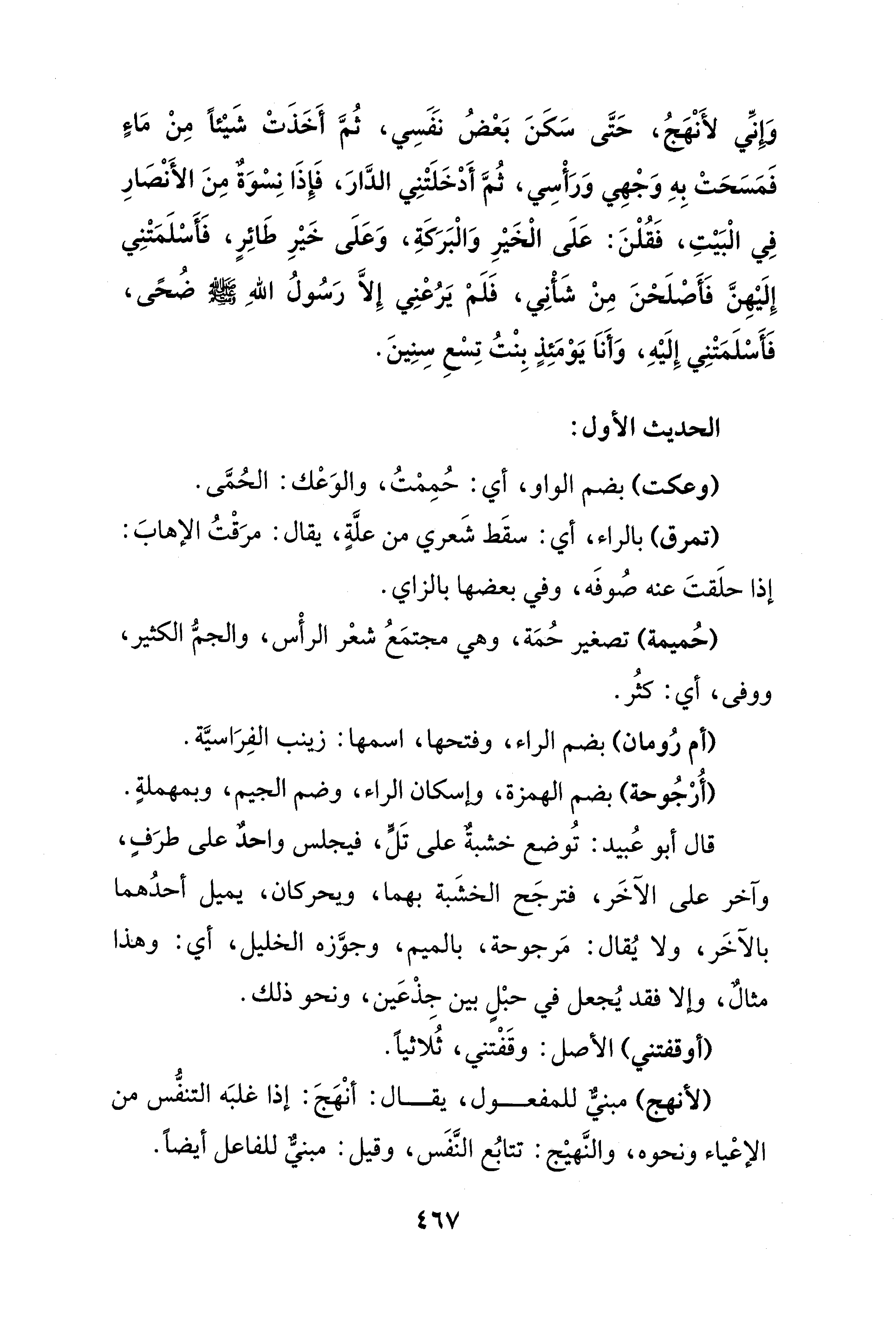 وَإِنِّي لأَنْهَجُ، حَتَّى سَكَنَ بَعْضُ نَفَسِي، ثُمَّ أَخَذَتْ شَيْئًا مِنْ مَاءٍ فَمَسَحَتْ بِهِ وَجْهِي وَرَأْسِي، ثُمَّ أَدْخَلَتْنِي الدَّارَ، فَإِذَا نِسْوَةٌ مِنَ الأَنْصَارِ فِي الْبَيْتِ، فَقُلْنَ: عَلَى الْخَيْرِ وَالْبَرَكَةِ، وَعَلَى خَيْرِ طَائِرٍ، فَأَسْلَمَتْنِي إِلَيْهِنَّ فَأَصْلَحْنَ مِنْ شَأْنِي، فَلَمْ يَرُعْنِي إِلَّا رَسُولُ اللهِ - صلى الله عليه وسلم - ضُحًى، فَأَسْلَمَتْنِي إِلَيْهِ، وَأَنَا يَوْمَئِذٍ بِنْتُ تِسْعِ سِنِينَ.