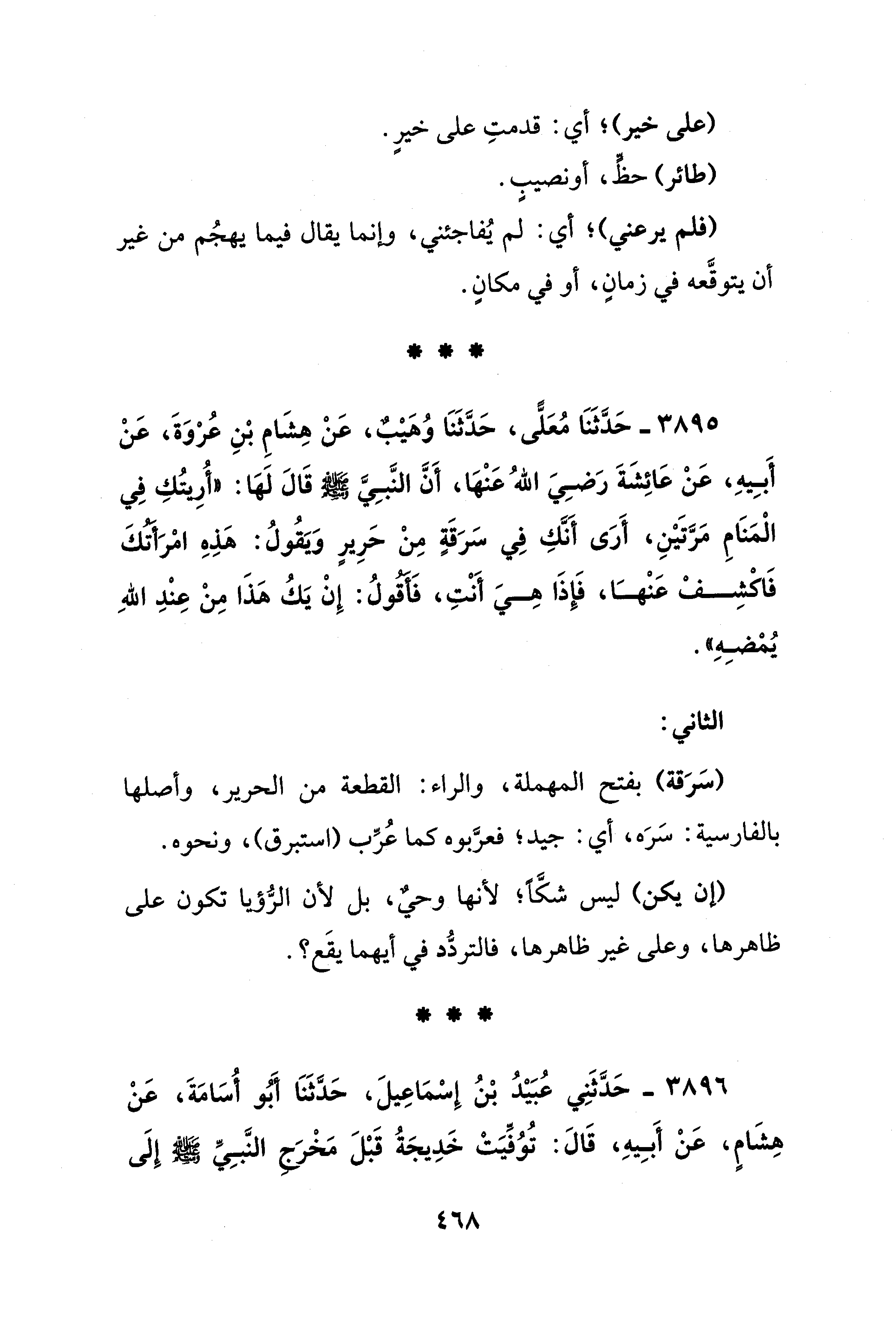 3895 - حَدَّثَنَا مُعَلًّى، حَدَّثَنَا وُهَيْبٌ، عَنْ هِشَامِ بْنِ عُرْوَةَ، عَنْ أَبِيهِ، عَنْ عَائِشَةَ رَضِيَ اللهُ عَنْهَا، أَنَّ النَّبِيَّ - صلى الله عليه وسلم - قَالَ لَهَا: "أُرِيتُكِ فِي الْمَنَامِ مَرَّتَيْنِ، أَرَى أنَّكِ فِي سَرَقَةٍ مِنْ حَرِيرٍ وَيَقُولُ: هَذِهِ امْرَأَتُكَ فَاكْشِفْ عَنْهَا، فَإِذَا هِيَ أَنْتِ، فَأَقُولُ: إِنْ يَكُ هَذَا مِنْ عِنْدِ اللهِ يُمْضِهِ".