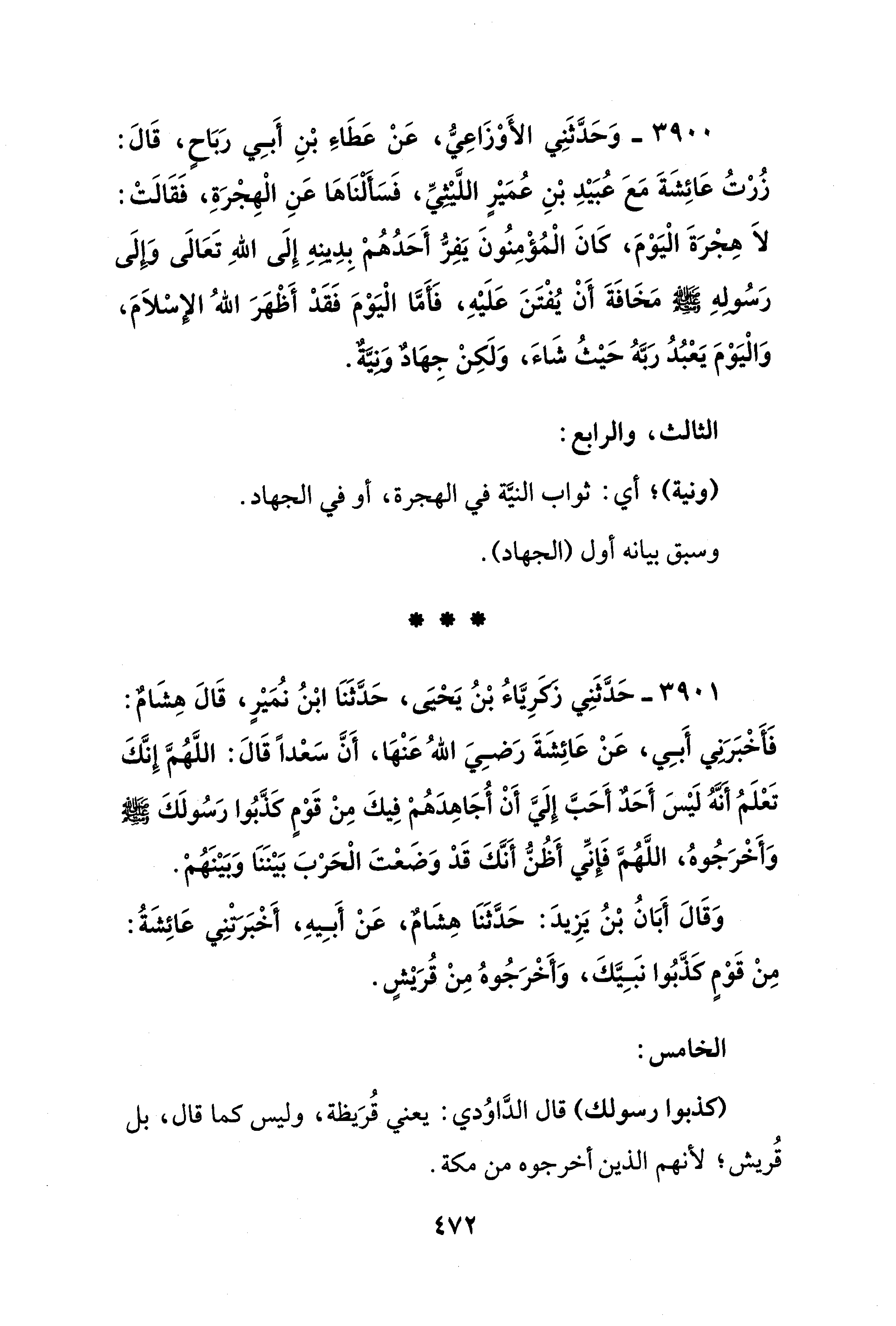 3901 - حَدَّثَنِي زَكَرِيَّاءُ بْنُ يَحْيَى، حَدَّثَنَا ابْنُ نُمَيْرٍ، قَالَ هِشَامٌ: فَأَخْبَرَنِي أَبِي، عَنْ عَائِشَةَ رَضِيَ اللهُ عَنْهَا، أَنَّ سَعْدًا قَالَ: اللَّهُمَّ إِنَّكَ تَعْلَمُ أَنَّهُ لَيْسَ أَحَدٌ أَحَبَّ إِلَيَّ أَنْ أُجَاهِدَهُمْ فِيكَ مِنْ قَوْمٍ كَذَّبُوا رَسُولَكَ - صلى الله عليه وسلم - وَأَخْرَجُوهُ، اللَّهُمَّ فَإِنِّي أَظُنُّ أَنَّكَ قَدْ وَضَعْتَ الْحَرْبَ بَيْنَنَا وَبَيْنَهُمْ.