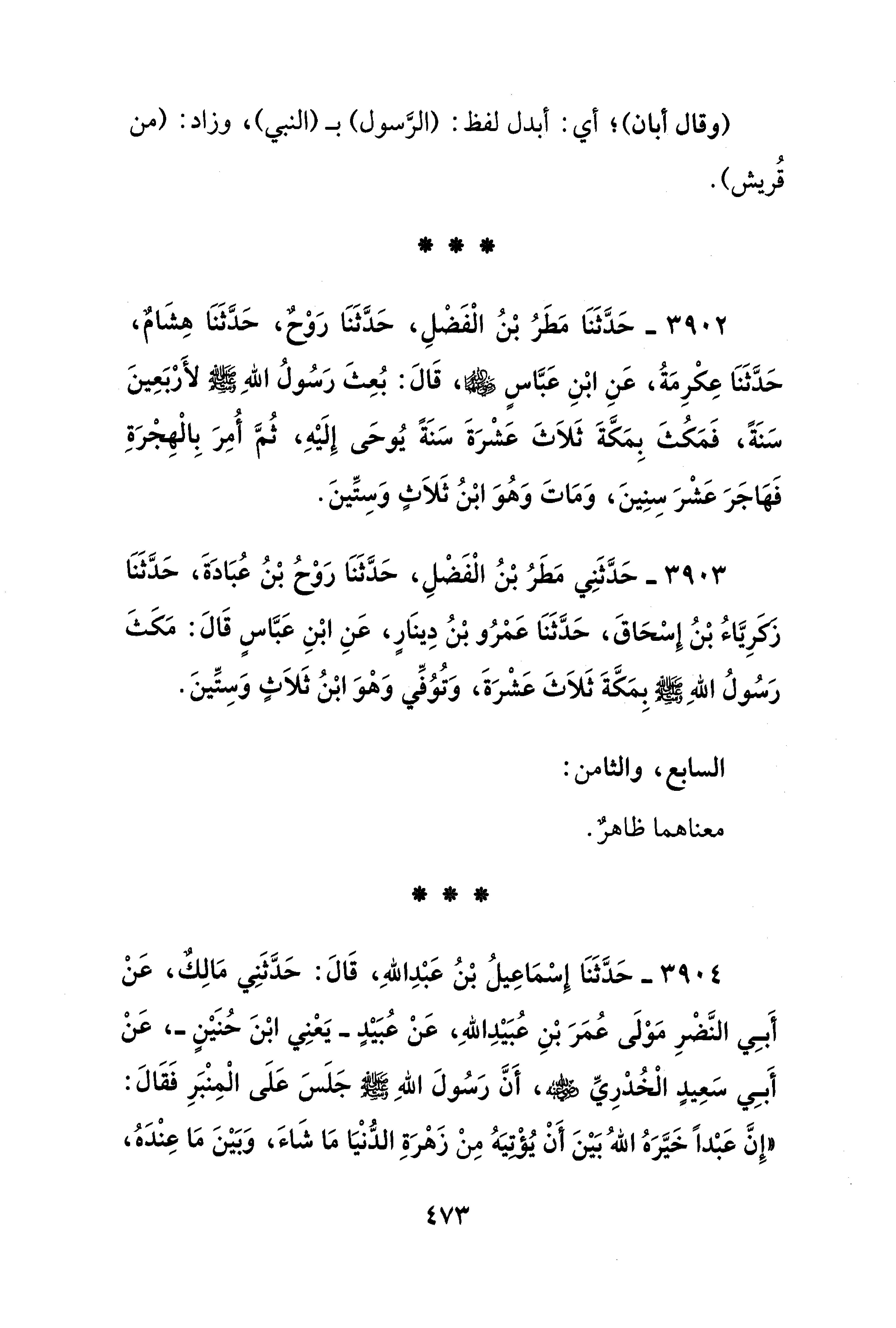 3903 - حَدَّثَنِي مَطَرُ بْنُ الْفَضْلِ، حَدَّثَنَا رَوْحُ بْنُ عُبَادَةَ، حَدَّثَنَا زَكَرِيَّاءُ بْنُ إِسْحَاقَ، حَدَّثَنَا عَمْرُو بْنُ دِينَارٍ، عَنِ ابْنِ عَبَّاسٍ قَالَ: مَكَثَ رَسُولُ اللهِ - صلى الله عليه وسلم - بِمَكَّةَ ثَلاَثَ عَشْرَةَ، وَتُوُفِّي وَهْوَ ابْنُ ثَلاَثٍ وَسِتِّينَ.