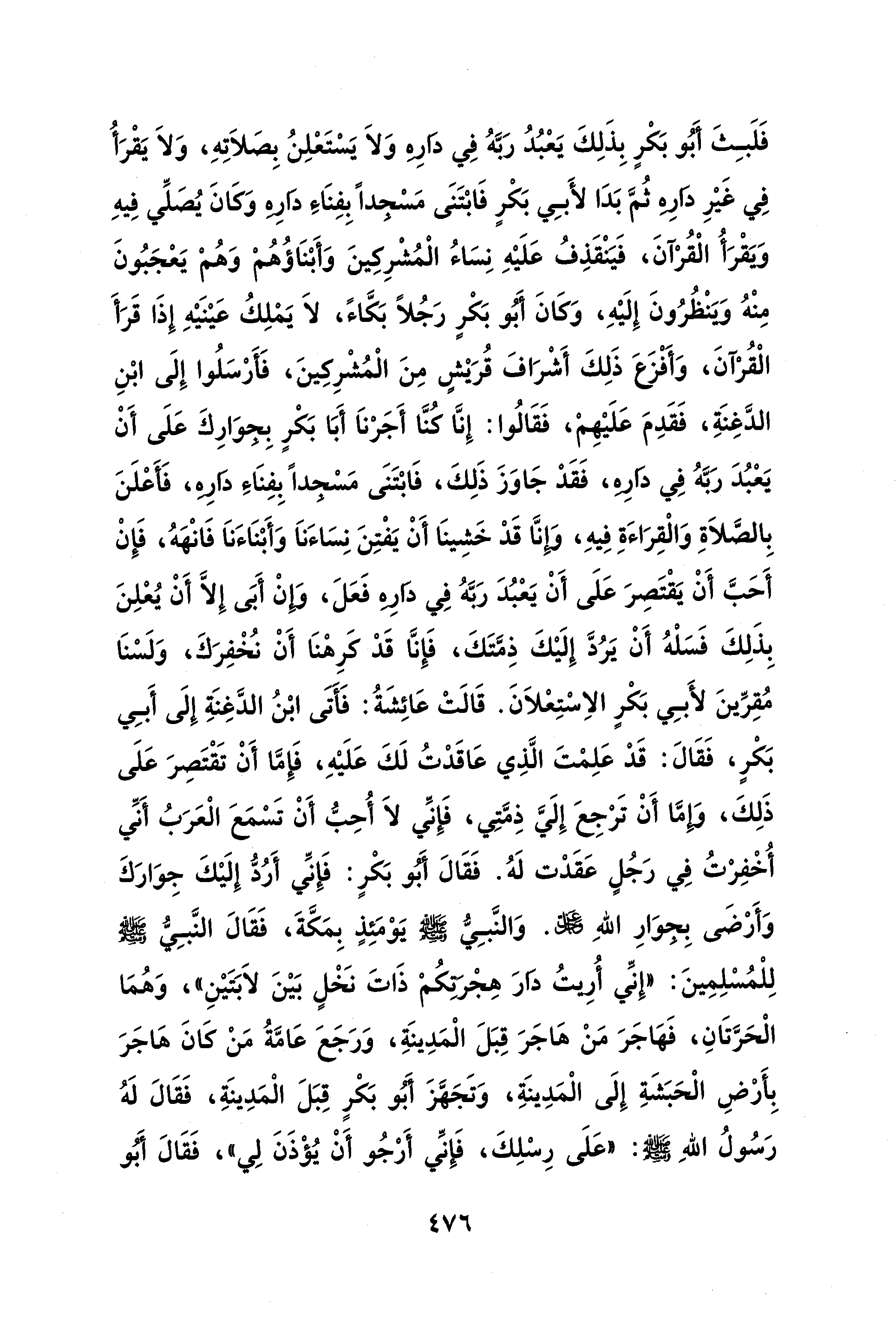 فَلَبِثَ أَبُو بَكْرٍ بِذَلِكَ يَعْبُدُ رَبَّهُ فِي دَارِهِ وَلاَ يَسْتَعْلِنُ بِصَلاَتِهِ، وَلاَ يَقْرَأُ فِي غَيْرِ دارِهِ ثُمَّ بَدَا لأَبِي بَكْرٍ فَابْتَنَى مَسْجِدًا بِفِنَاءِ دارِهِ وَكَانَ يُصَلِّي فِيهِ وَيَقْرَأُ الْقُرْآنَ، فَيَنْقَذِفُ عَلَيْهِ نِسَاءُ الْمُشْرِكينَ وَأَبْنَاؤُهُم وَهُمْ يَعْجَبُونَ مِنْهُ وَيَنْظُرُونَ إِلَيْهِ، وَكَانَ أَبُو بَكْرٍ رَجُلًا بَكَّاءً، لاَ يَمْلِكُ عَيْنَيْهِ إِذَا قَرَأَ الْقُرْآنَ، وَأَفْزَعَ ذَلِكَ أَشْرَافَ قُرَيْشٍ مِنَ الْمُشْرِكينَ، فَأَرْسَلُوا إِلَى ابْنِ الدَّغِنَةِ، فَقَدِمَ عَلَيْهِمْ، فَقَالُوا: إِنَّا كُنَّا أَجَرْناَ أَبَا بَكْرٍ بِجِوَارِكَ عَلَى أَنْ يَعْبُدَ رَبَّهُ فِي دارِهِ، فَقَدْ جَاوَزَ ذَلِكَ، فَابْتَنَى مَسْجدًا بِفِنَاءِ دارِهِ، فَأَعْلَنَ بِالصَّلاَةِ وَالْقِرَاءَةِ فِيهِ، وَإِنَّا قَدْ خَشِينَا أَنْ يَفْتِنَ نِسَاءَناَ وَأَبْنَاءَناَ فَانْهَهُ، فَإِنْ أَحَبَّ أَنْ يَقْتَصِرَ عَلَى أَنْ يَعْبُدَ رَبَّهُ فِي دارِهِ فَعَلَ، وَإِنْ أَبَى إِلَّا أَنْ يُعْلِنَ بِذَلِكَ فَسَلْهُ أَنْ يَرُدَّ إِلَيْكَ ذِمَّتَكَ، فَإِنَّا قَدْ كَرِهْنَا أَنْ نُخْفِرَكَ، وَلَسْنَا مُقِرِّينَ لأَبِي بَكْرٍ الاِسْتِعْلاَنَ. قَالَتْ عَائِشَةُ: فَأَتَى ابْنُ الدَّغِنَةِ إِلَى أَبِي بَكْرٍ، فَقَالَ: قَدْ عَلِمْتَ الَّذِي عَاقَدْتُ لَكَ عَلَيْهِ، فَإِمَّا أَنْ تَقْتَصِرَ عَلَى ذَلِكَ، وإِمَّا أَنْ تَرْجِعَ إِلَيَّ ذِمَّتِي، فَإِنِّي لاَ أُحِبُّ أَنْ تَسْمَعَ الْعَرَبُ أَنِّي أُخْفِرْتُ فِي رَجُلٍ عَقَدْت لَهُ. فَقَالَ أَبُو بَكْرٍ: فَإِنِّي أَرُدُّ إِلَيْكَ جِوَارَكَ وَأَرْضَى بِجوَارِ اللهِ عز وجل. وَالنَّبِيُّ - صلى الله عليه وسلم - يَوْمَئِذٍ بِمَكَّةَ، فَقَالَ النَّبِيُّ - صلى الله عليه وسلم - لِلْمُسْلِمِينَ: "إِنِّي أُرِيتُ دَارَ هِجْرَتِكُمْ ذَاتَ نَخْلٍ بَيْنَ لاَبَتَيْنِ"، وَهُمَا الْحَرَّتَانِ، فَهَاجَرَ مَنْ هَاجَرَ قِبَلَ الْمَدِينَةِ، وَرَجَعَ عَامَّةُ مَنْ كَانَ هَاجَرَ بِأَرْضِ الْحَبَشَةِ إِلَى الْمَدِينَةِ، وَتَجَهَّزَ أَبُو بَكْرٍ قِبَلَ الْمَدِينَةِ، فَقَالَ لَهُ رَسُولُ اللهِ - صلى الله عليه وسلم -: "عَلَى رِسْلِكَ، فَإِنِّي أَرْجُو أَنْ يُؤْذَنَ لِي"، فَقَالَ أَبُو
