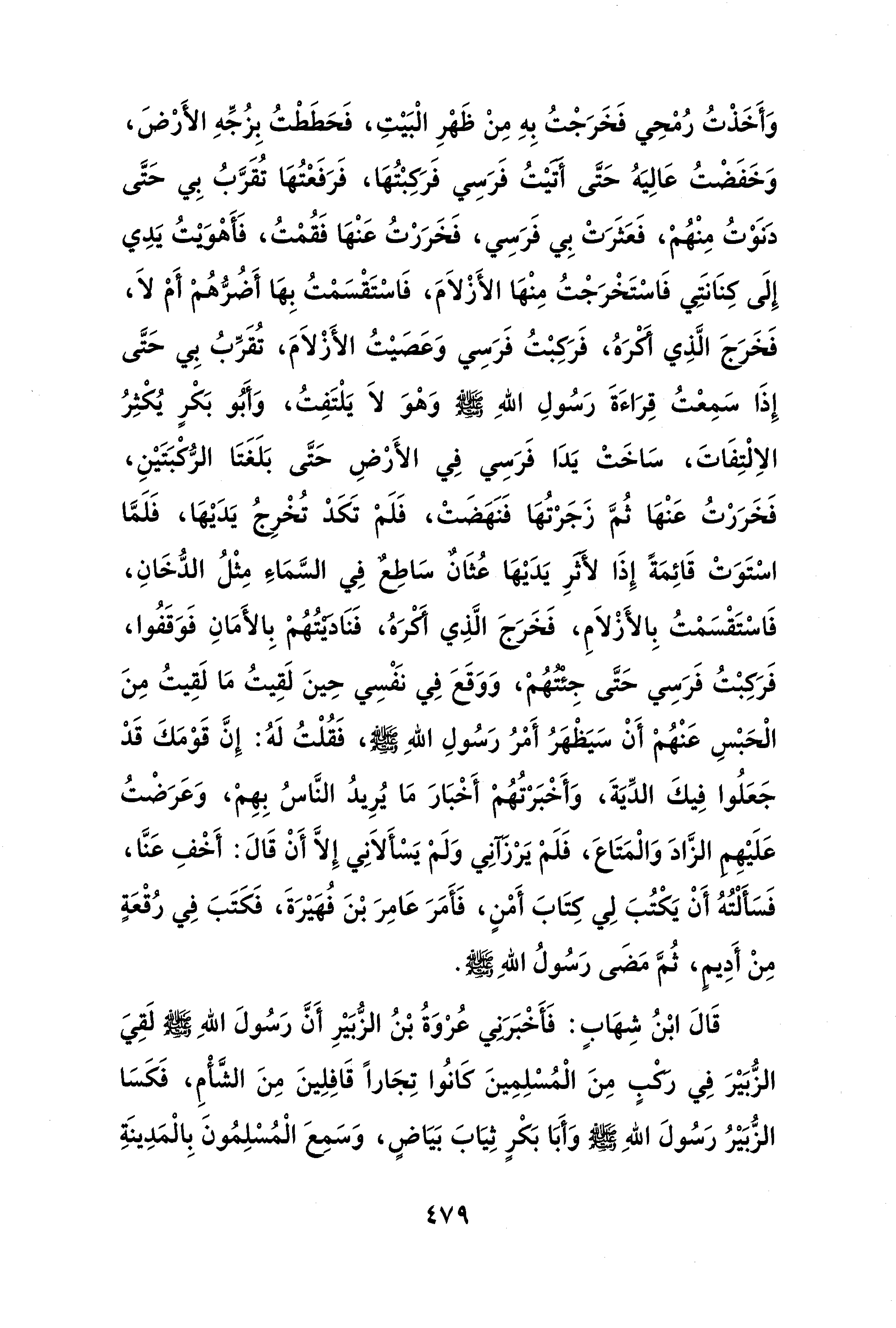 قَالَ ابْنُ شِهَابٍ: فَأَخْبَرَنِي عُرْوَةُ بْنُ الزُّبَيْرِ أَنَّ رَسُولَ اللهِ - صلى الله عليه وسلم - لَقِيَ الزُّبَيْرَ فِي رَكْبٍ مِنَ الْمُسْلِمِينَ كَانُوا تِجَارًا قَافِلِينَ مِنَ الشَّأْمِ، فَكَسَا الزُّبَيْرُ رَسُولَ اللهِ - صلى الله عليه وسلم - وَأَبَا بَكْرٍ ثِيَابَ بَيَاضٍ، وَسَمِعَ الْمُسْلِمُونَ بِالْمَدِينَةِ