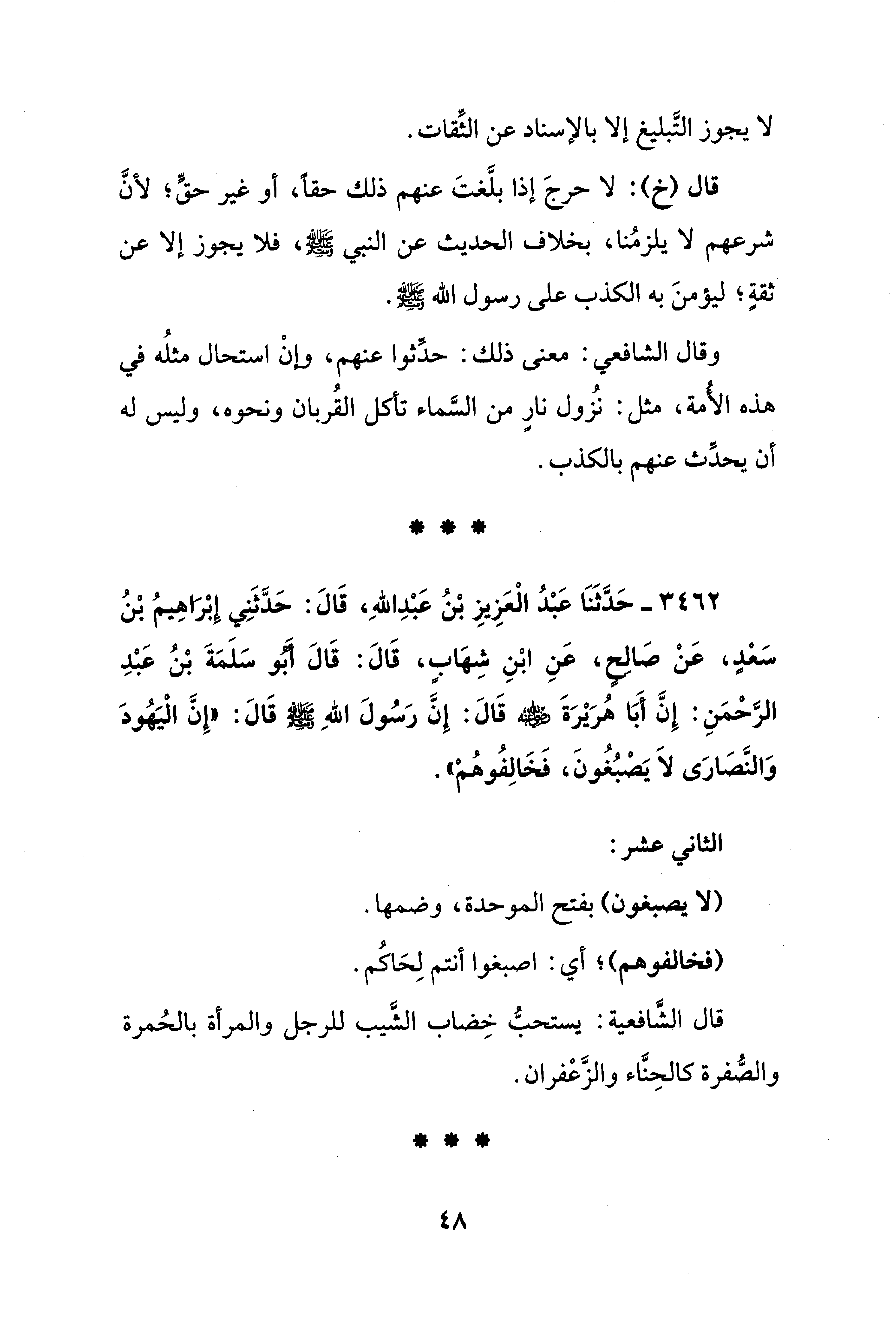3462 - حَدَّثَنَا عَبْدُ الْعَزِيزِ بْنُ عَبْدِ اللهِ، قَالَ: حَدَّثَنِي إِبْرَاهِيمُ بْنُ سَعْدٍ، عَنْ صَالِحٍ، عَنِ ابْنِ شِهَابٍ، قَالَ: قَالَ أَبُو سَلَمَةَ بْنُ عَبْدِ الرَّحْمَنِ: إِنَّ أَبَا هُرَيرَةَ - رضي الله عنه - قَالَ: إِنَّ رَسُولَ اللهِ - صلى الله عليه وسلم - قَالَ: "إِنَّ الْيَهُودَ وَالنَّصَارَى لاَ يَصْبُغُونَ، فَخَالِفُوهُمْ".