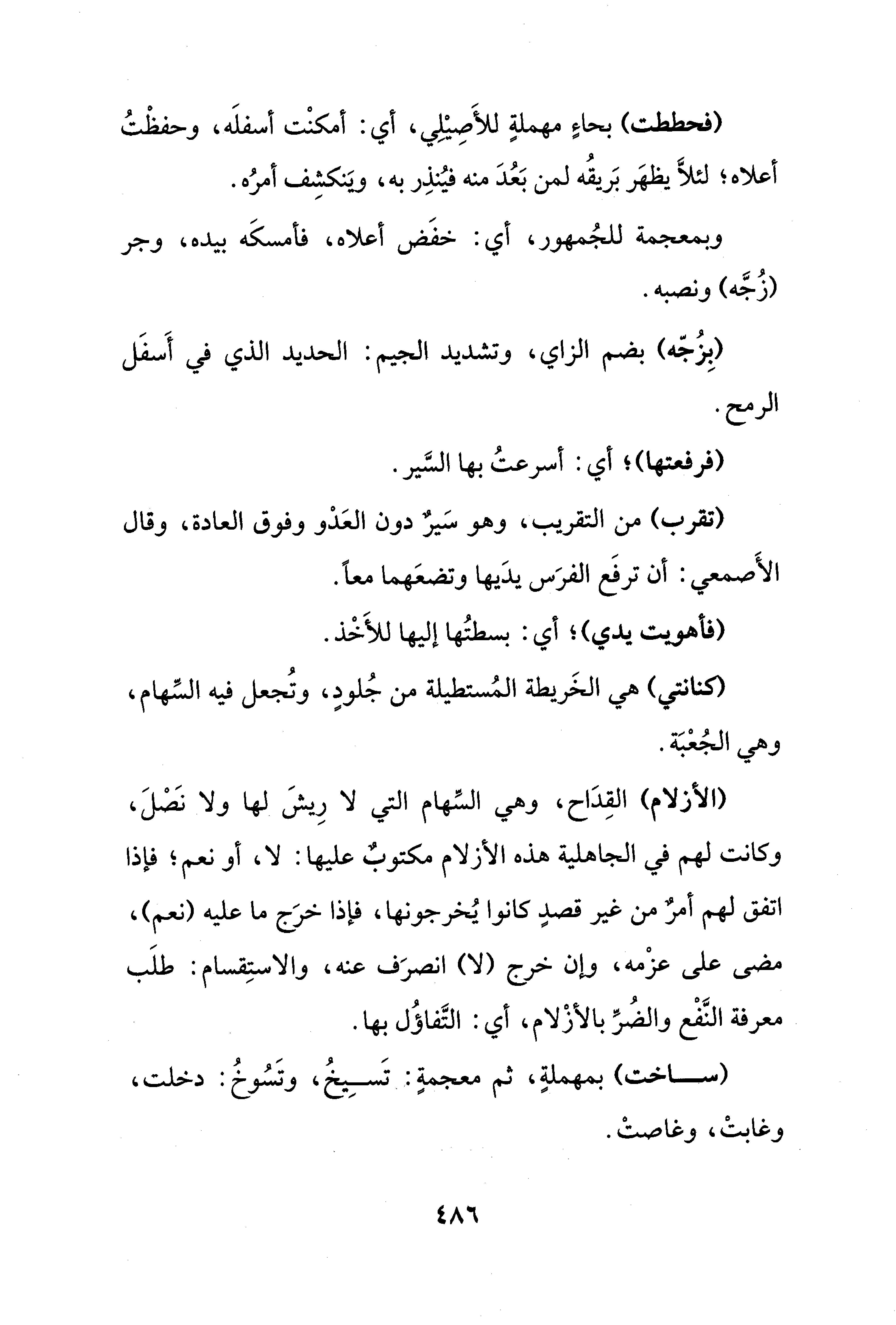 (الأزلام) القِدَاح، وهي السِّهام التي لا رِيشَ لها ولا نَصْلَ، وكانت لهم في الجاهلية هذه الأزلام مكتوبٌ عليها: لا، أو نعم؛ فإذا اتفق لهم أمرٌ من غير قصدٍ كانوا يُخرجونها، فإذا خرَج ما عليه (نعم)، مضى على عزْمه، وإن خرج (لا) انصرَف عنه، والاستِقسام: طلَب معرفة النَّفْع والضُرِّ بالأزْلام، أي: التَّفاؤُل بها.
