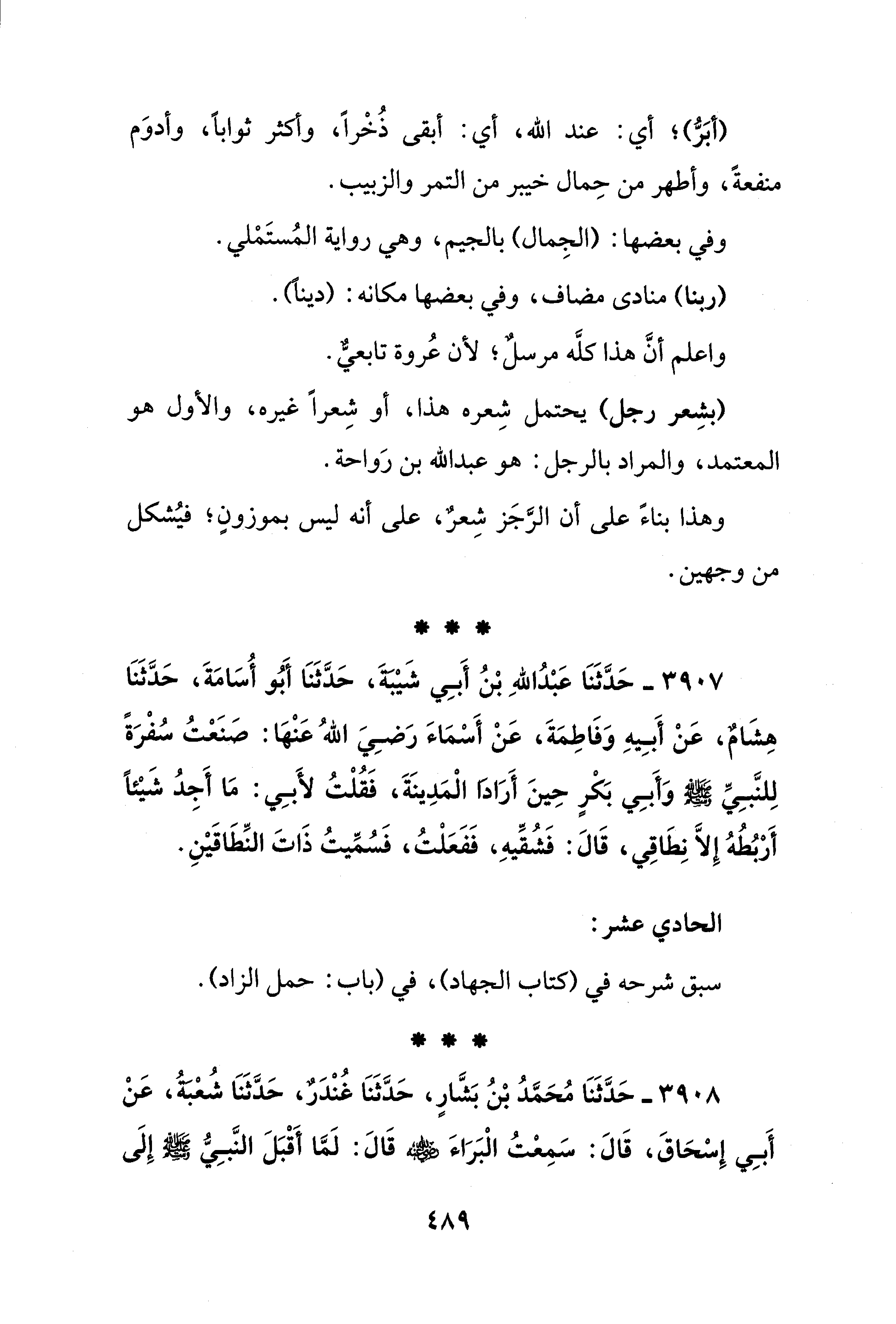 3907 - حَدَّثَنَا عَبْدُ اللهِ بْنُ أَبِي شَيْبَةَ، حَدَّثَنَا أَبُو أُسَامَةَ، حَدَّثَنَا هِشَامٌ، عَنْ أَبِيهِ وَفَاطِمَةَ، عَنْ أَسْمَاءَ رَضِيَ اللهُ عَنْهَا: صَنَعْتُ سُفرَةً لِلنَّبِيِّ - صلى الله عليه وسلم - وَأَبِي بَكْرٍ حِينَ أَرَادَا الْمَدِينَةَ، فَقُلْتُ لأَبِي: مَا أَجِدُ شَيْئًا أَرْبُطُهُ إِلَّا نِطَاقِي، قَالَ: فَشُقِّيهِ، فَفَعَلْتُ، فَسُمِّيتُ ذَاتَ النِّطَاقَيْنِ.