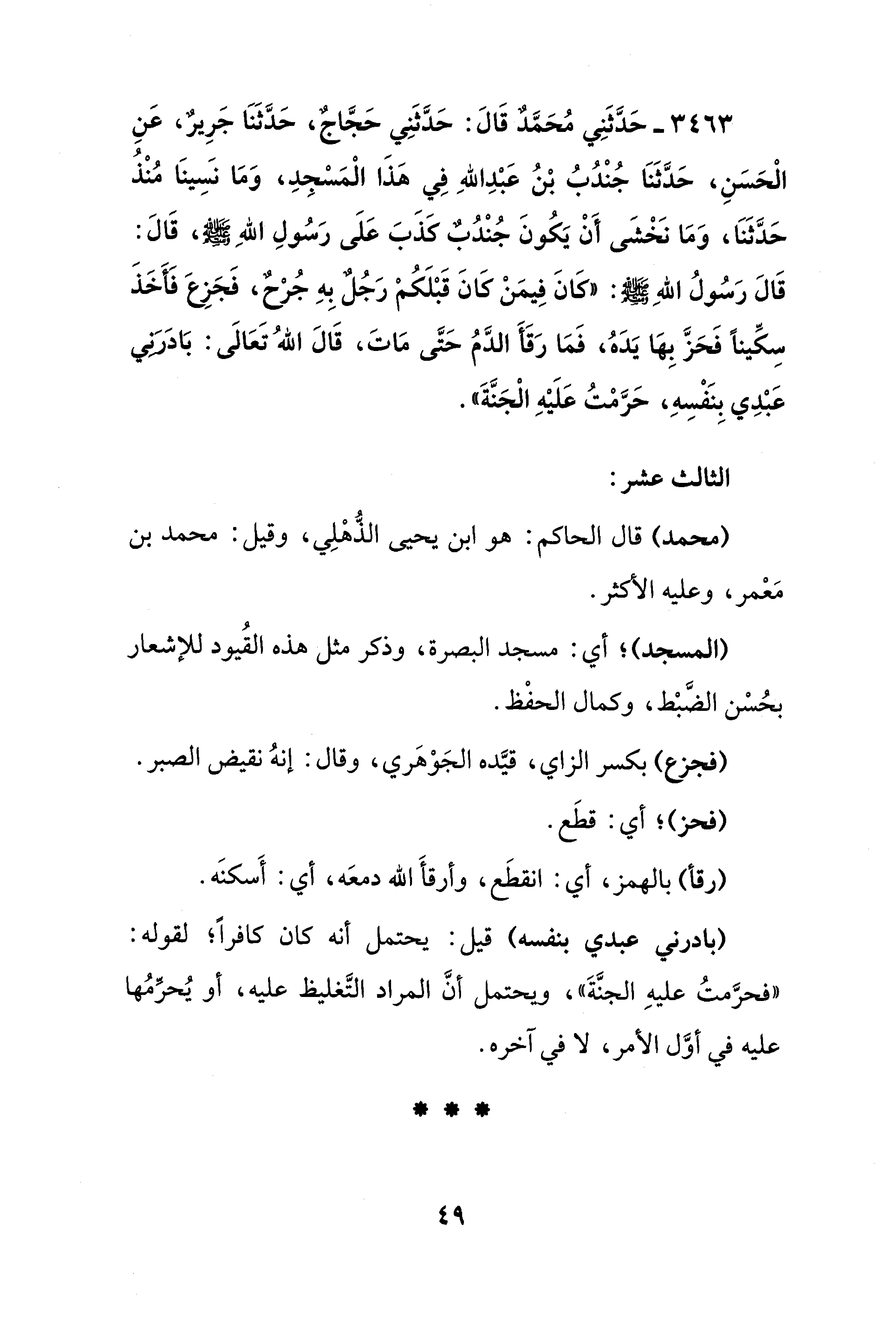 3463 - حَدَّثَنِي مُحَمَّدٌ قَالَ: حَدَّثَنِي حَجَّاجٌ، حَدَّثَنَا جَرِيرٌ، عَنِ الْحَسَنِ، حَدَّثَنَا جُنْدُبُ بْنُ عَبْدِ اللهِ فِي هَذَا الْمَسْجدِ، وَمَا نَسِينَا مُنْذُ حَدَّثَنَا، وَمَا نَخْشَى أَنْ يَكُونَ جُنْدُبٌ كَذَبَ عَلَى رَسُولِ اللهِ - صلى الله عليه وسلم -، قَالَ: قَالَ رَسُولُ اللهِ - صلى الله عليه وسلم -: "كَانَ فِيمَنْ كَانَ قَبْلَكُمْ رَجُلٌ بِهِ جُرْحٌ، فَجَزِعَ فَأَخَذَ سِكِّينًا فَحَزَّ بِهَا يَدَهُ، فَمَا رَقَأَ الدَّمُ حَتَّى مَاتَ، قَالَ اللهُ تَعَالَى: بَادَرَنِي عَبْدِي بِنَفْسِهِ، حَرَّمْتُ عَلَيْهِ الْجَنَّةَ".
