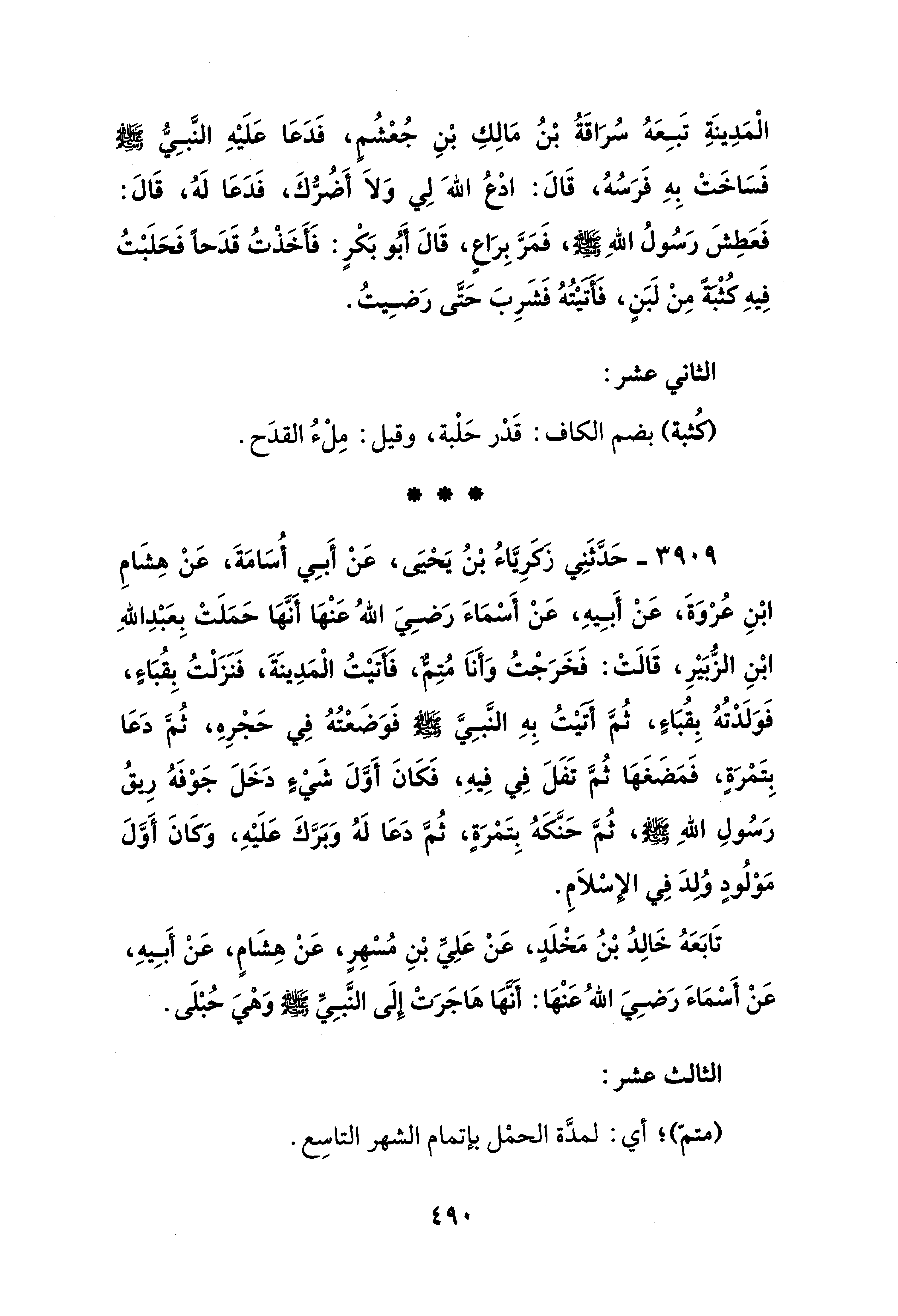 3909 - حَدَّثَنِي زَكَرِيَّاءُ بْنُ يَحْيَى، عَنْ أَبِي أسُامَةَ، عَنْ هِشَامِ ابْنِ عُرْوَةَ، عَنْ أَبِيهِ، عَنْ أَسْمَاءَ رَضِيَ اللهُ عَنْهَا أَنَّهَا حَمَلَتْ بِعَبْدِ اللهِ ابْنِ الزُّبَيْرِ، قَالَتْ: فَخَرَجْتُ وَأَنَا مُتِمٌّ، فَأَتَيْتُ الْمَدِينَةَ، فَنَزَلْتُ بِقُبَاءٍ، فَوَلَدْتُهُ بِقُبَاءٍ، ثُمَّ أَتَيْتُ بِهِ النَّبِيَّ - صلى الله عليه وسلم - فَوَضَعْتُهُ فِي حَجْرِهِ، ثُمَّ دَعَا بِتَمْرَةٍ، فَمَضَغَهَا ثُمَّ تَفَلَ فِي فِيهِ، فَكَانَ أَوَّلَ شَيْءٍ دَخَلَ جَوْفَهُ رِيقُ رَسُولِ اللهِ - صلى الله عليه وسلم -، ثُمَّ حَنَّكَهُ بِتَمْرَةٍ، ثُمَّ دَعَا لَهُ وَبَرَّكَ عَلَيْهِ، وَكَانَ أَوَّلَ مَوْلُودٍ وُلِدَ فِي الإِسْلاَمِ.