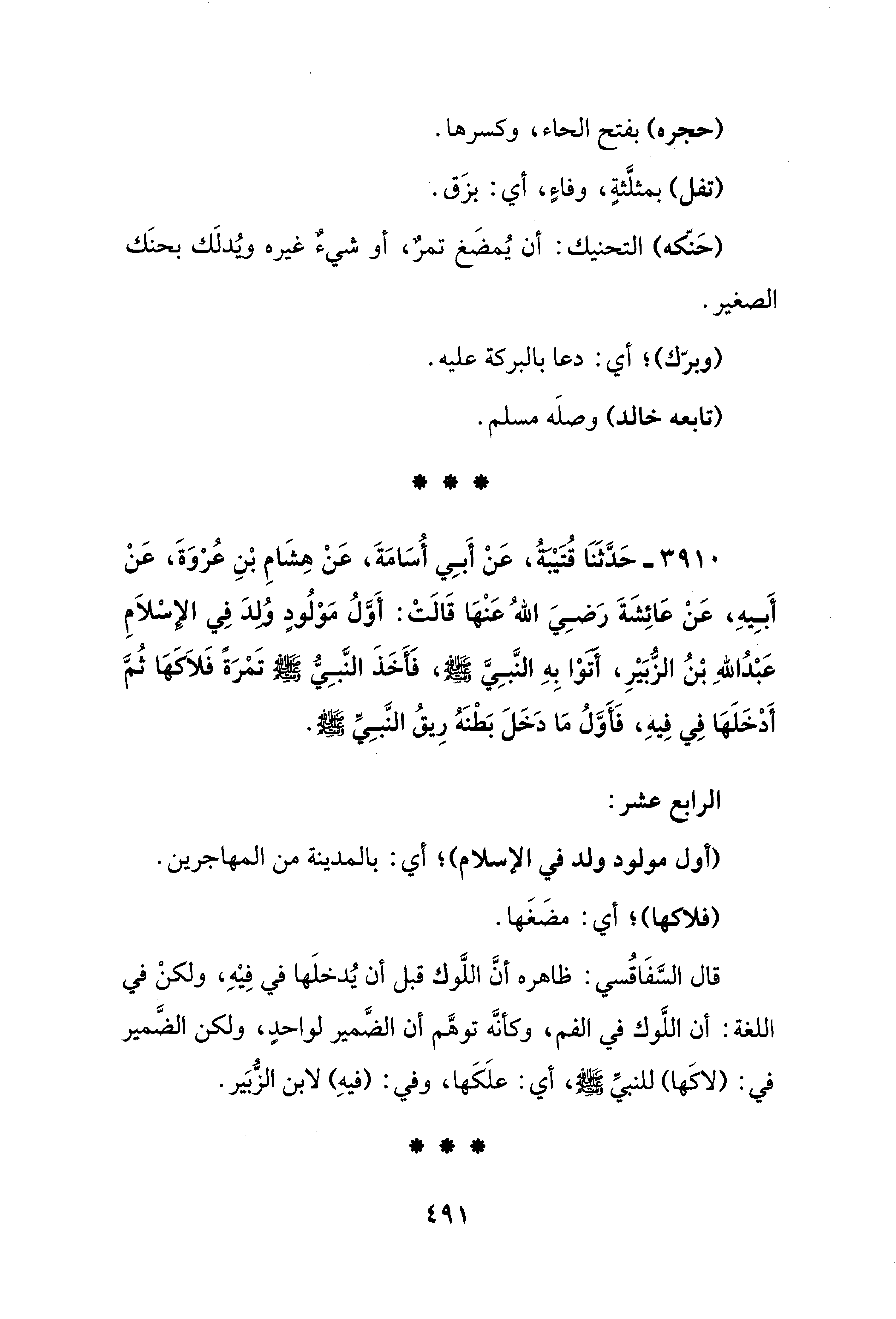 3910 - حَدَّثَنَا قُتَيْبَةُ، عَنْ أَبِي أُسَامَةَ، عَنْ هِشَامِ بْنِ عُرْوَةَ، عَنْ أَبِيهِ، عَنْ عَائِشَةَ رَضِيَ اللهُ عَنْهَا قَالَتْ: أَوَّلُ مَوْلُودٍ وُلِدَ فِي الإِسْلاَمِ عَبْدُ اللهِ بْنُ الزُّبَيْرِ، أَتَوْا بِهِ النَّبِيَّ - صلى الله عليه وسلم -، فَأَخَذَ النَّبِيُّ - صلى الله عليه وسلم - تَمْرَةً فَلاَكَهَا ثُمَّ أَدْخَلَهَا فِي فِيهِ، فَأَوَّلُ مَا دَخَلَ بَطْنَهُ رِيقُ النَّبِيِّ - صلى الله عليه وسلم -.
