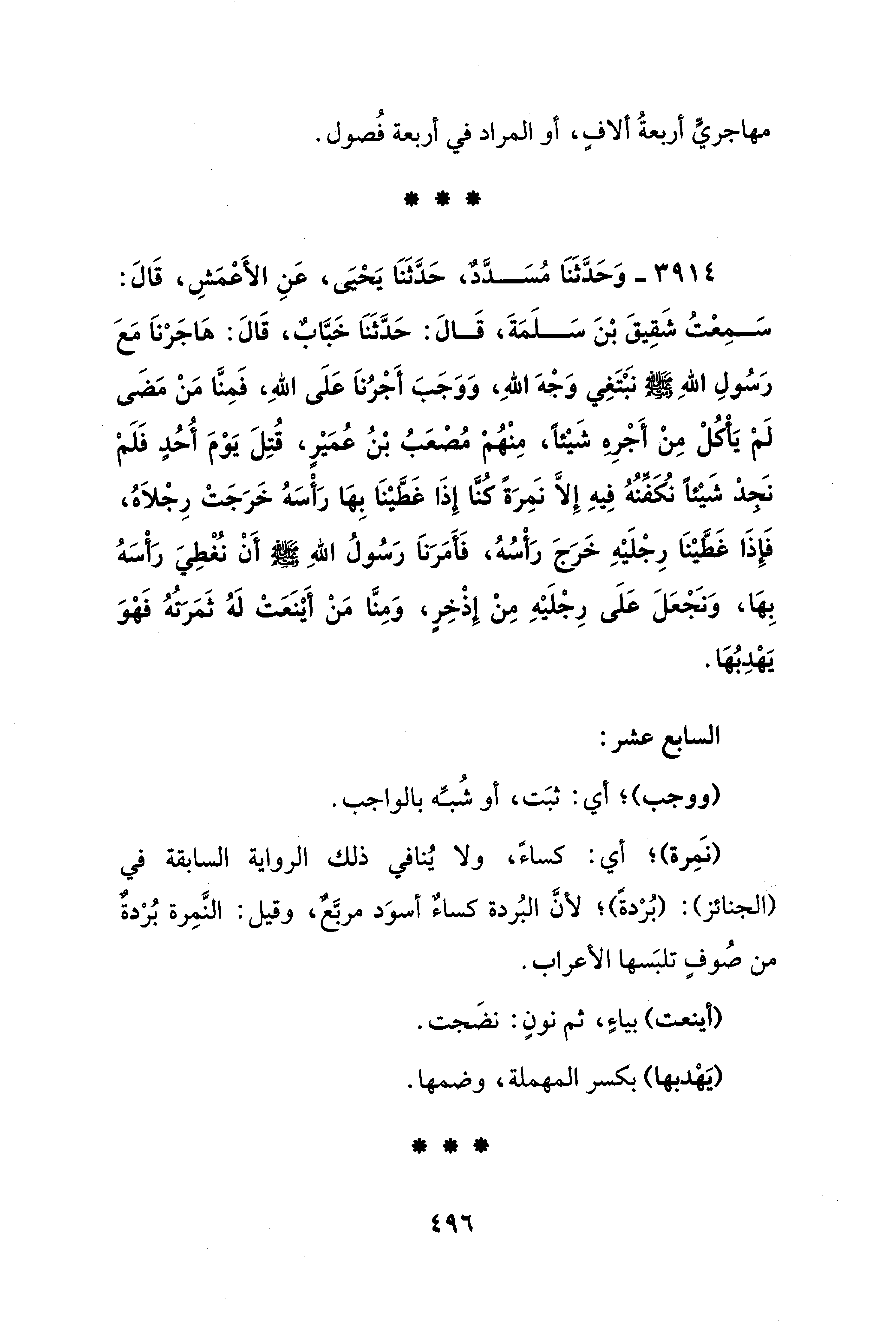 3914 - وَحَدَّثَنَا مُسَدَّدٌ، حَدَّثَنَا يَحْيَى، عَنِ الأَعْمَشِ، قَالَ: سَمِعْتُ شَقِيقَ بْنَ سَلَمَةَ، قَالَ: حَدَّثَنَا خَبَّابٌ، قَالَ: هَاجَرْناَ مَعَ رَسُولِ اللهِ - صلى الله عليه وسلم - نَبْتَغِي وَجْهَ اللهِ، وَوَجَبَ أَجْرُناَ عَلَى اللهِ، فَمِنَّا مَنْ مَضَى لَمْ يَأْكُلْ مِنْ أَجْرِه شَيْئًا، مِنْهُمْ مُصْعَبُ بْنُ عُمَيْرٍ، قُتِلَ يَوْمَ أُحُدٍ فَلَمْ نَجدْ شَيْئًا نُكَفِّنُهُ فِيهِ إِلَّا نَمِرَةً كُنَّا إِذَا غَطَّيْنَا بِهَا رَأْسَهُ خَرَجَتْ رِجْلاَهُ، فَإِذَا غَطَّيْنَا رِجْلَيْهِ خَرَجَ رَأْسُهُ، فَأَمَرَناَ رَسُولُ اللهِ - صلى الله عليه وسلم - أَنْ نُغْطِيَ رَأْسَهُ بِهَا، وَنَجْعَلَ عَلَى رِجْلَيْهِ مِنْ إِذْخِرٍ، وَمِنَّا مَنْ أَيْنَعَتْ لَهُ ثَمَرتُهُ فَهْوَ يَهْدِبُهَا.