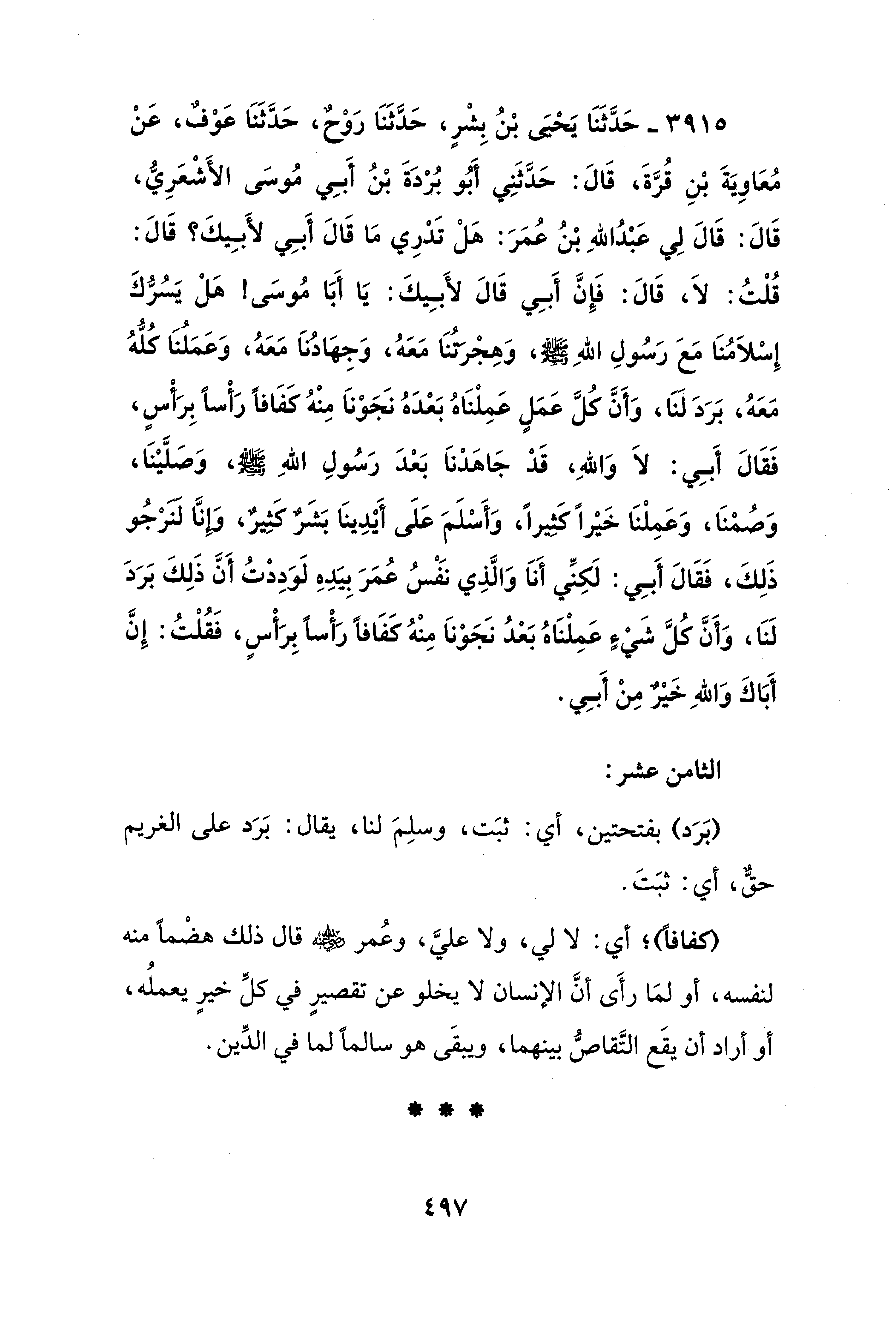 3915 - حَدَّثَنَا يَحْيَى بْنُ بِشْرٍ، حَدَّثَنَا رَوْحٌ، حَدَّثَنَا عَوْفٌ، عَنْ مُعَاوِيَةَ بْنِ قُرَّةَ، قَالَ: حَدَّثَنِي أَبُو بُرْدَةَ بْنُ أَبِي مُوسَى الأَشْعَرِيُّ، قَالَ: قَالَ لِي عَبْدُ اللهِ بْنُ عُمَرَ: هَلْ تَدْرِي مَا قَالَ أَبِي لأَبِيكَ؟ قَالَ: قُلْتُ: لاَ، قَالَ: فَإِنَّ أَبِي قَالَ لأَبِيكَ: يَا أَبَا مُوسَى! هَلْ يَسُرُّكَ إِسْلاَمُنَا مَعَ رَسُولِ اللهِ - صلى الله عليه وسلم -، وَهِجْرَتُنَا مَعَهُ، وَجِهَادُناَ مَعَهُ، وَعَمَلُنَا كُلُّهُ مَعَهُ، بَرَدَ لَنَا، وَأَنَّ كُلَّ عَمَلٍ عَمِلْنَاهُ بَعْدَهُ نَجَوْنَا مِنْهُ كَفَافًا رَأْسًا بِرَأْسٍ، فَقَالَ أَبِي: لاَ وَاللهِ، قَدْ جَاهَدْناَ بَعْدَ رَسُولِ اللهِ - صلى الله عليه وسلم -، وَصَلَّيْنَا، وَصُمْنَا، وَعَمِلْنَا خَيْرًا كَثِيرًا، وَأَسْلَمَ عَلَى أَيْدِينَا بَشَرٌ كَثِيرٌ، وَإِنَّا لنرْجُو ذَلِكَ، فَقَالَ أَبِي: لَكِنِّي أَنَا وَالَّذِي نَفْسُ عُمَرَ بِيَدِهِ لَوَدِدْتُ أَنَّ ذَلِكَ بَرَدَ لنا، وَأَنَّ كُلَّ شَيْءٍ عَمِلْنَاهُ بَعْدُ نَجَوْناَ مِنْهُ كَفَافًا رَأْسًا بِرَأْسٍ، فَقُلْتُ: إِنَّ أَبَاكَ وَاللهِ خَيْرٌ مِنْ أَبِي.