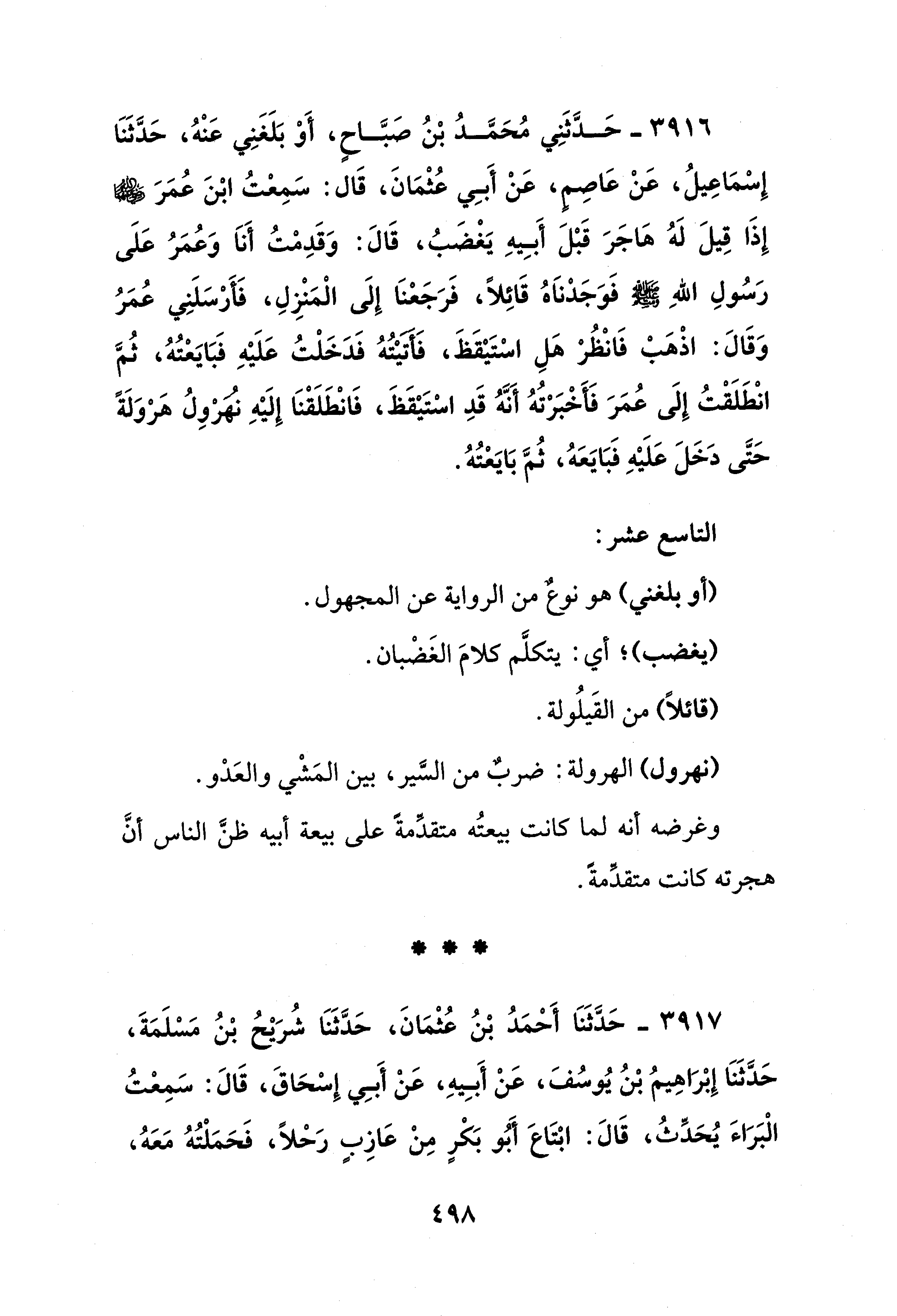 3916 - حَدَّثَنِي مُحَمَّدُ بْنُ صَبَّاحٍ، أَوْ بَلَغَنِي عَنْهُ، حَدَّثَنَا إِسْمَاعِيلُ، عَنْ عَاصِمٍ، عَنْ أَبِي عُثْمَانَ، قَال: سَمِعْتُ ابْنَ عُمَرَ - رضي الله عنهما - إِذَا قِيلَ لَهُ هَاجَرَ قَبْلَ أَبِيهِ يَغْضَبُ، قَالَ: وَقَدِمْتُ أَنَا وَعُمَرُ عَلَى رَسُولِ اللهِ - صلى الله عليه وسلم - فَوَجَدْناَهُ قَائِلًا، فَرَجَعْنَا إِلَى الْمَنْزِلِ، فَأَرْسَلَنِي عُمَرُ وَقَالَ: اذْهَبْ فَانْظُرْ هَلِ اسْتَيْقَظَ، فَأَتَيْتُهُ فَدَخَلْتُ عَلَيْهِ فَبَايَعْتُهُ، ثُمَّ انْطَلَقْتُ إِلَى عُمَرَ فَأَخْبَرْتُهُ أَنَّهُ قَدِ اسْتَيْقَظَ، فَانْطَلَقْنَا إِلَيْهِ نُهَرْوِلُ هَرْوَلَةً حَتَّى دَخَلَ عَلَيْهِ فَبَايَعَهُ، ثُمَّ بَايَعْتُهُ.
