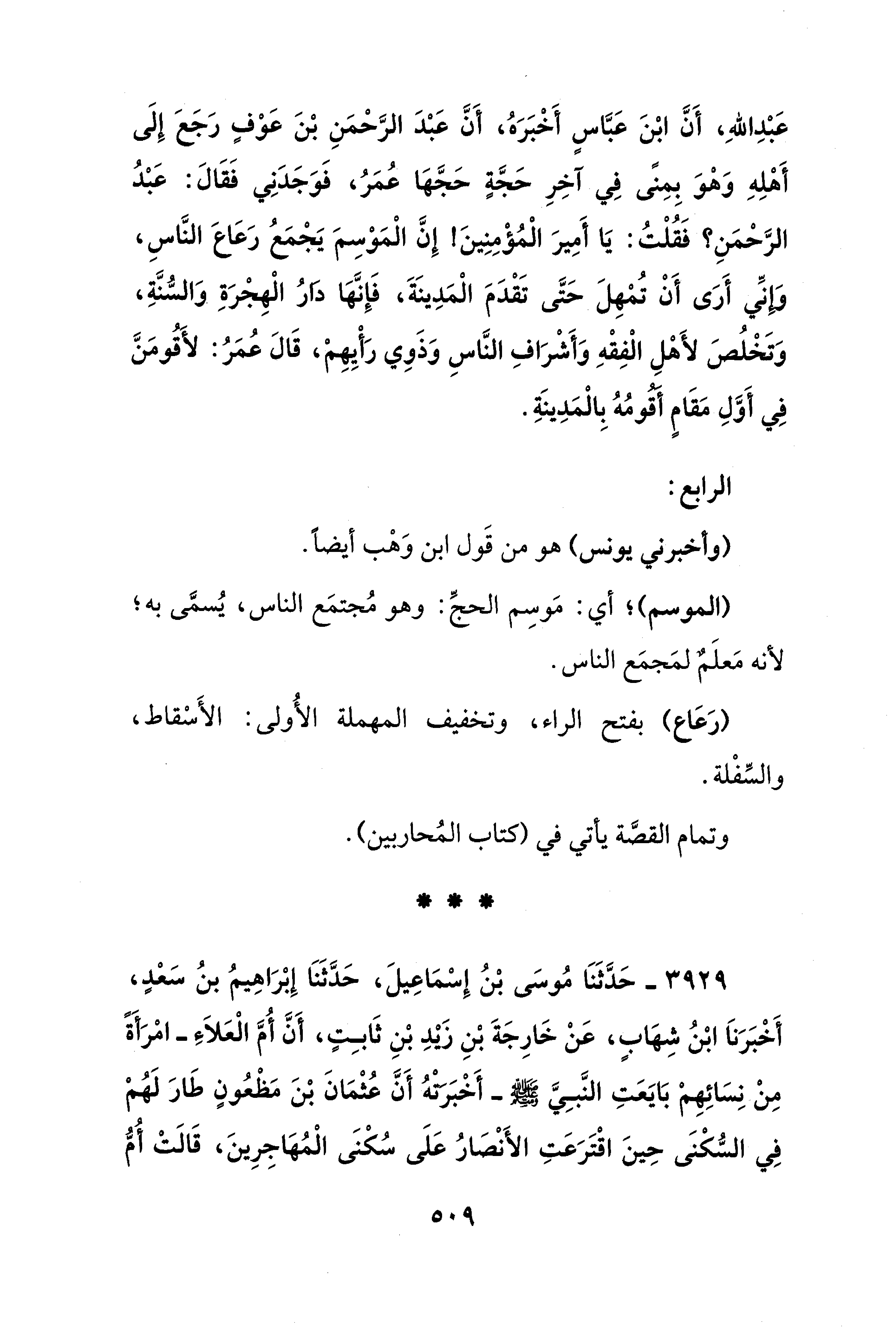 عَبْدِ اللهِ، أَنَّ ابْنَ عَبَّاسٍ أَخْبَرَهُ، أَنَّ عَبْدَ الرَّحْمَنِ بْنَ عَوْفٍ رَجَعَ إِلَى أَهْلِهِ وَهْوَ بِمِنًى فِي آخِرِ حَجَّةٍ حَجَّهَا عُمَرُ، فَوَجَدَنِي فَقَالَ: عَبْدُ الرَّحْمَنِ؟ فَقُلْتُ: يَا أَمِيرَ الْمُؤْمِنِينَ! إِنَّ الْمَوْسِمَ يَجْمَعُ رَعَاعَ النَّاسِ، وَإِنِّي أَرَى أَنْ تُمْهِلَ حَتَّى تَقْدَمَ الْمَدِينَةَ، فَإِنَّهَا دَارُ الْهِجْرَةِ وَالسُّنَّةِ، وَتَخْلُصَ لأَهْلِ الْفِقْهِ وَأَشْرَافِ النَّاسِ وَذَوِي رَأْيِهِمْ، قَالَ عُمَرُ: لأَقُومَنَّ فِي أَوَّلِ مَقَامٍ أَقُومُهُ بِالْمَدِينَةِ.