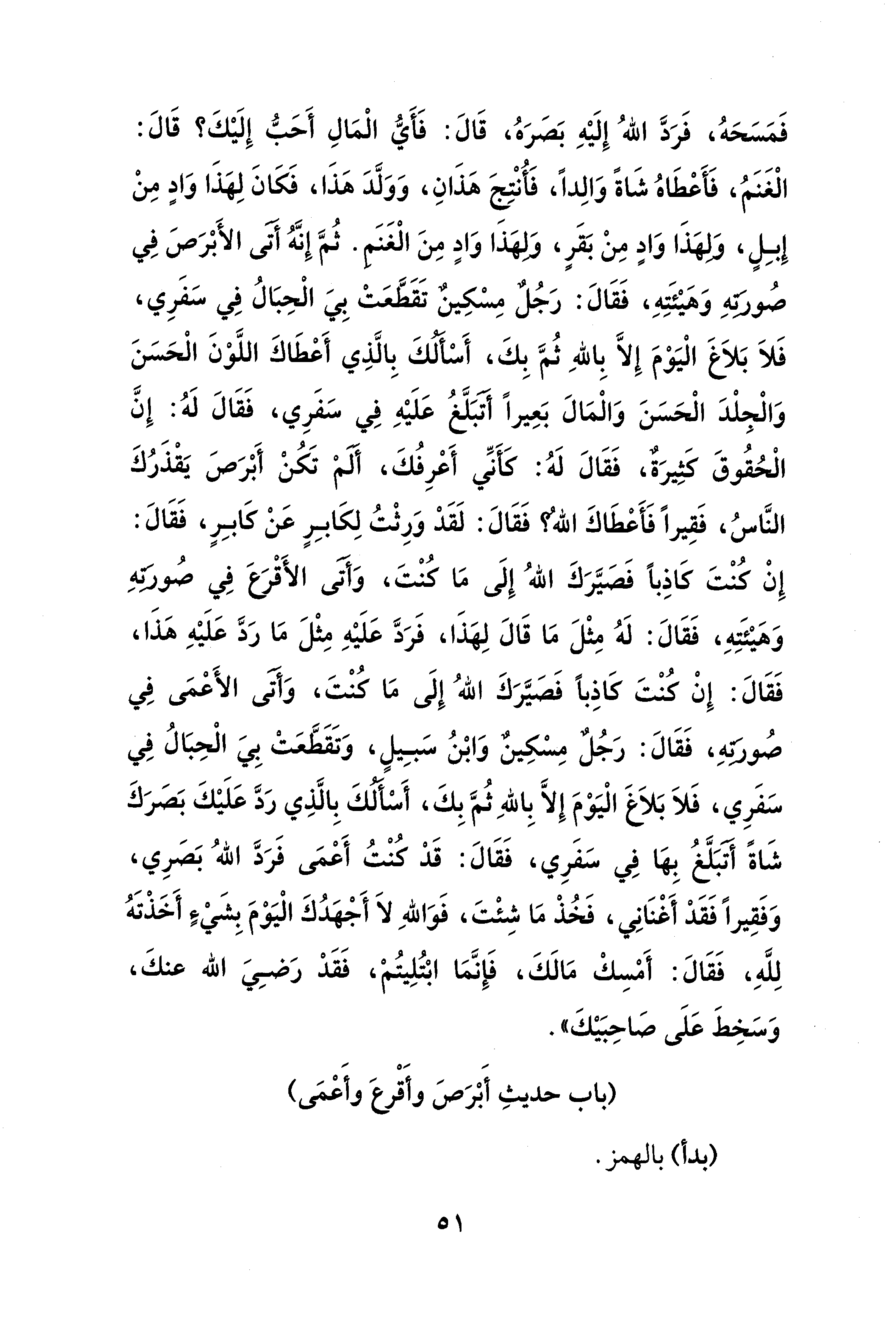 فَمَسَحَهُ، فَرَدَّ اللهُ إِلَيْهِ بَصَرَهُ، قَالَ: فَأَيُّ الْمَالِ أَحَبُّ إِلَيْكَ؟ قَالَ: الْغَنَمُ، فَأَعْطَاهُ شَاةً وَالِدًا، فَأُنْتِجَ هَذَانِ، وَوَلَّدَ هَذَا، فَكَانَ لِهَذَا وَادٍ مِنْ إِبِلٍ، وَلهَذَا وَادٍ مِنْ بَقَرٍ، وَلهَذَا وَادٍ مِنَ الْغَنَمِ. ثُمَّ إِنَّهُ أَتَى الأَبْرَصَ فِي صُورَتِهِ وَهَيْئَتِهِ، فَقَالَ: رَجُلٌ مِسْكِينٌ تَقَطَّعَتْ بِيَ الْحِبَالُ فِي سَفَرِي، فَلاَ بَلاَغَ الْيَوْمَ إِلَّا بِاللهِ ثُمَّ بِكَ، أَسْأَلُكَ بِالَّذِي أَعْطَاكَ اللَّوْنَ الْحَسَنَ وَالْجِلْدَ الْحَسَنَ وَالْمَالَ بَعِيرًا أَتبَلَّغُ عَلَيْهِ فِي سَفَرِي، فَقَالَ لَهُ: إِنَّ الْحُقُوقَ كَثِيرَةٌ، فَقَالَ لَهُ: كَأَنِّي أَعْرِفُكَ، أَلَمْ تَكُنْ أَبْرَصَ يَقْذَرُكَ النَّاسُ، فَقِيرًا فَأَعْطَاكَ اللهُ؟ فَقَالَ: لَقَدْ وَرِثْتُ لِكَابِرٍ عَنْ كَابِرٍ، فَقَالَ: إِنْ كنْتَ كَاذِبًا فَصَيَّرَكَ اللهُ إِلَى مَا كُنْتَ، وَأَتَى الأَقْرَعَ فِي صُورَتِهِ وَهَيْئَتِهِ، فَقَالَ: لَهُ مِثْلَ مَا قَالَ لِهَذَا، فَرَدَّ عَلَيْهِ مِثْلَ مَا رَدَّ عَلَيْهِ هَذَا، فَقَالَ: إِنْ كُنْتَ كَاذِبًا فَصَيَّرَكَ اللهُ إِلَى مَا كُنْتَ، وَأَتَى الأَعْمَى فِي صُورَتِهِ، فَقَالَ: رَجُلٌ مِسْكِينٌ وَابْنُ سَبِيلٍ، وَتَقَطَّعَتْ بِيَ الْحِبَالُ فِي سَفَرِي، فَلاَ بَلاَغَ الْيَوْمِ إِلَّا بِاللهِ ثُمَّ بِكَ، أَسْأَلُكَ بِالَّذِي رَدَّ عَلَيْكَ بَصَرَكَ شَاةً أتبَلَّغُ بِهَا فِي سَفرِي، فَقَالَ: قَدْ كُنْتُ أَعْمَى فَرَدَّ اللهُ بَصَرِي، وَفَقِيرًا فَقَدْ أَغْنَانِي، فَخُذْ مَا شِئْتَ، فَوَاللهِ لاَ أَجْهَدُكَ الْيَوْمَ بِشَيْءٍ أَخَذْتَهُ لِلَّهِ، فَقَالَ: أَمْسِكْ مَالَكَ، فَإِنَّمَا ابْتُلِيتُمْ، فَقَدْ رَضِيَ الله عنكَ، وَسَخِطَ عَلَى صَاحِبَيْكَ".