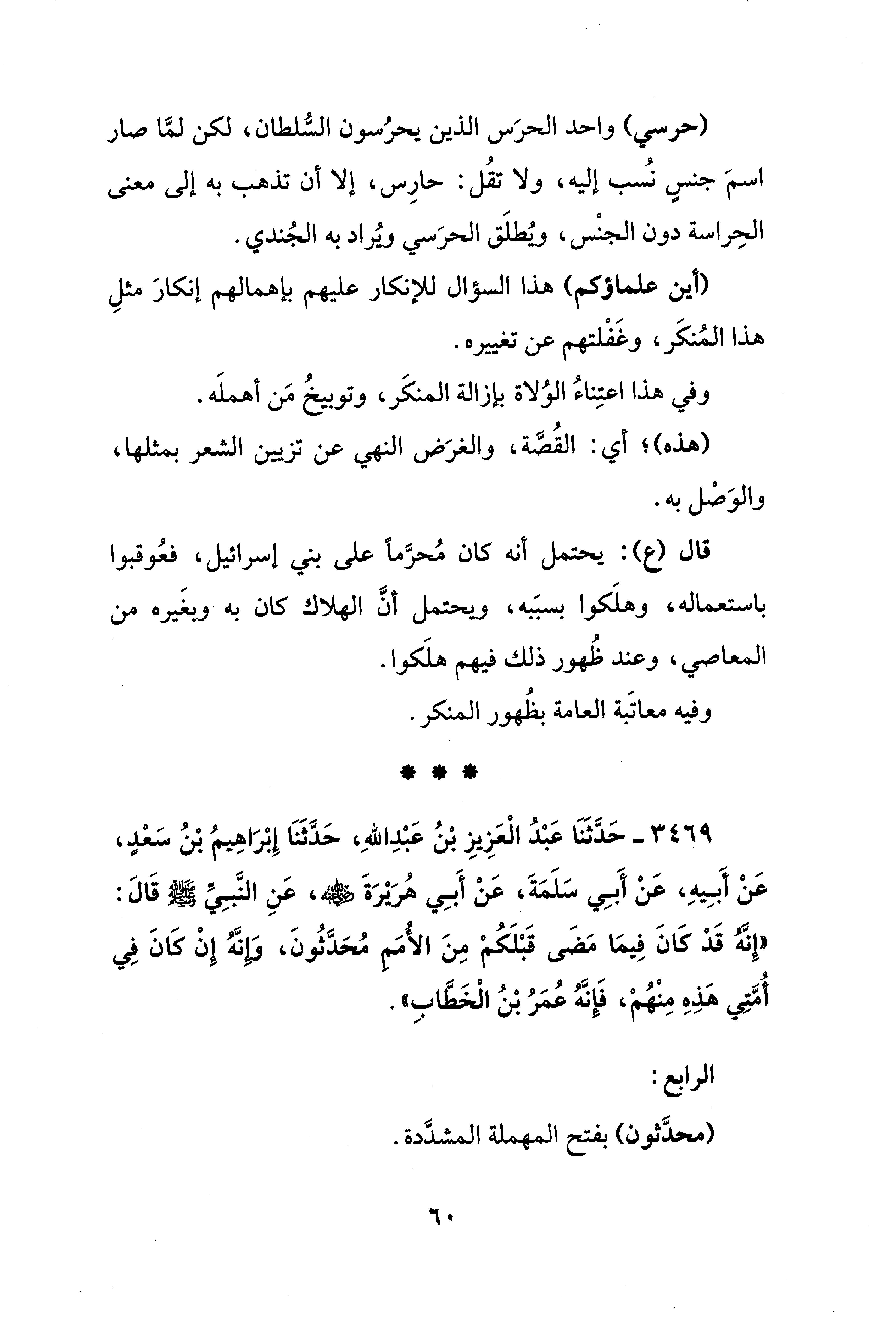 3469 - حَدَّثَنَا عَبْدُ الْعَزِيزِ بْنُ عَبْدِ اللهِ، حَدَّثَنَا إِبْرَاهِيمُ بْنُ سَعْدٍ، عَنْ أَبِيهِ، عَنْ أَبِي سَلَمَةَ، عَنْ أَبِي هُرَيْرَةَ - رضي الله عنه -، عَنِ النَّبِيِّ - صلى الله عليه وسلم - قَالَ: "إِنَّهُ قَدْ كَانَ فِيمَا مَضَى قَبْلَكُمْ مِنَ الأُمَمِ مُحَدَّثُونَ، وَإِنَّهُ إِنْ كَانَ فِي أُمَّتِي هَذِهِ مِنْهُمْ، فَإِنَّهُ عُمَرُ بْنُ الْخَطَّابِ".