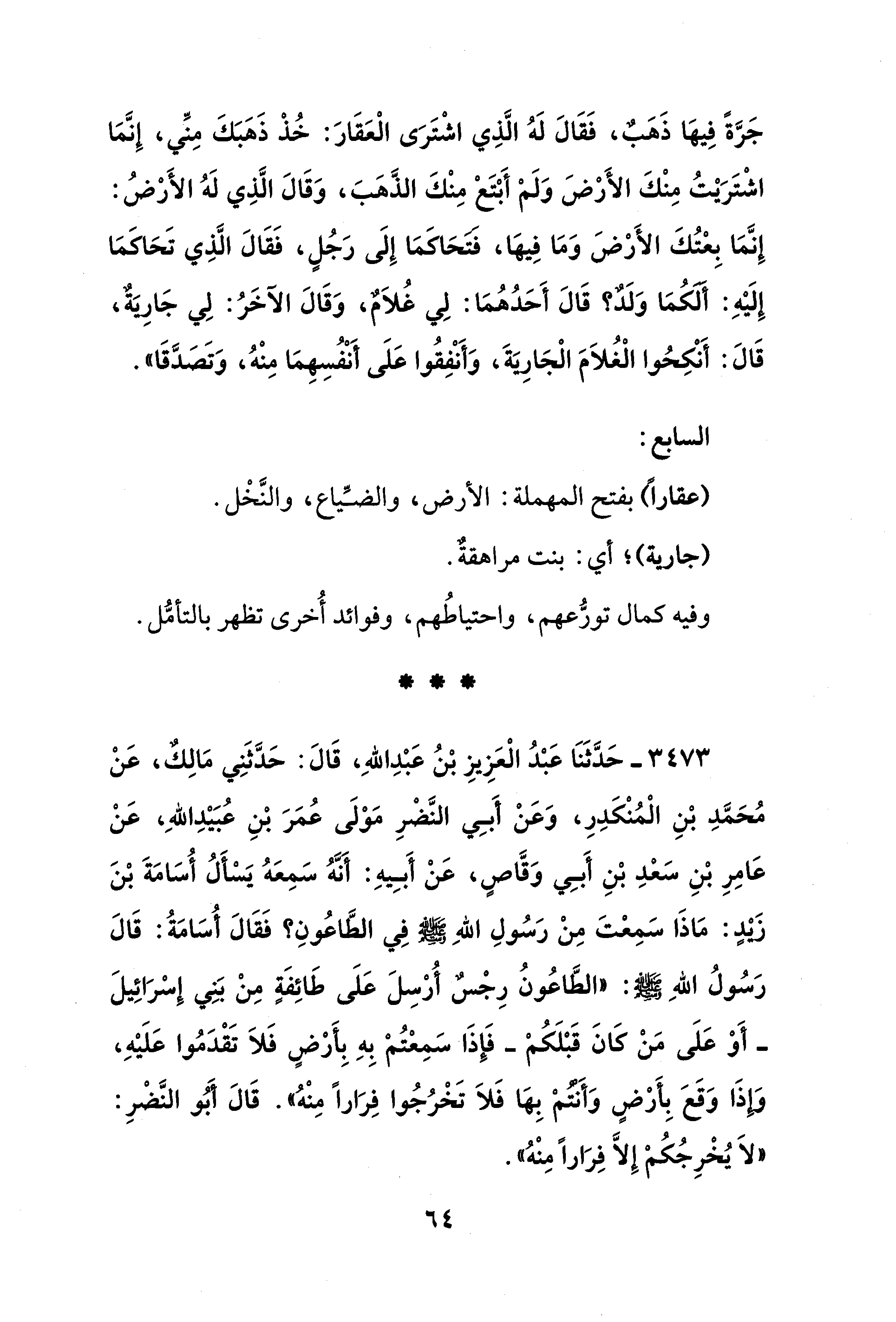 3473 - حَدَّثَنَا عَبْدُ الْعَزِيزِ بْنُ عَبْدِ اللهِ، قَالَ: حَدَّثَنِي مَالِكٌ، عَنْ مُحَمَّدِ بْنِ الْمُنْكَدِرِ، وَعَنْ أَبِي النَّضْرِ مَوْلَى عُمَرَ بْنِ عُبَيْدِ اللهِ، عَنْ عَامِرِ بْنِ سَعْدِ بْنِ أَبِي وَقَّاصٍ، عَنْ أَبِيهِ: أَنَّهُ سَمِعَهُ يَسْأَلُ أُسَامَةَ بْنَ زيدٍ: مَاذَا سَمِعْتَ مِنْ رَسُولِ اللهِ - صلى الله عليه وسلم - فِي الطَّاعُونِ؟ فَقَالَ أُسَامَةُ: قَالَ رَسُولُ اللهِ - صلى الله عليه وسلم -: "الطَّاعُونُ رِجْسٌ أُرْسِلَ عَلَى طَائِفَةٍ مِنْ بَنِي إِسْرَائِيلَ -أَوْ عَلَى مَنْ كَانَ قَبْلَكُمْ- فَإِذَا سَمِعْتُمْ بِهِ بِأَرْضٍ فَلاَ تَقْدَمُوا عَلَيْهِ، وإِذَا وَقَعَ بِأَرْضٍ وَأَنتُمْ بِهَا فَلاَ تَخْرُجُوا فِرَارًا مِنْهُ". قَالَ أَبُو النَّضْرِ: "لاَ يُخْرِجُكُمْ إِلَّا فِرَارًا مِنْهُ".