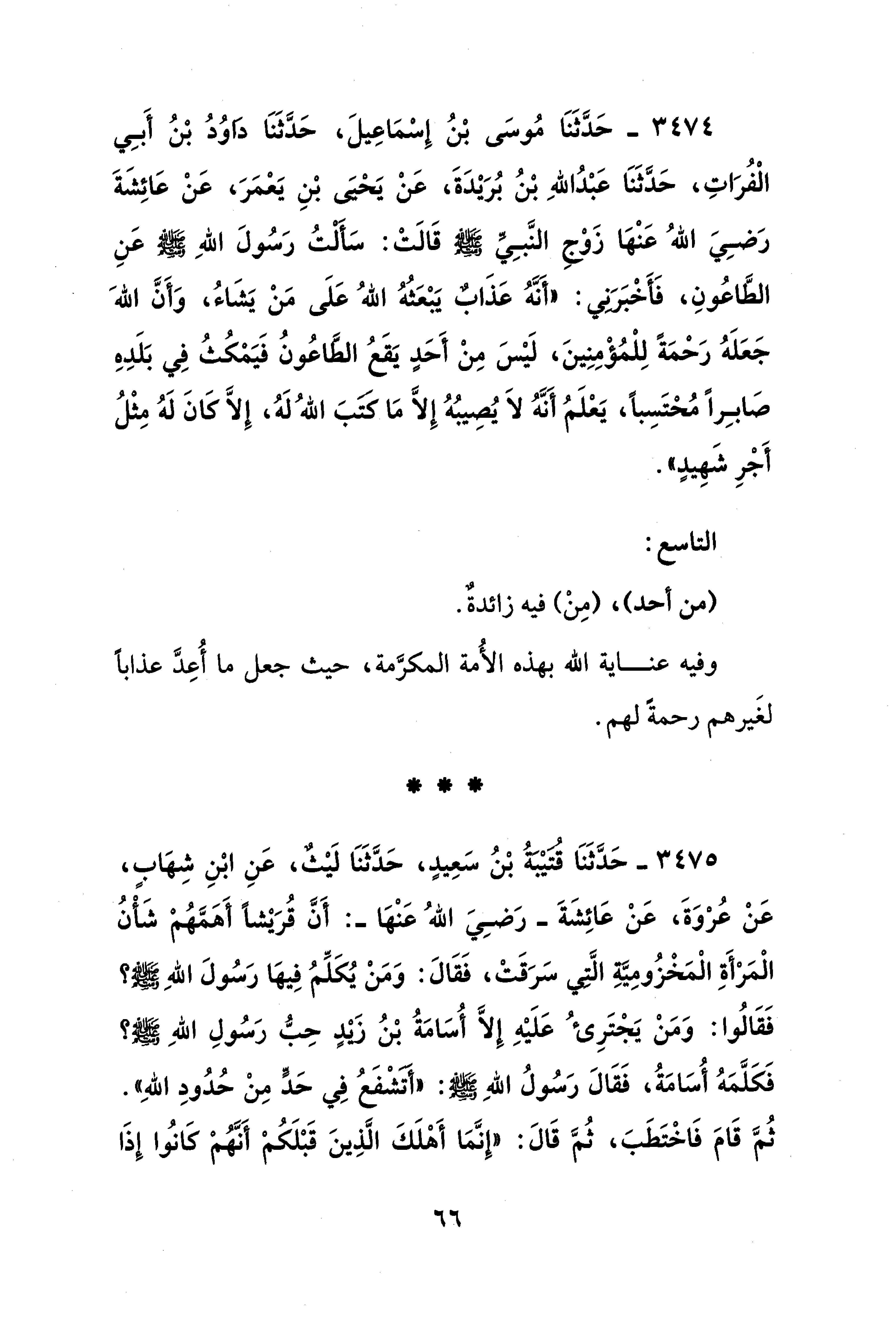 3475 - حَدَّثَنَا قُتَيْبَةُ بْنُ سَعِيدٍ، حَدَّثَنَا لَيْثٌ، عَنِ ابْنِ شِهَابٍ، عَنْ عُرْوَةَ، عَنْ عَائِشَةَ -رَضِيَ اللهُ عَنْهَا-: أَنَّ قُرَيْشًا أَهَمَّهُمْ شَأْنُ الْمَرْأَةِ الْمَخْزُومِيَّةِ الَّتِي سَرَقَتْ، فَقَالَ: وَمَنْ يُكَلِّمُ فِيهَا رَسُولَ اللهِ - صلى الله عليه وسلم -؟ فَقَالُوا: وَمَنْ يَجْتَرِئُ عَلَيْهِ إِلَّا أُسَامَةُ بْنُ زَيْدٍ حِبُّ رَسُولِ اللهِ - صلى الله عليه وسلم -؟ فَكَلَّمَهُ أُسَامَةُ، فَقَالَ رَسُولُ اللهِ - صلى الله عليه وسلم -: "أتشْفَعُ فِي حَدٍّ مِنْ حُدُودِ اللهِ". ثُمَّ قَامَ فَاخْتَطَبَ، ثُمَّ قَالَ: "إِنَّمَا أَهْلَكَ الَّذِينَ قَبْلَكُمْ أَنَّهُمْ كَانُوا إِذَا