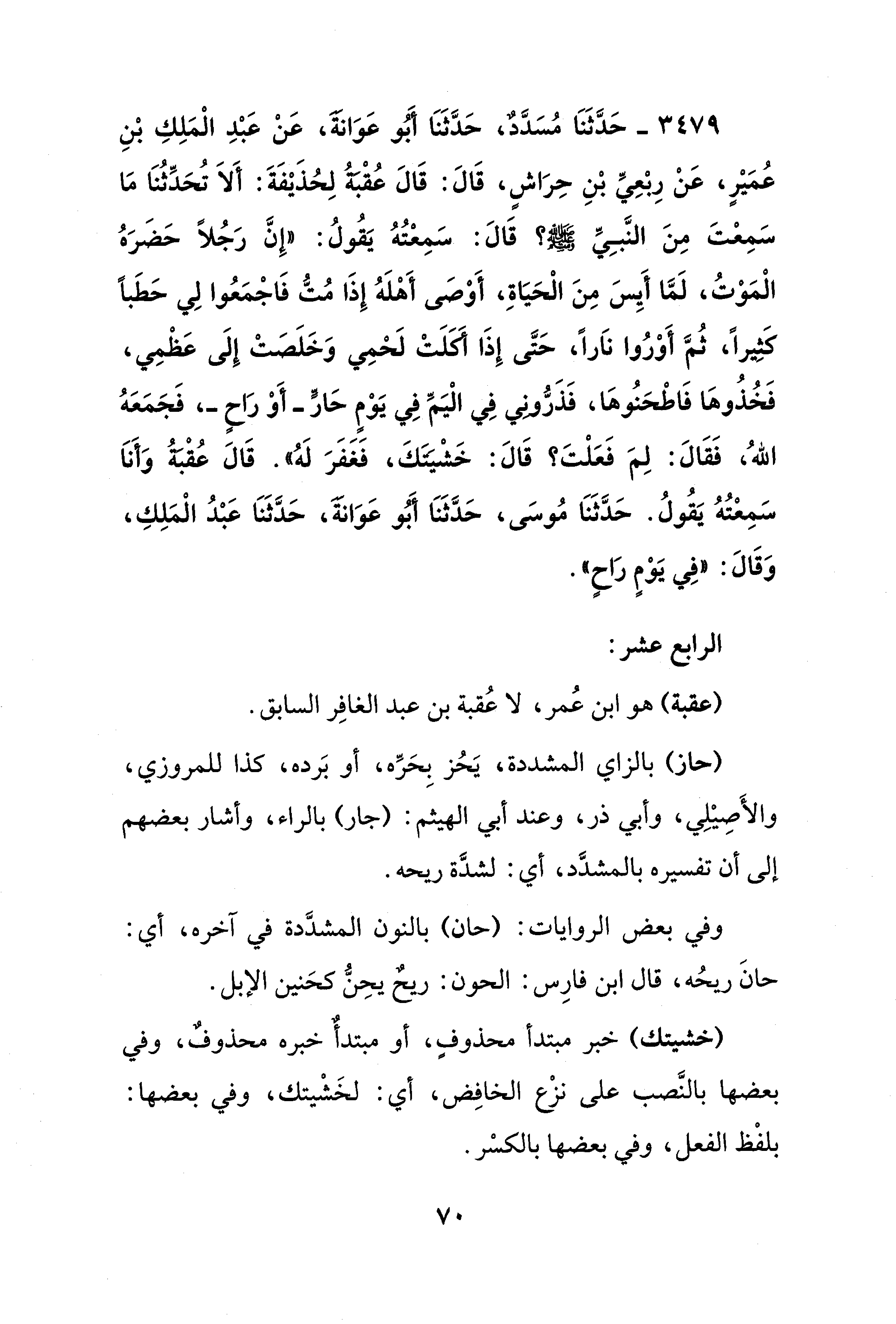 3479 - حَدَّثَنَا مُسَدَّدٌ، حَدَّثَنَا أَبُو عَوَانَةَ، عَنْ عَبْدِ الْمَلِكِ بْنِ عُمَيْرٍ، عَنْ رِبْعِيِّ بْنِ حِرَاشٍ، قَالَ: قَالَ عُقْبَةُ لِحُذَيْفَةَ: أَلاَ تُحَدِّثُنَا مَا سَمِعْتَ مِنَ النَّبِيِّ - صلى الله عليه وسلم -؟ قَالَ: سَمِعْتُهُ يَقُولُ: "إِنَّ رَجُلًا حَضَرَهُ الْمَوْتُ، لَمَّا أَيِسَ مِنَ الْحَيَاةِ، أَوْصَى أَهْلَهُ إِذَا مُتُّ فَاجْمَعُوا لِي حَطَبًا كَثِيرًا، ثُمَّ أَوْرُوا نَارًا، حَتَّى إِذَا أكَلَتْ لَحْمِي وَخَلَصَتْ إِلَى عَظْمِي، فَخُذُوهَا فَاطْحَنُوهَا، فَذَرُّونِي فِي الْيَمِّ فِي يَوْمٍ حَارٍّ -أَوْ رَاحٍ-، فَجَمَعَهُ اللهُ، فَقَالَ: لِمَ فَعَلْتَ؟ قَالَ: خَشْيَتَكَ، فَغَفَرَ لَهُ". قَالَ عُقْبَةُ وَأَنَا سَمِعْتُهُ يَقُولُ. حَدَّثَنَا مُوسَى، حَدَّثَنَا أَبُو عَوَانَةَ، حَدَّثَنَا عَبْدُ الْمَلِكِ، وَقَالَ: "فِي يَوْمٍ رَاحٍ".