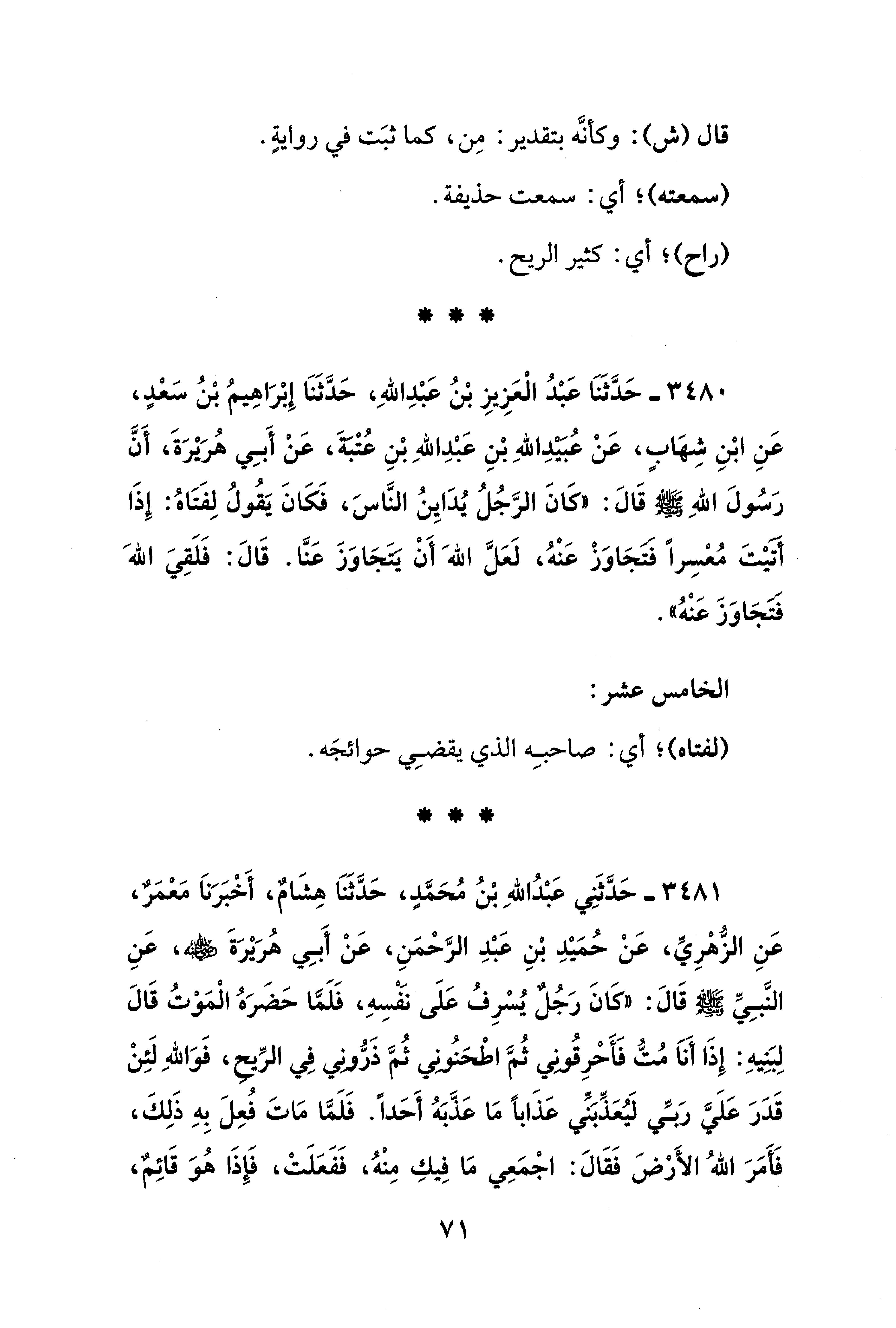3480 - حَدَّثَنَا عَبْدُ الْعَزِيزِ بْنُ عَبْدِ اللهِ، حَدَّثَنَا إِبْرَاهِيمُ بْنُ سَعْدٍ، عَنِ ابْنِ شِهَابٍ، عَنْ عُبَيْدِ اللهِ بْنِ عَبْدِ اللهِ بْنِ عُتْبَةَ، عَنْ أَبِي هُرَيْرَةَ، أَنَّ رَسُولَ اللهِ - صلى الله عليه وسلم - قَالَ: "كَانَ الرَّجُلُ يُدَايِنُ النَّاسَ، فَكَانَ يَقُولُ لِفَتَاهُ: إِذَا أَتَيْتَ مُعْسِرًا فَتَجَاوَزْ عَنْهُ، لَعَلَّ اللهَ أَنْ يَتَجَاوَزَ عَنَّا. قَالَ: فَلَقِيَ اللهَ فتجَاوَزَ عَنْهُ".