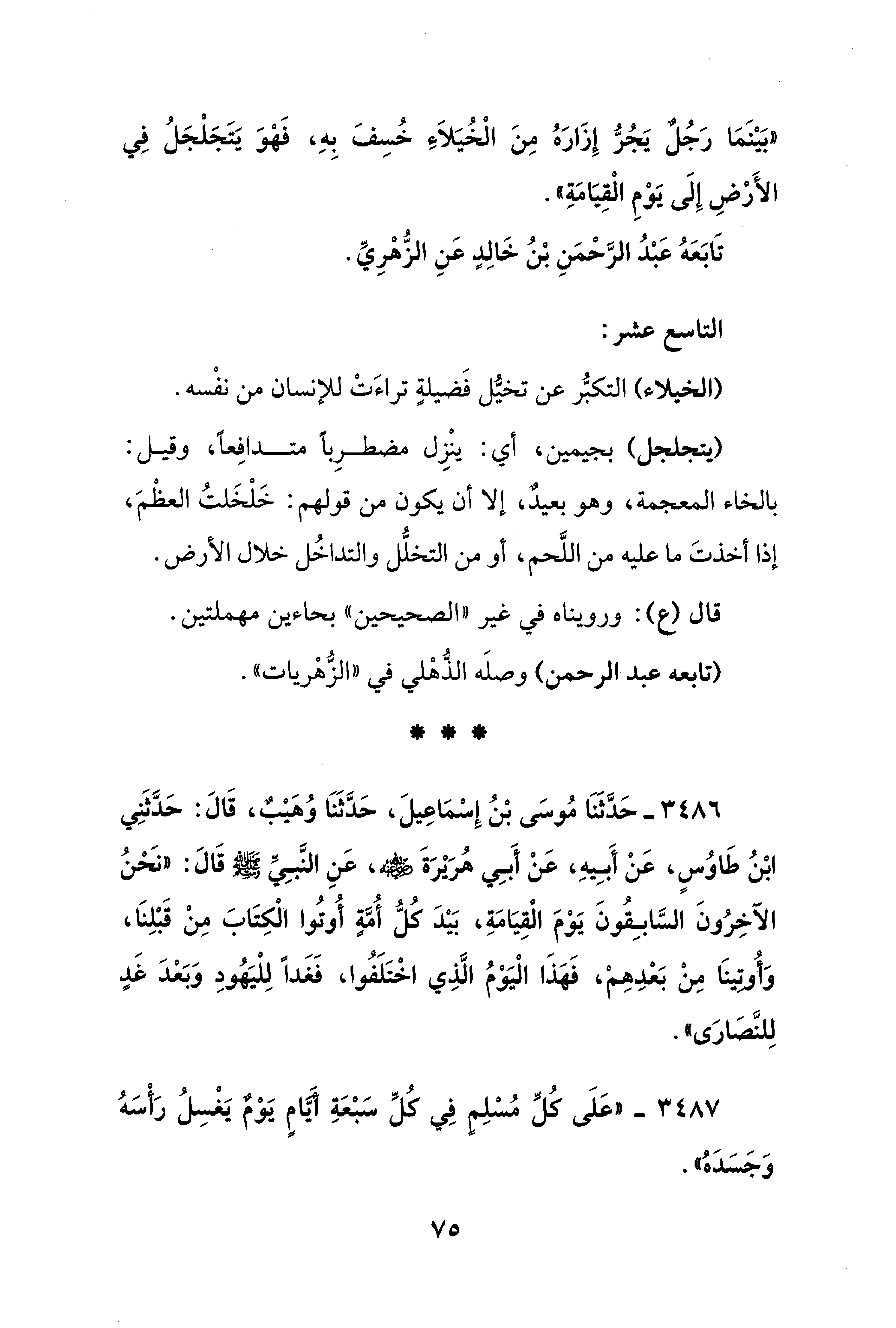 3486 - حَدَّثَنَا مُوسَى بْنُ إِسْمَاعِيلَ، حَدَّثَنَا وُهَيْبٌ، قَالَ: حَدَّثَنِي ابْنُ طَاوُسٍ، عَنْ أَبِيهِ، عَنْ أَبِي هُرَيْرَةَ - رضي الله عنه -، عَنِ النَّبِيِّ - صلى الله عليه وسلم - قَالَ: "نَحْنُ الآخِرُونَ السَّابِقُونَ يَوْمَ الْقِيَامَةِ، بَيْدَ كُلُّ أُمَّةٍ أُوتُوا الْكِتَابَ مِنْ قَبْلِنَا، وَأُوتينَا مِنْ بَعْدِهِمْ، فَهَذَا الْيَوْمُ الَّذِي اخْتَلَفُوا، فَغَدًا لِلْيَهُودِ وَبَعْدَ غَدٍ لِلنَّصَارَى".