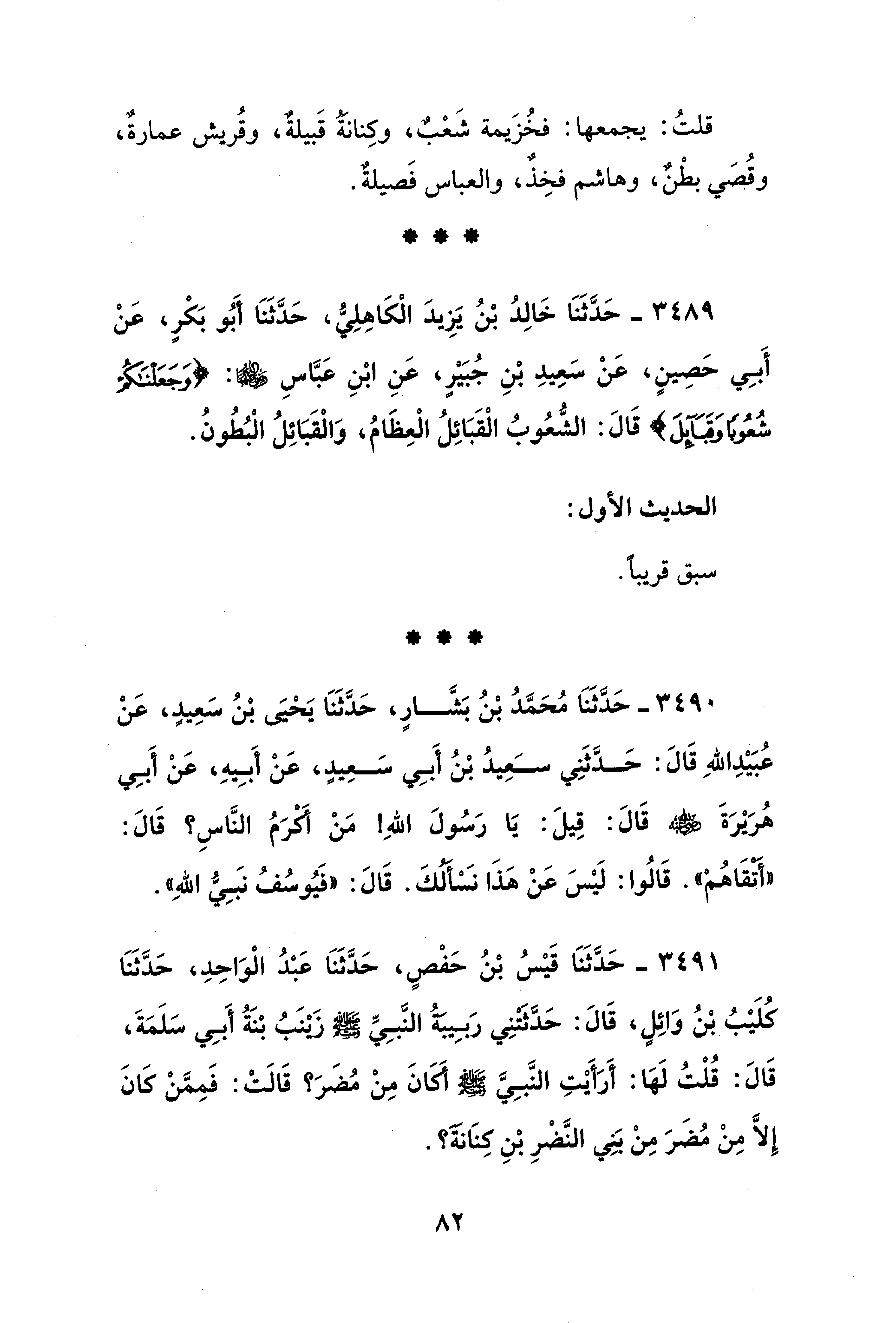 3489 - حَدَّثَنَا خَالِدُ بْنُ يَزِيدَ الْكَاهِلِيُّ، حَدَّثَنَا أَبُو بَكْرٍ، عَنْ أَبِي حَصِينٍ، عَنْ سَعِيدِ بْنِ جُبَيْرٍ، عَنِ ابْنِ عَبَّاسِ - رضي الله عنهما -: {وَجَعَلْنَاكُمْ شُعُوبًا وَقَبَائِلَ} قَالَ: الشُّعُوبُ الْقَبَائِلُ الْعِظَامُ، وَالْقَبَائِلُ الْبُطُونُ.
