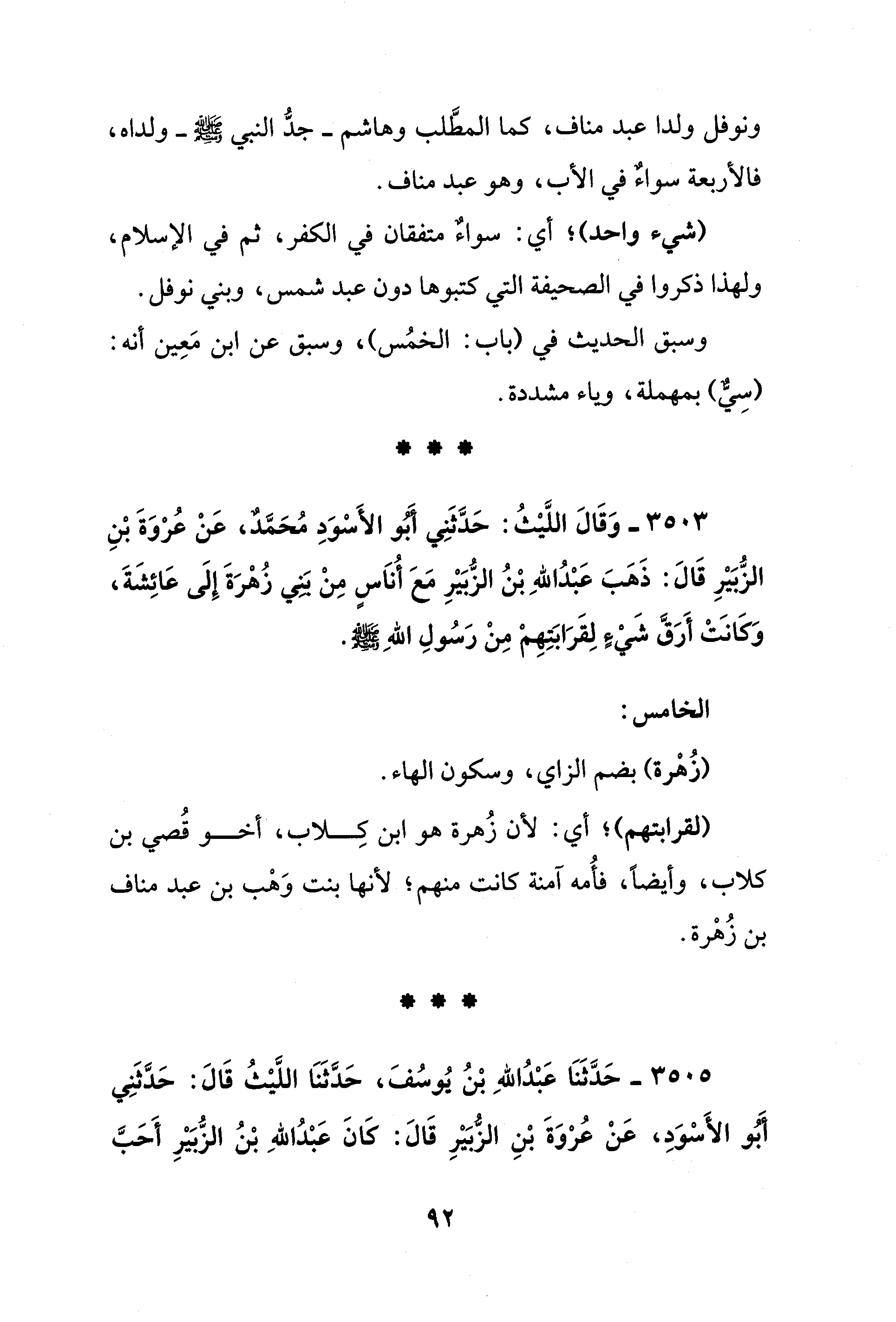 3503 - وَقَالَ اللَّيْثُ: حَدَّثَنِي أَبُو الأَسْوَدِ مُحَمَّدٌ، عَنْ عُرْوَةَ بْنِ الزُّبَيْرِ قَالَ: ذَهَبَ عَبْدُ اللهِ بْنُ الزُّبَيْرِ مَعَ أُنَاسٍ مِنْ بَنِي زُهْرَةَ إِلَى عَائِشَةَ، وَكَانَتْ أَرَقَّ شَيْءٍ لِقَرَابَتِهِمْ مِنْ رَسُولِ اللهِ - صلى الله عليه وسلم -.