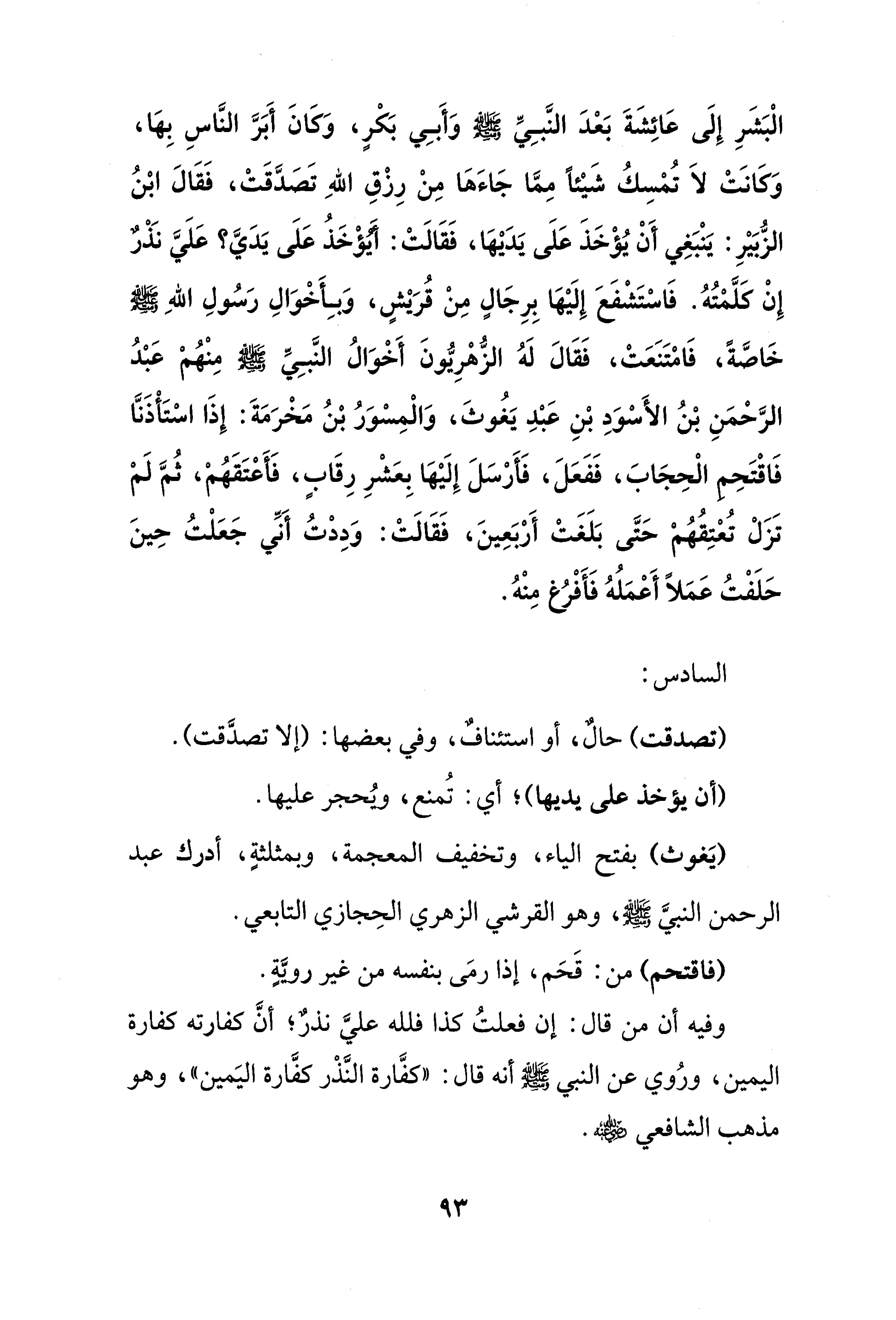 الْبَشَرِ إِلَى عَائِشَةَ بَعْدَ النَّبِيِّ - صلى الله عليه وسلم - وَأَبِي بَكْرٍ، وَكَانَ أَبَرَّ النَّاسِ بِهَا، وَكَانَتْ لاَ تُمْسِكُ شَيْئًا مِمَّا جَاءَهَا مِنْ رِزْقِ اللهِ تَصَدَّقَتْ، فَقَالَ ابْنُ الزُّبَيْرِ: يَنْبَغِي أَنْ يُؤْخَذَ عَلَى يَدَيْهَا، فَقَالَتْ: أَيُؤْخَذُ عَلَى يَدَيَّ؟ عَلَيَّ نَذْزٌ إِنْ كَلَّمْتُهُ. فَاسْتَشْفَعَ إِلَيْهَا بِرِجَالٍ مِنْ قُرَيْشٍ، وَبِأَخْوَالِ رَسُولِ اللهِ - صلى الله عليه وسلم - خَاصَّةً، فَامْتَنَعَتْ، فَقَالَ لَهُ الزُّهْرِيُّونَ أَخْوَالُ النَّبِيِّ - صلى الله عليه وسلم - مِنْهُمْ عَبْدُ الرَّحْمَنِ بْنُ الأَسْوَدِ بْنِ عَبْدِ يَغُوثَ، وَالْمِسْوَرُ بْنُ مَخْرَمَةَ: إِذَا اسْتَأْذَنَّا فَاقْتَحِم الْحِجَابَ، فَفَعَلَ، فَأَرْسَلَ إِلَيْهَا بِعَشْرِ رِقَابٍ، فَأَعْتَقَهُمْ، ثُمَّ لَمْ تَزَلْ تُعْتِقُهُمْ حَتَّى بَلَغَتْ أَرْبَعِينَ، فَقَالَتْ: وَدِدْتُ أَنِّي جَعَلْتُ حِينَ حَلَفْتُ عَمَلًا أَعْمَلُهُ فَأَفْرُغ مِنْهُ.