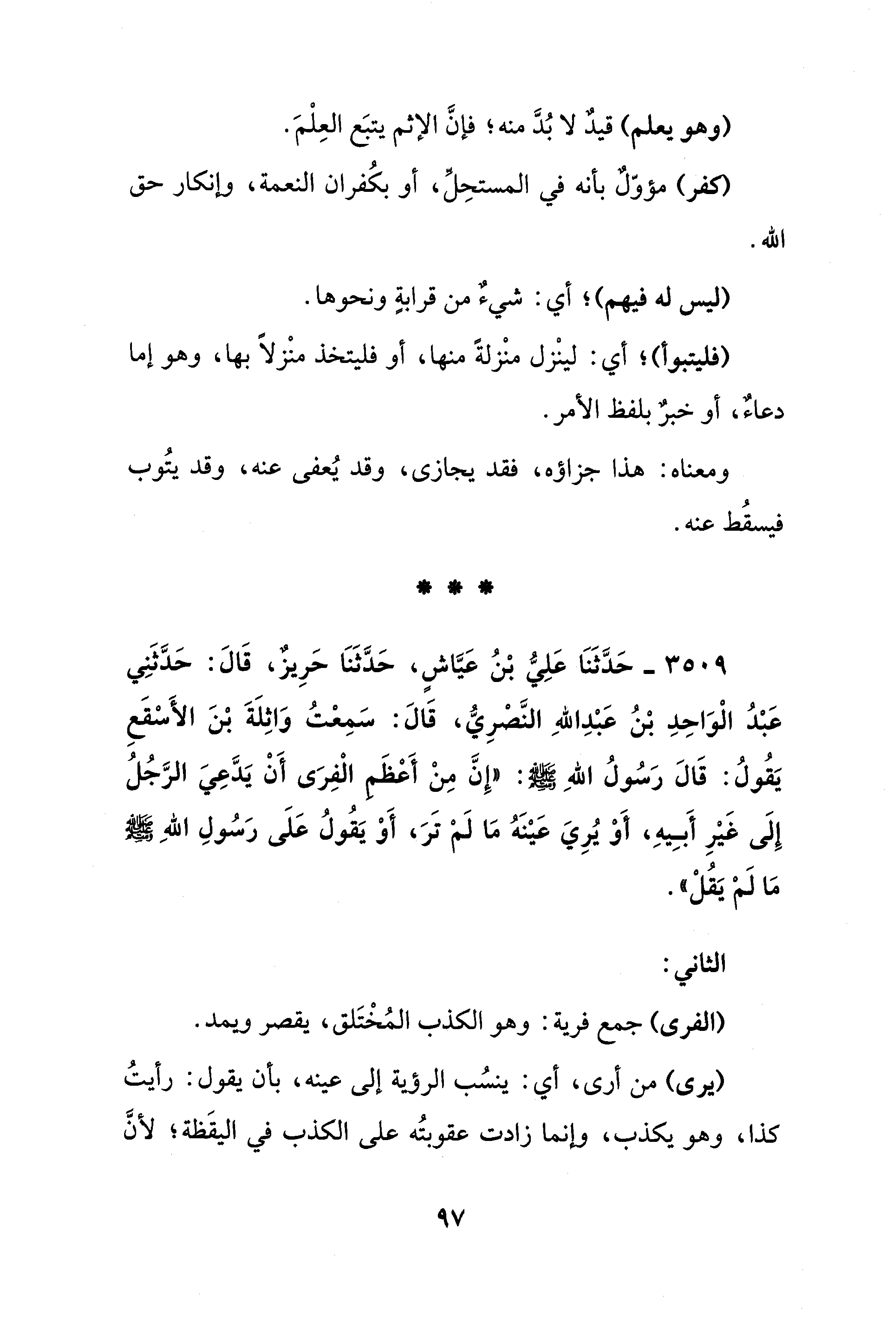 3509 - حَدَّثَنَا عَلِيُّ بْنُ عَيَّاشٍ، حَدَّثَنَا حَرِيزٌ، قَالَ: حَدَّثَنِي عَبْدُ الْوَاحِدِ بْنُ عَبْدِ اللهِ النَّصْرِيُّ، قَالَ: سَمِعْتُ وَاثِلَةَ بْنَ الأَسْقَعِ يَقُولُ: قَالَ رَسُولُ اللهِ - صلى الله عليه وسلم -: "إِنَّ مِنْ أَعْظَمِ الْفِرَى أَنْ يَدَّعِيَ الرَّجُلُ إِلَى غَيْرِ أَبِيهِ، أَوْ يُرِيَ عَيْنَهُ مَا لَمْ تَرَ، أَوْ يَقُولُ عَلَى رَسُولِ اللهِ - صلى الله عليه وسلم - مَا لَمْ يَقُلْ".