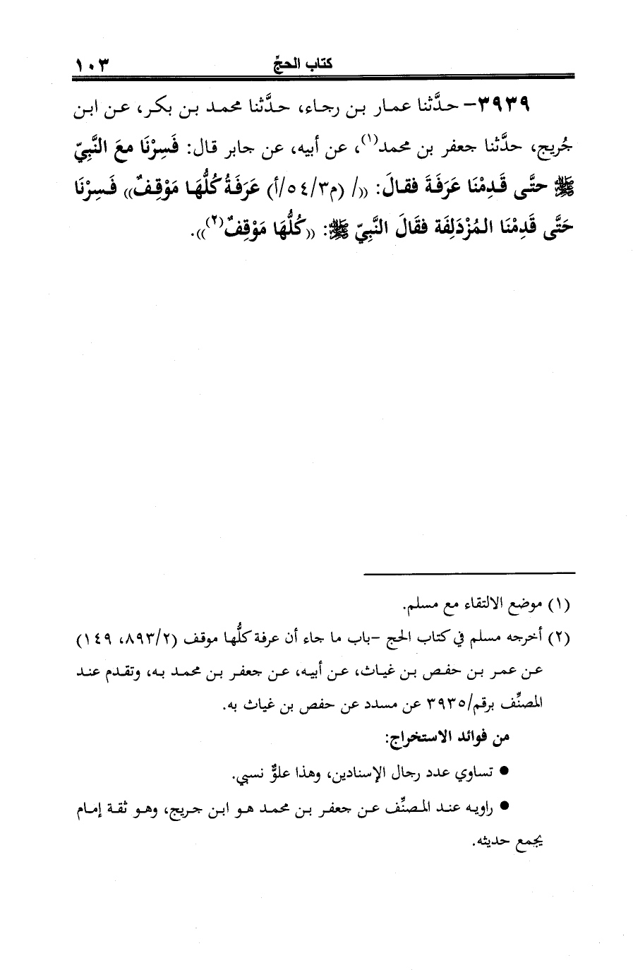 3939 - حدَّثنا عمار بن رجاء، حدَّثنا محمد بن بكر، عن ابن جُريج، حدَّثنا جعفر بن محمد (¬1)، عن أبيه، عن جابر قال: فَسِرْنَا معَ النَّبِيّ -صلى الله عليه وسلم- حتَّى قَدِمْنَا عَرَفَةَ فقالَ: عَرَفَةُ كُلُّهاَ مَوْقِفٌ" فَسِرْنَا حَتَّى قَدِمْنَا المُزْدَلِفَة فقَالَ النَّبِيّ -صلى الله عليه وسلم-: "كُلُّهَا مَوْقِفٌ (¬2) ".