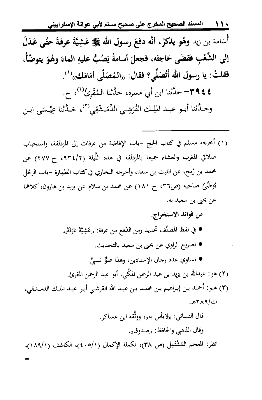 -[111]- زُغْبَة (¬3)، قالا: حدَّثنا اللَّيثُ (¬4)، قال: حدثني يحيى بن سعيد، عن موسى ابن عقبة، عن كُريبٍ مولى ابن عبَّاس، عن أُسامةَ بن زيدٍ قال: بالَ رسول الله -صلى الله عليه وسلم- بعد الدَّفْعَةِ من عَرفاتٍ إلى بعض الشِّعابِ لِحَاجَتِه، فَصَبَبْتُ عليهِ مِن الماءِ ثُمَّ توضَّأ، فقلتُ: أتُصَلِّي؟ قال: "المُصَلَّى أمَامَك".