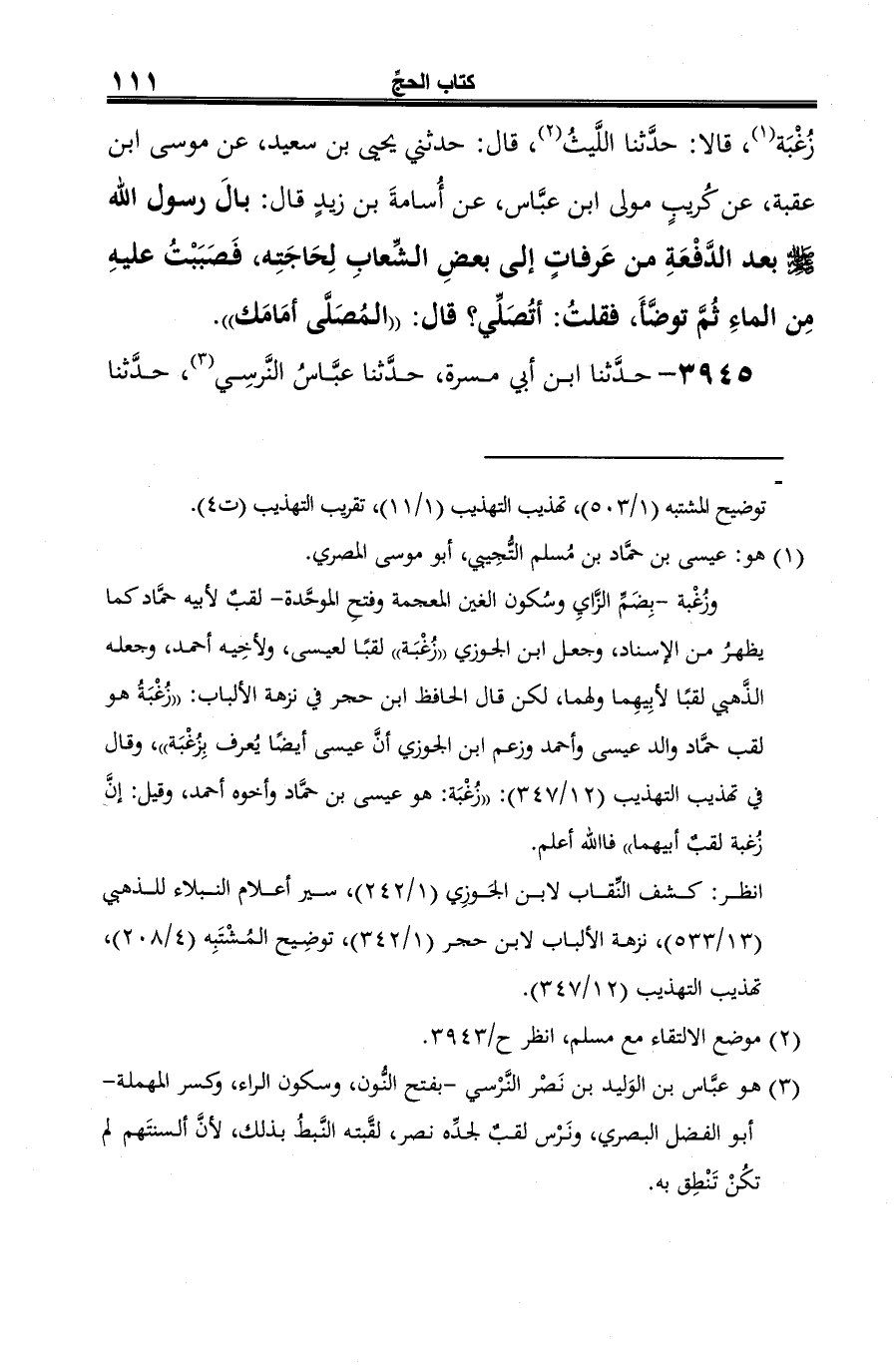 (¬3) أخرجه البخاري في كتاب الحج -باب النُّزول بين عرفةَ وجمْعٍ (ص 270، ح 1667) عن مُسدّد عن حمَّاد بن زيد به.