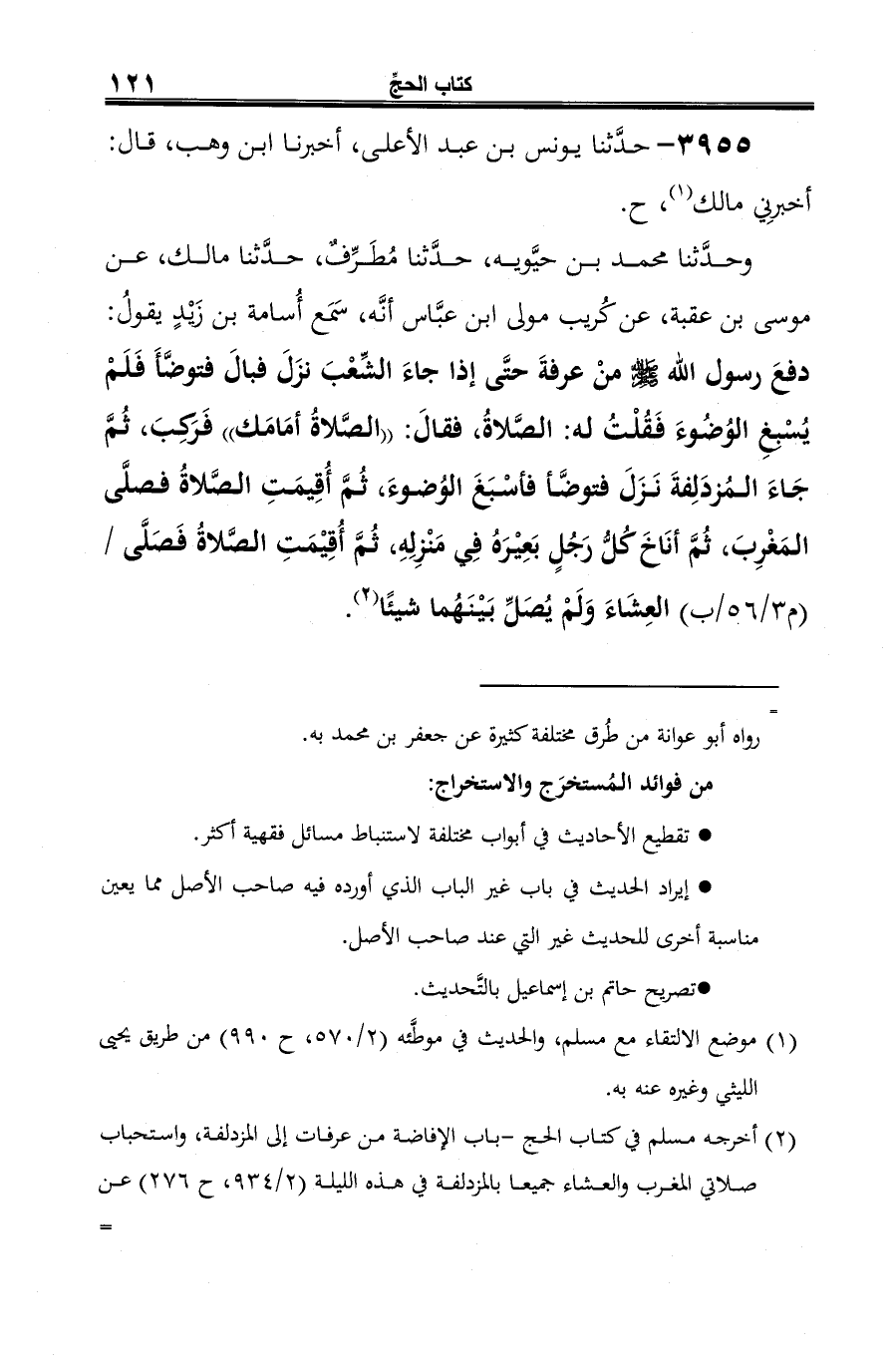 وحدَّثنا محمد بن حيَّويه، حدَّثنا مُطَرِّفٌ، حدَّثنا مالك، عن موسى بن عقبة، عن كُريب مولى ابن عبَّاس أنَّه، سَمَع أُسامة بن زَيْدٍ يقولُ: دفعَ رسول الله -صلى الله عليه وسلم- منْ عرفةَ حتَّى إذا جاءَ الشِّعْبَ نزَلَ فبالَ فتوضَّأَ فَلَمْ يُسْبغِ الوُضُوءَ فَقُلْتُ له: الصَّلاةُ، فقالَ: "الصَّلاةُ أمَامَك" فَرَكِبَ، ثُمَّ جَاءَ المُزدَلِفةَ نَزَلَ فتوضأ فأسْبَغَ الوُضوءَ، ثُمَّ أُقِيمَتِ الصَّلاةُ فصلَّى المَغْرِبَ، ثُمَّ أنَاخَ كُلُّ رَجُلٍ بَعِيْرَهُ في مَنْزِلِهِ، ثُمَّ أُقِيْمَتِ الصَّلاةُ فَصَلَّى العِشَاءَ وَلَمْ يُصَلِّ بَيْنَهُما شيئًا (¬2).